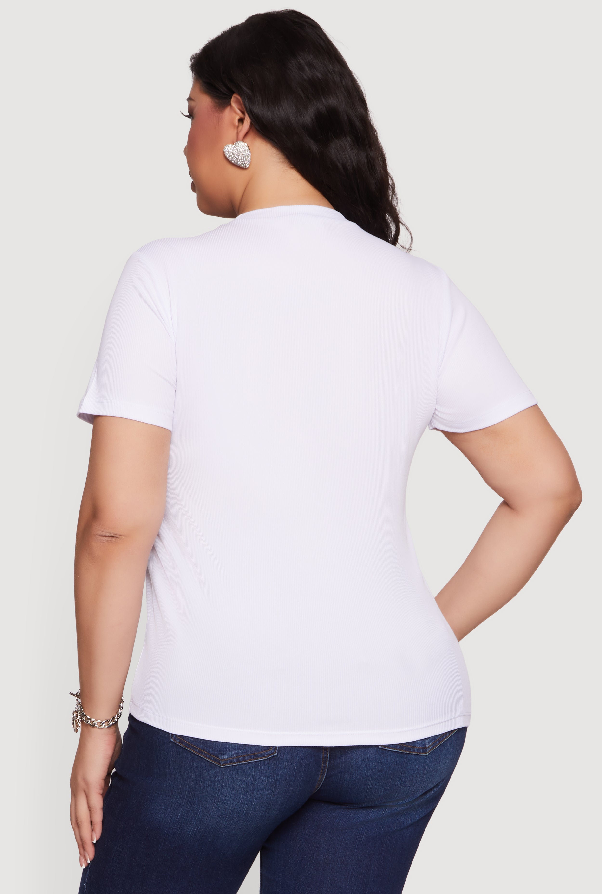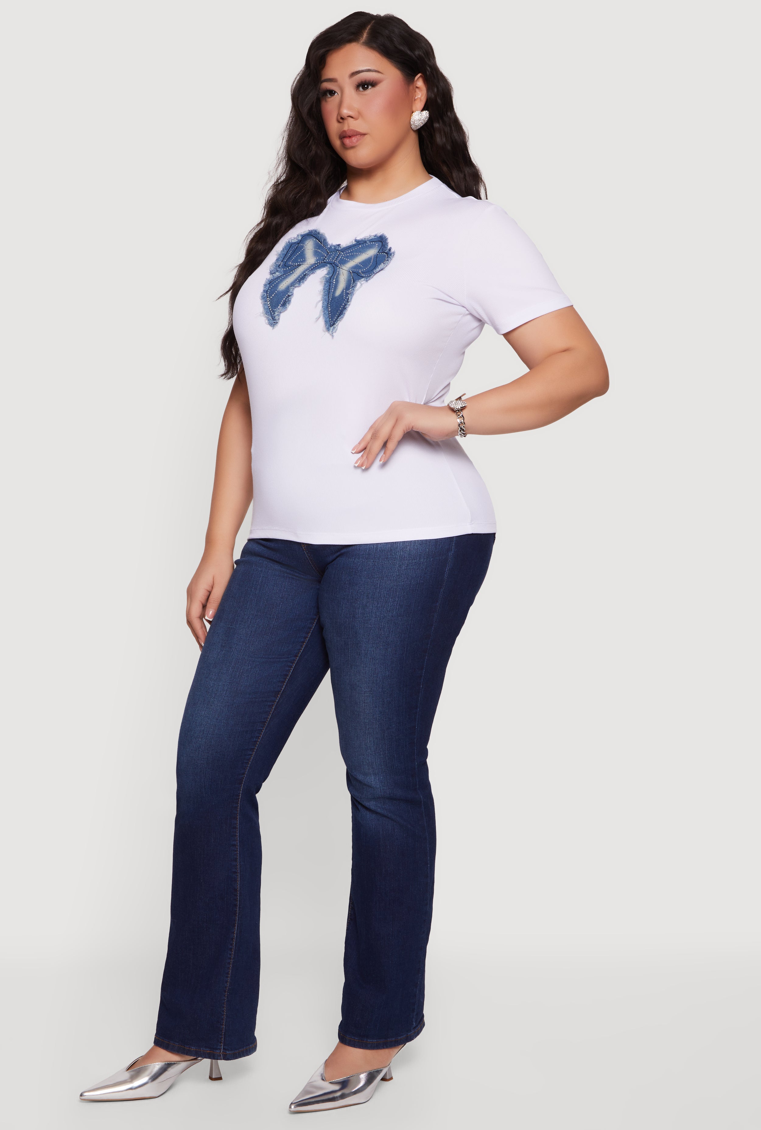 Plus Size Denim Bow Patch Rhinestone Detail Tee
