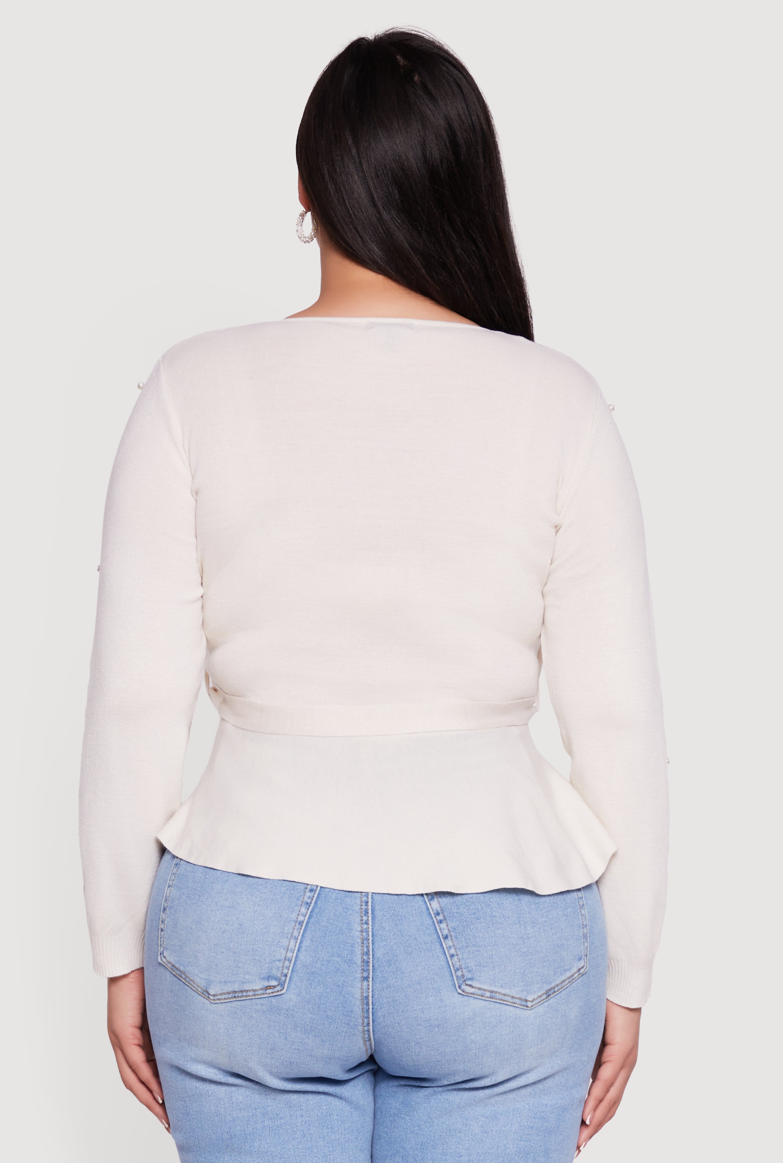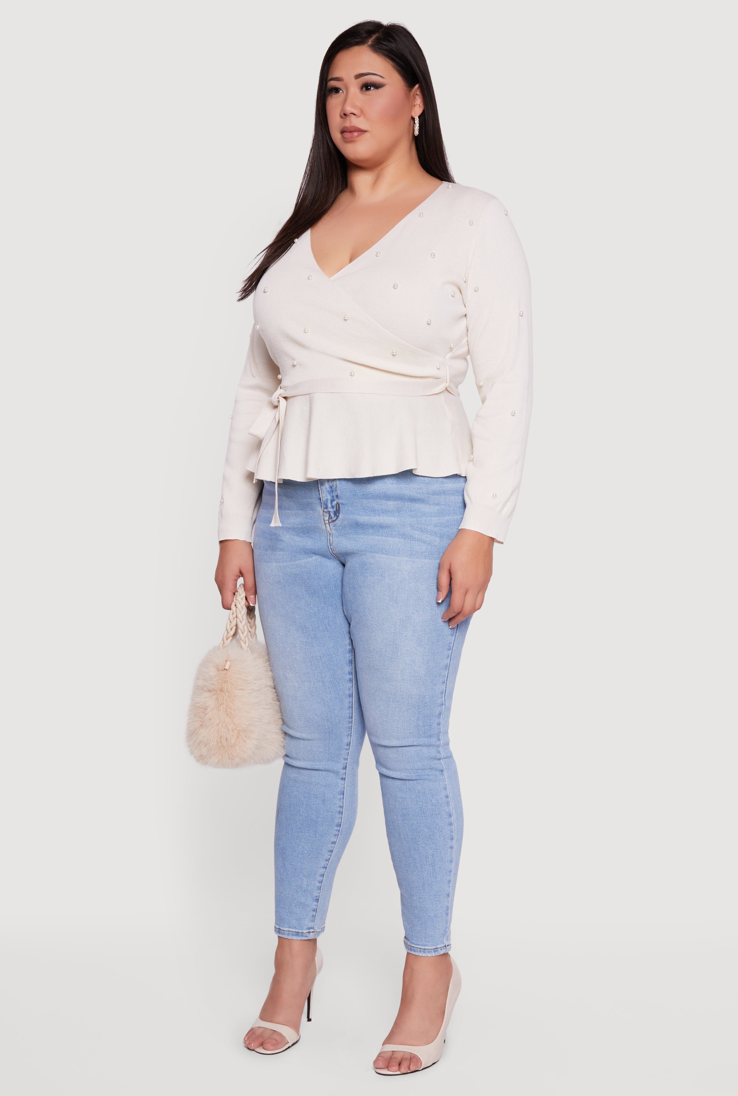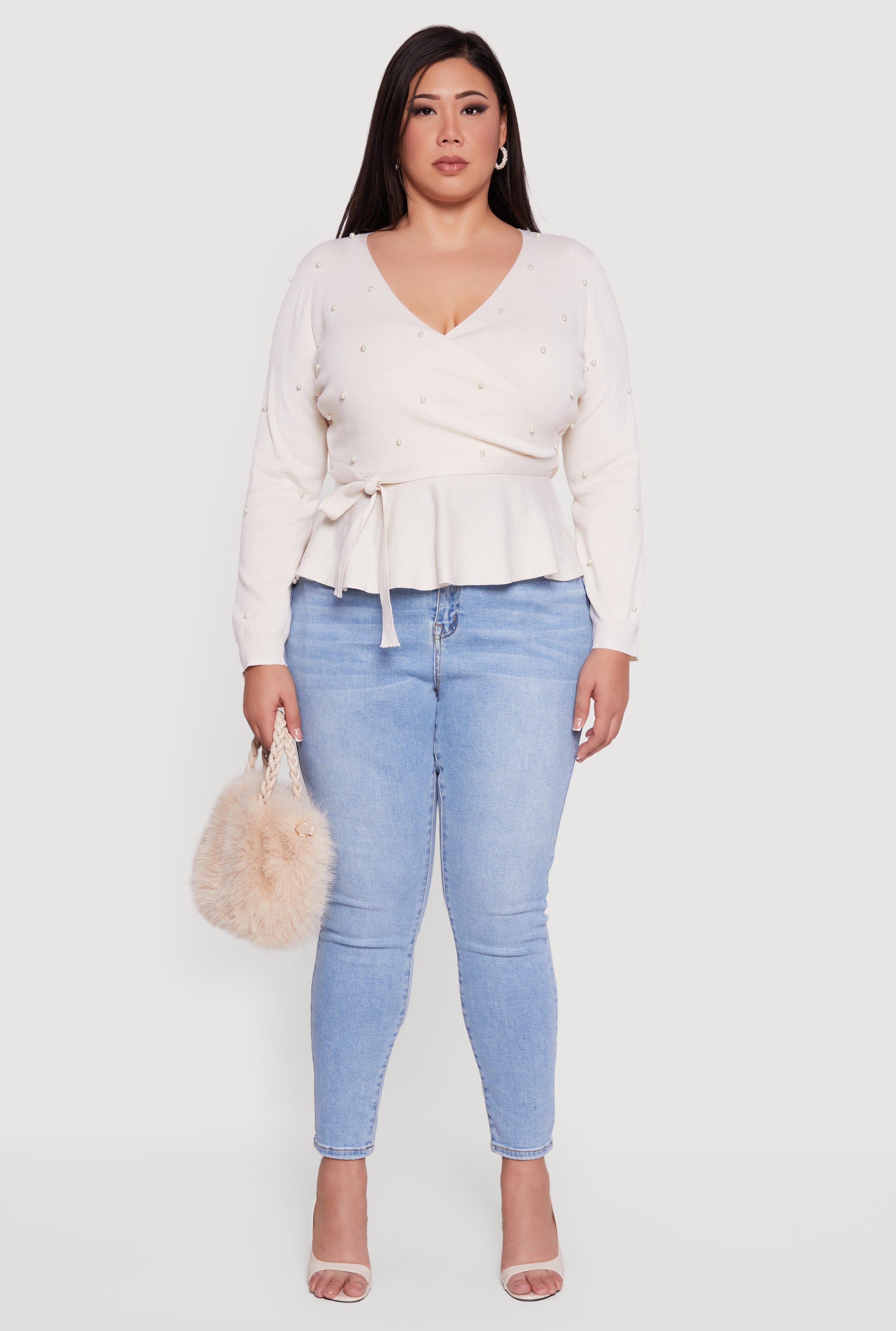 Plus Size Faux Pearl Faux Wrap Sweater with Tie Waist Belt