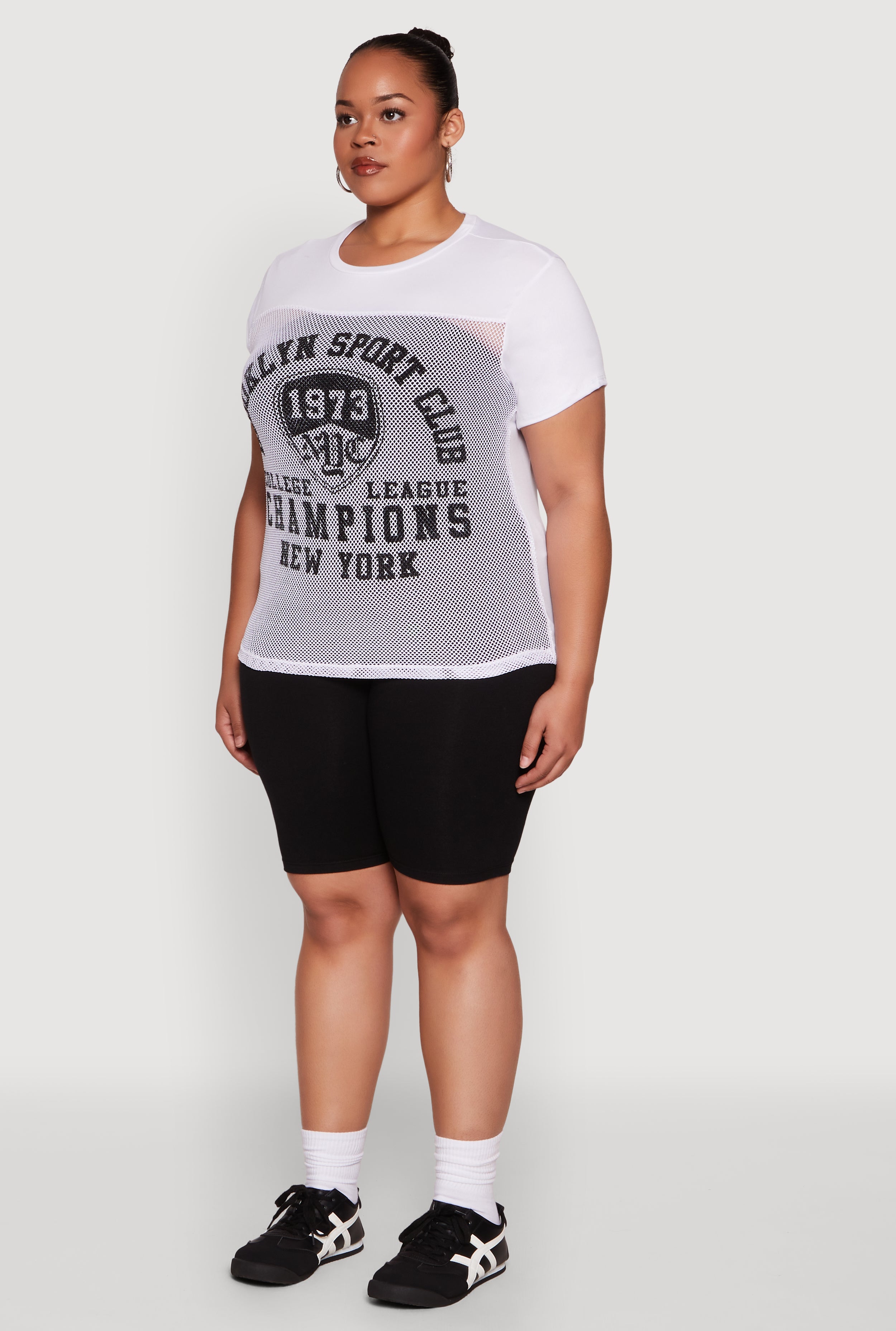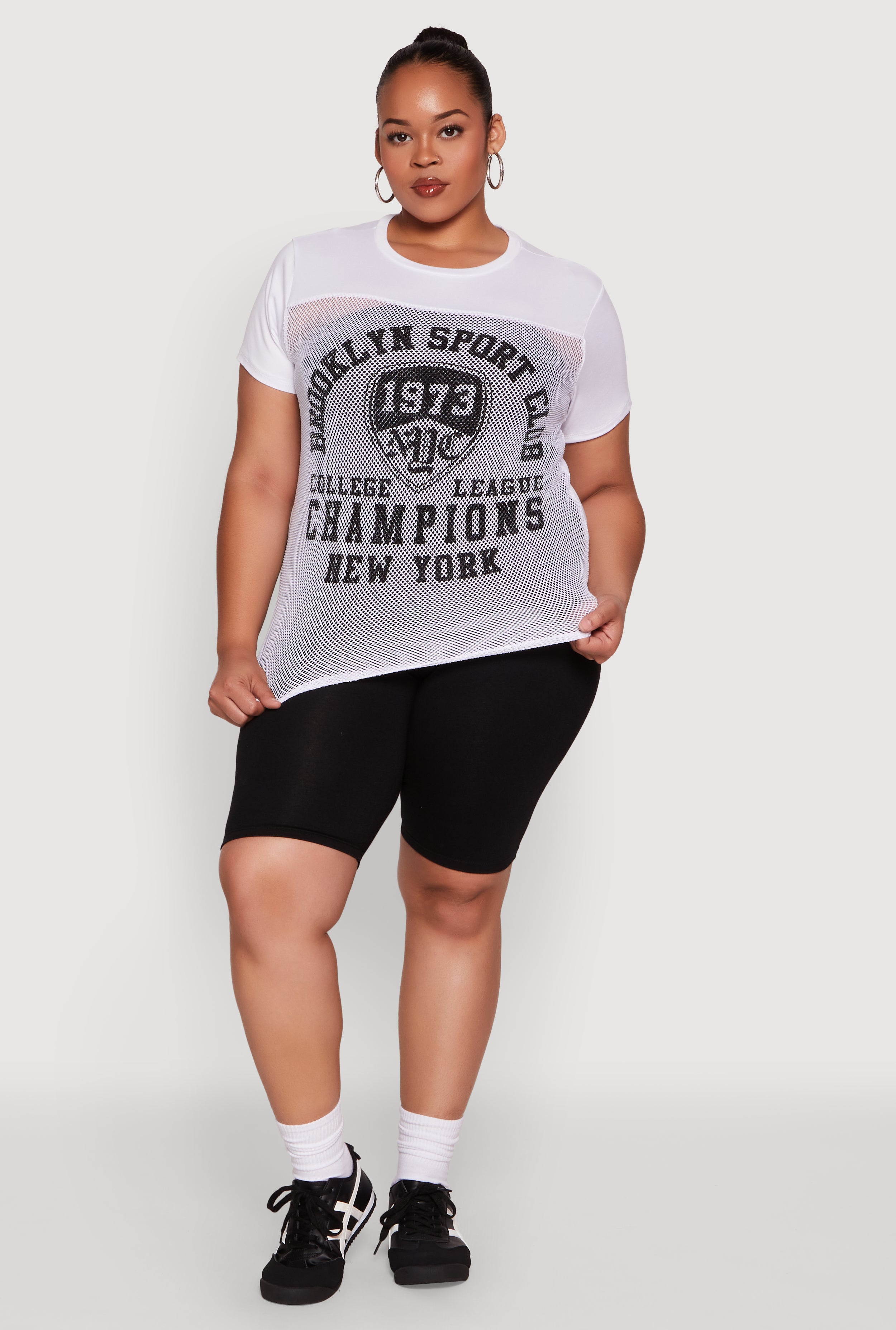 Step up your style game with the Plus Size Fishnet Detail Brooklyn Sport Club Top. Featuring a bold Brooklyn Sport Club graphic that pays homage to NYC's legendary college league champions, this classic fit t-shirt combines sporty vibes with a touch of edge. The short sleeves and crew neck make it perfect for everyday wear, while the sheer fishnet detail adds a daring twist that’s sure to turn heads. Whether you're out with friends or just want to feel confident and comfortable, this top is your new go-to staple for effortless cool.