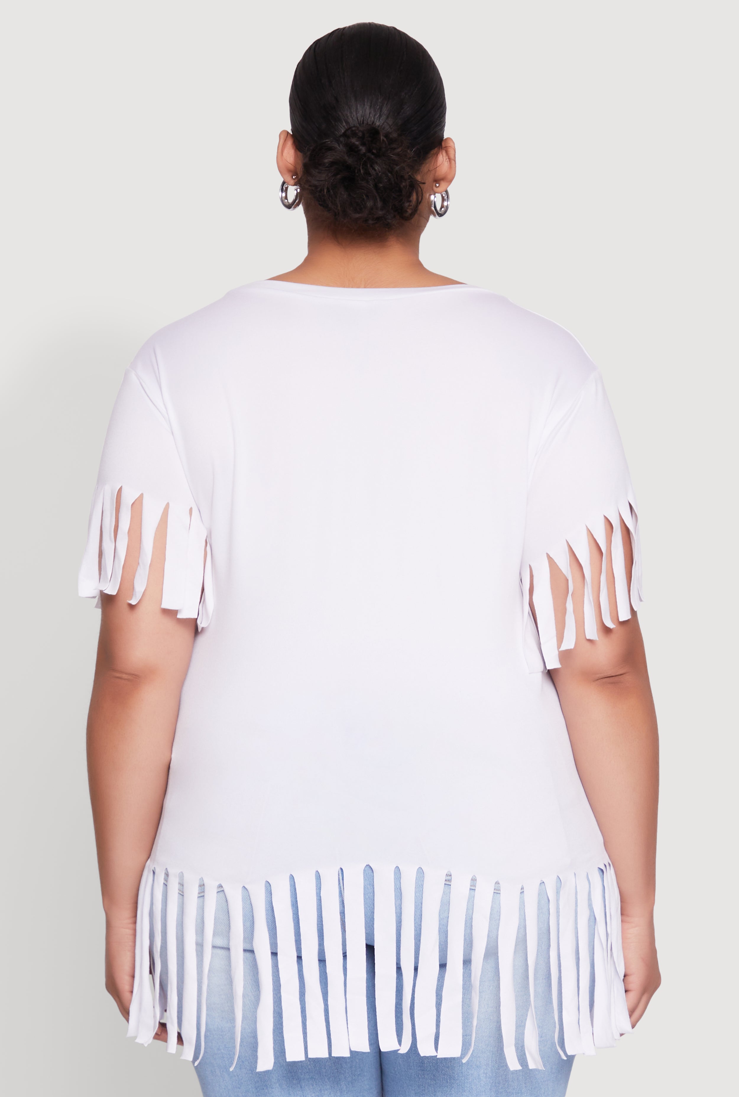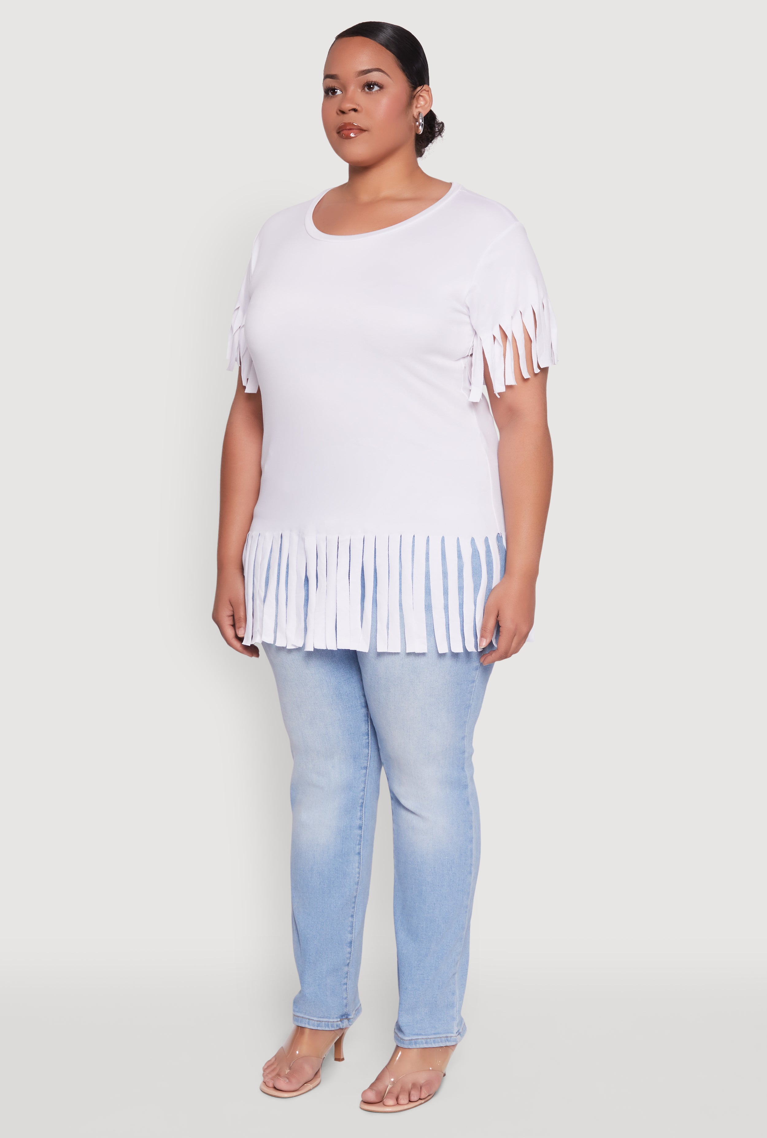 Upgrade your everyday look with our Plus Size Fringe Sleeve Hem Tee. This stylish and versatile top is perfect for adding a touch of fun to your wardrobe. Featuring playful fringe details on the sleeves and a classic crew neck, it offers a timeless silhouette that flatters every body type. Whether you're running errands or meeting friends for a casual hangout, this tee is your new go-to for effortless style and comfort.