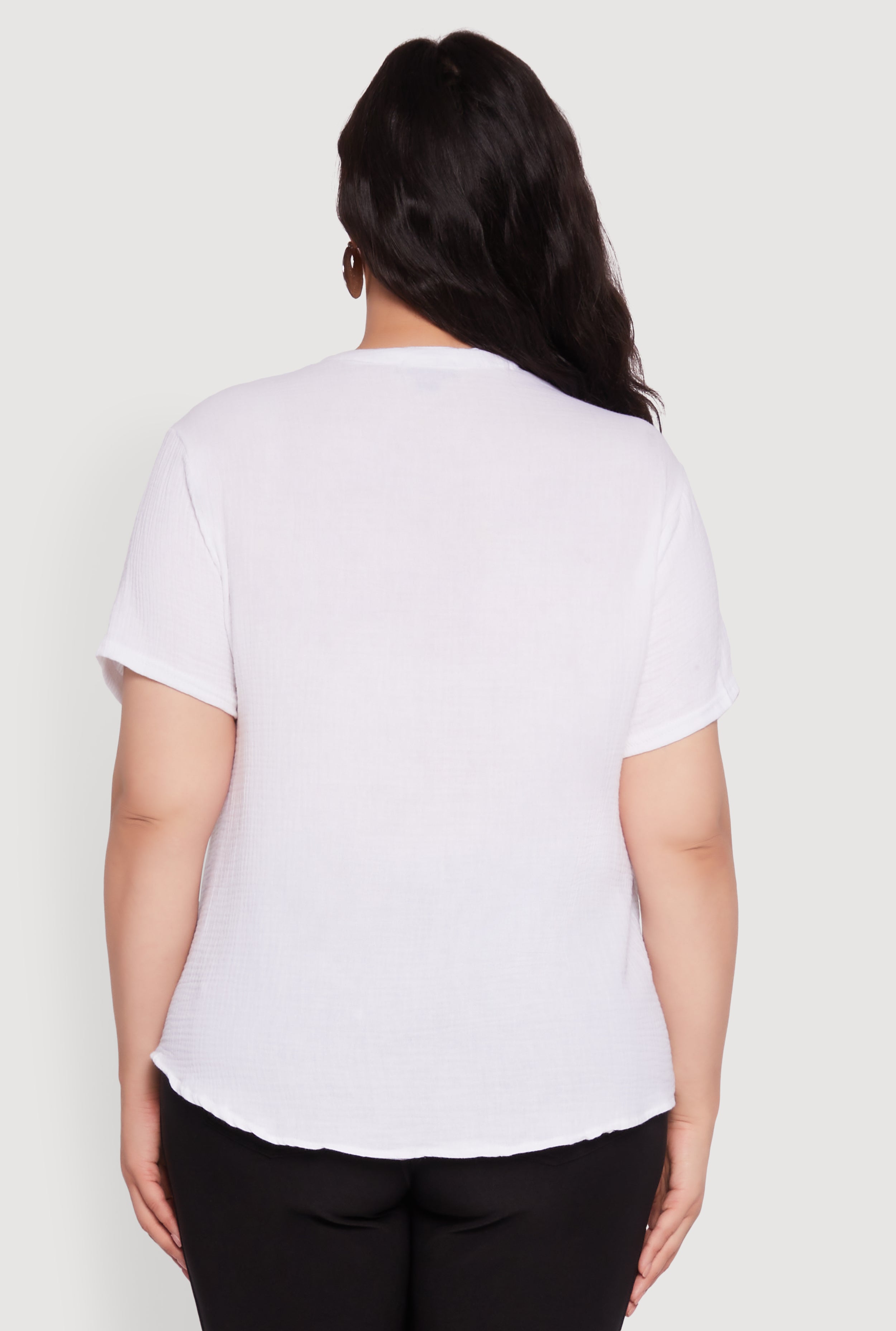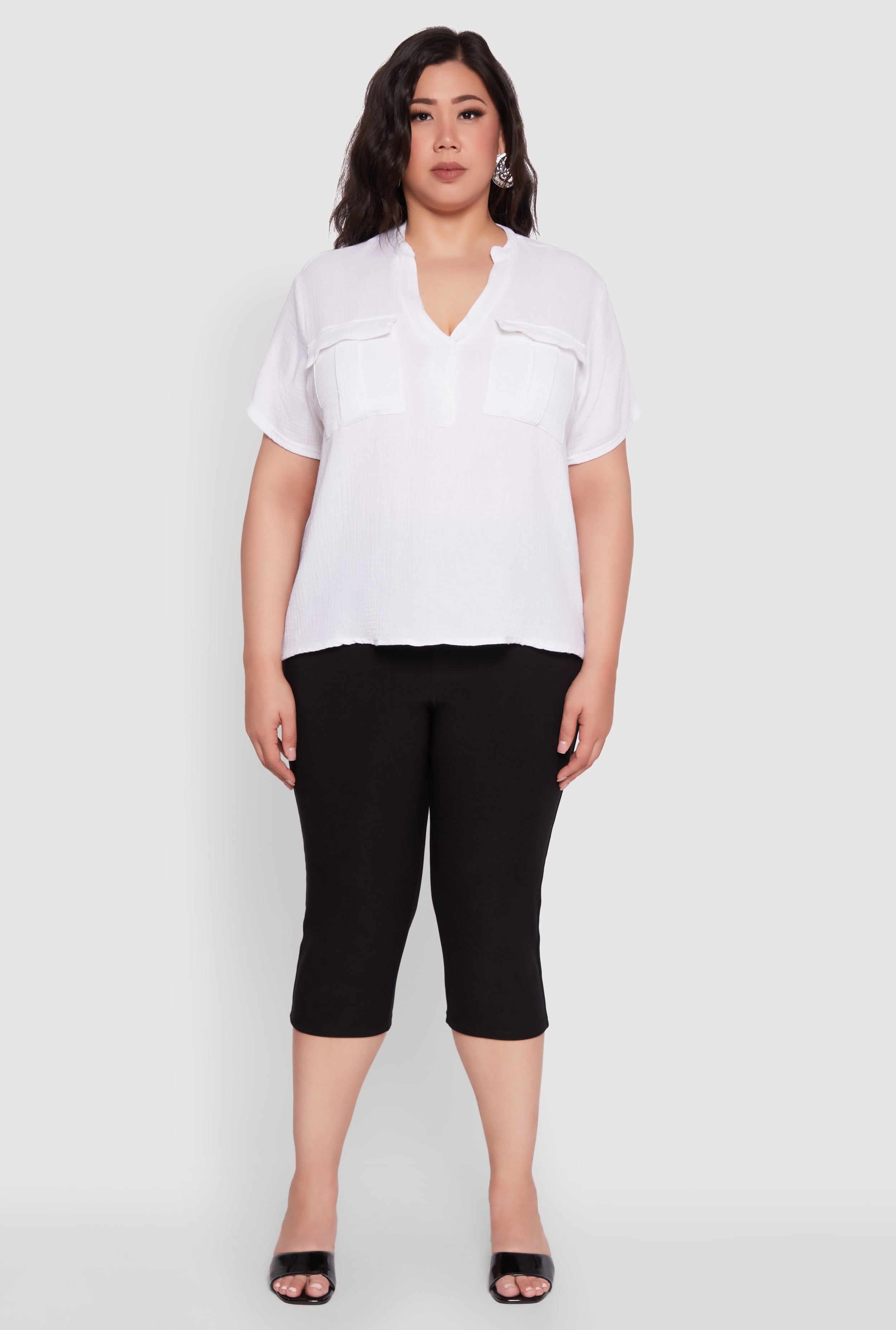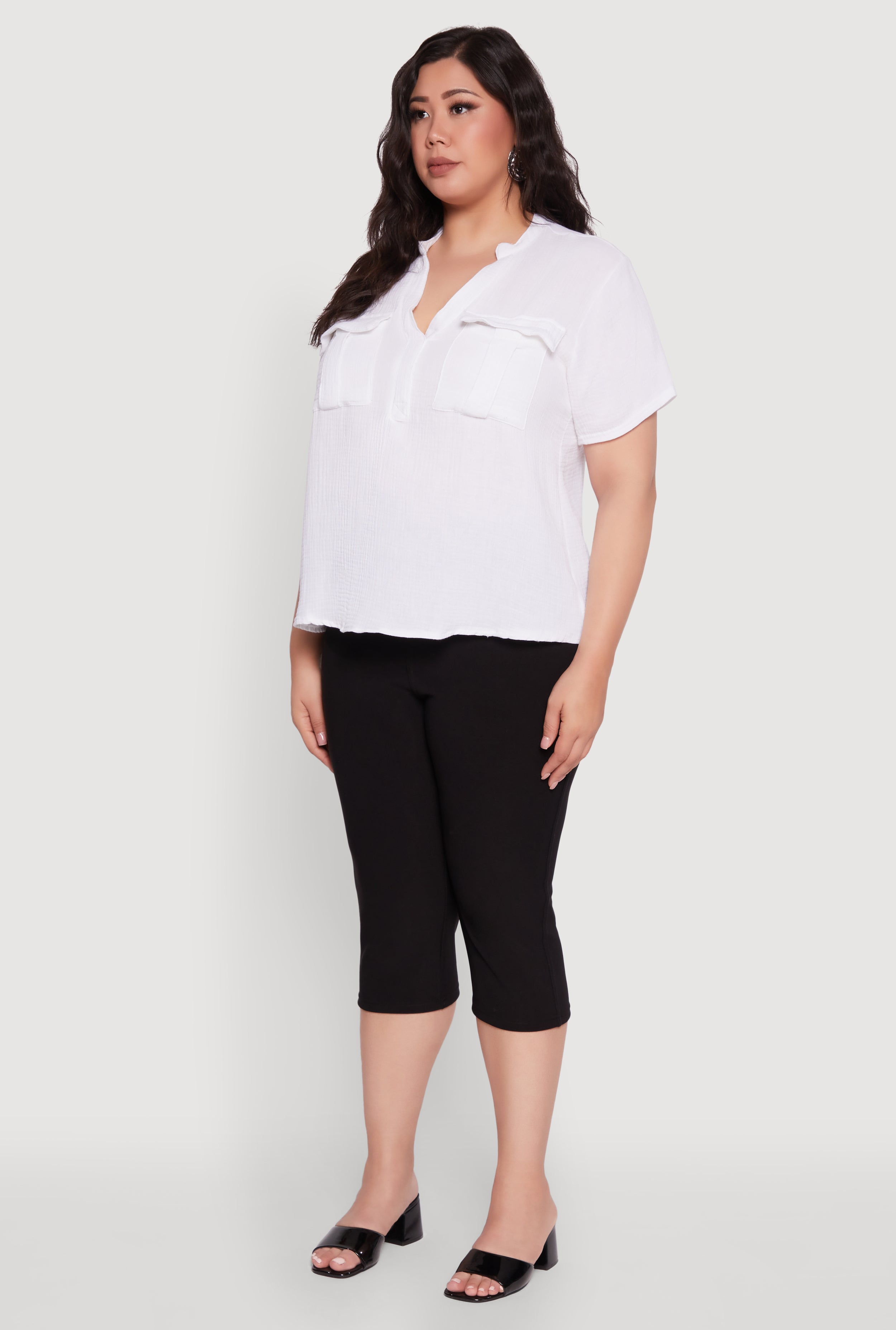 Step up your casual game with this Plus Size Gauze Knit Cargo Pocket Blouse. Designed for all-day comfort and effortless style, its breathable gauze knit fabric keeps you cool while the classic fit flatters every curve. The V-neck and mandarin collar combo adds a fresh twist to your everyday look, and those cargo pockets bring both function and flair. Whether you're running errands or meeting friends, this blouse is your new go-to for laid-back confidence.