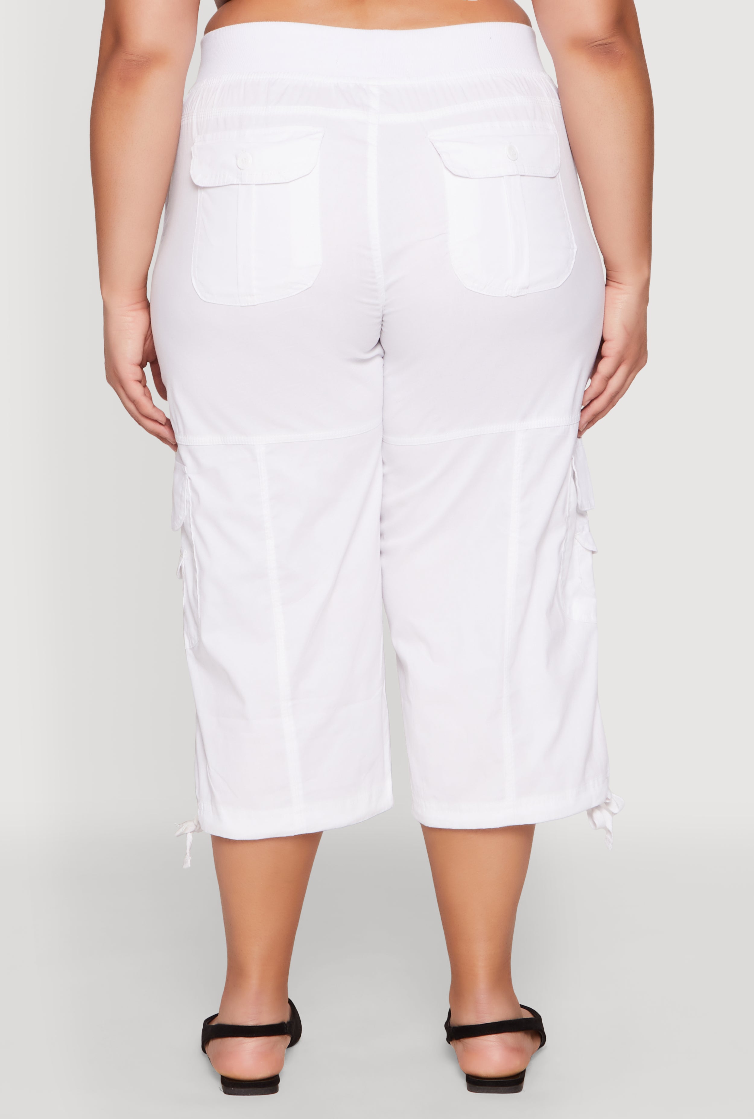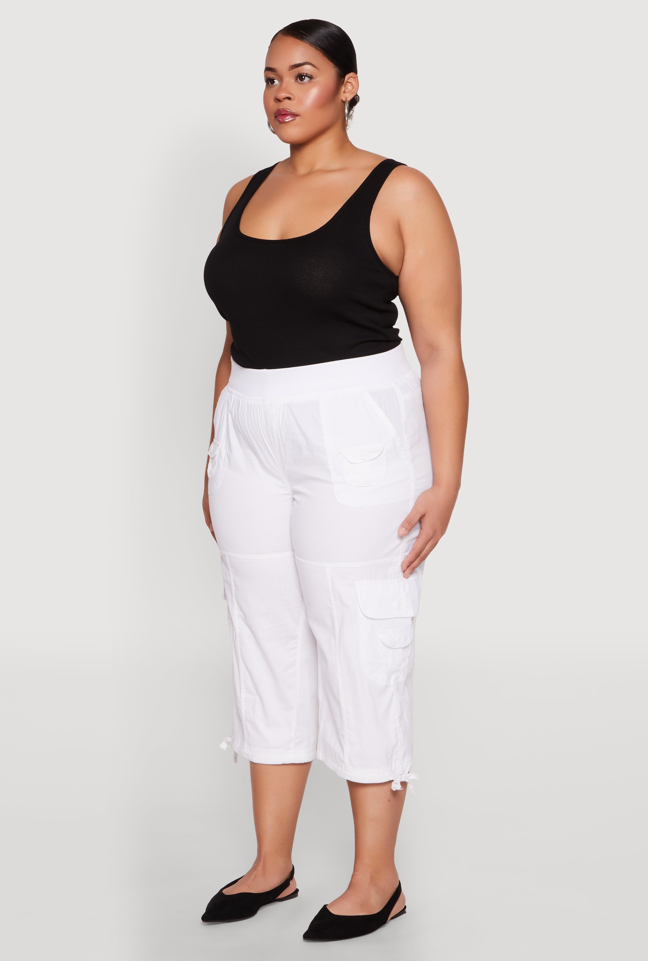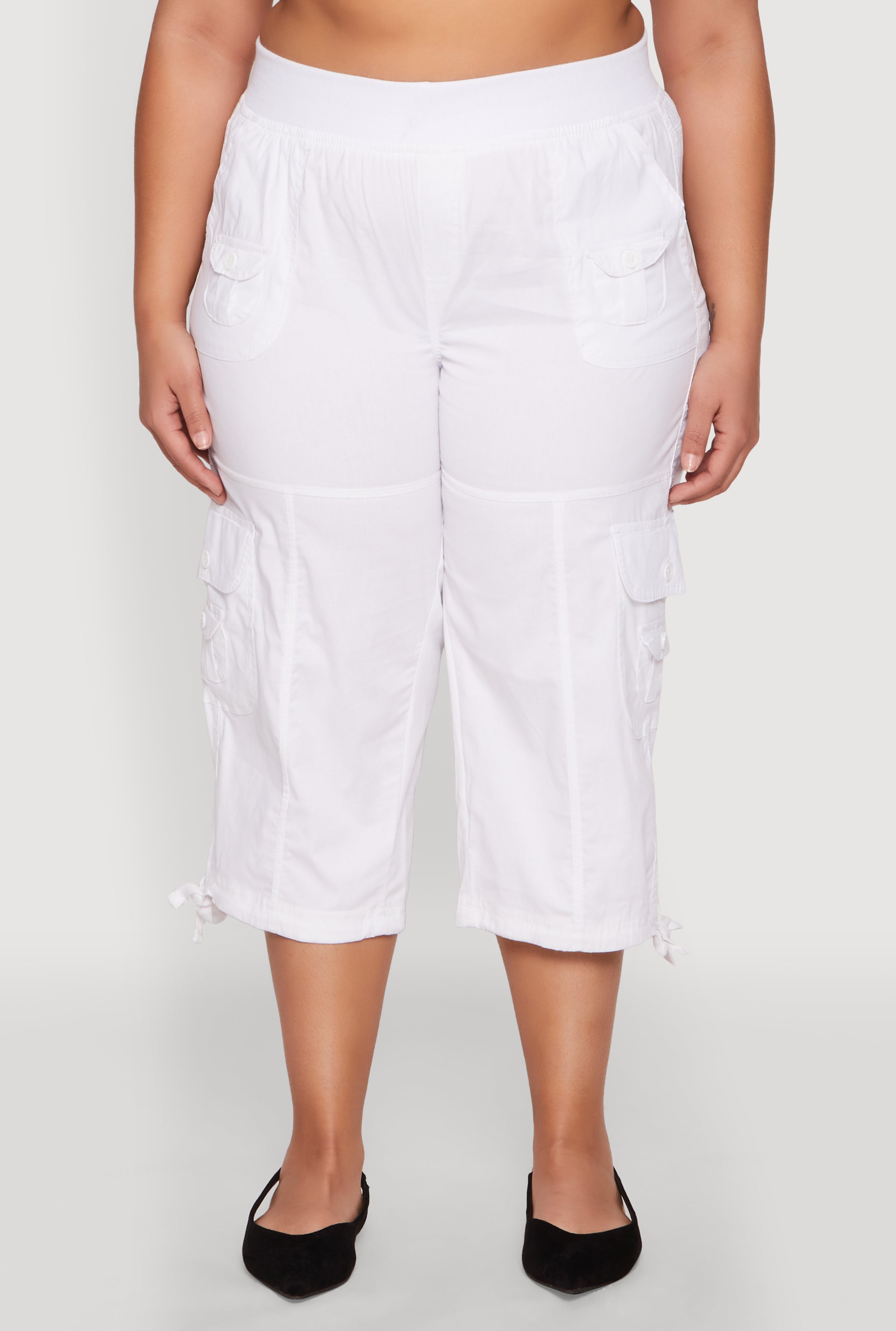 Step into effortless style with our Plus Size High Waisted Cargo Capri Pants. Designed to flatter your curves and keep you comfortable all day long, these chic capris are a must-have for your wardrobe. The elastic waistband ensures a perfect fit, while the drawstring hem adds a trendy touch. Whether you're heading out for a casual day or just lounging in style, these cargo pants are your new go-to. Experience the perfect blend of comfort, fashion, and affordability with this versatile piece that makes every outfit pop.