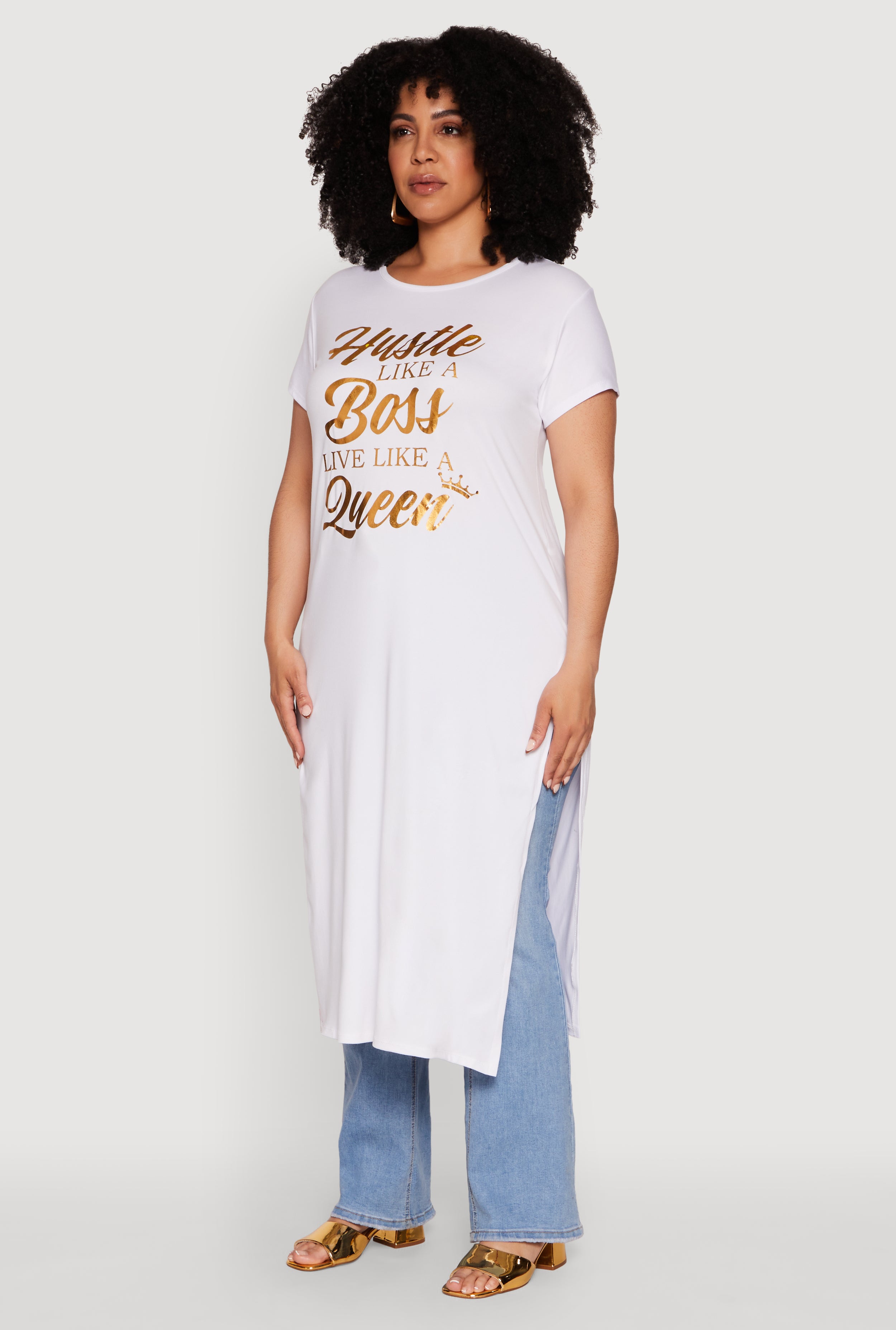 Elevate your wardrobe with the Plus Size Hustle Like A Boss Live Like A Queen Maxi Top — the perfect blend of comfort and confidence. Crafted for women who want to make a statement without sacrificing ease, this classic-fit t-shirt dress features a flattering crew neckline, short sleeves, and a daring side slit that adds just the right touch of sass. Whether you're conquering your day or relaxing in style, this maxi top is your new go-to for effortless chic.