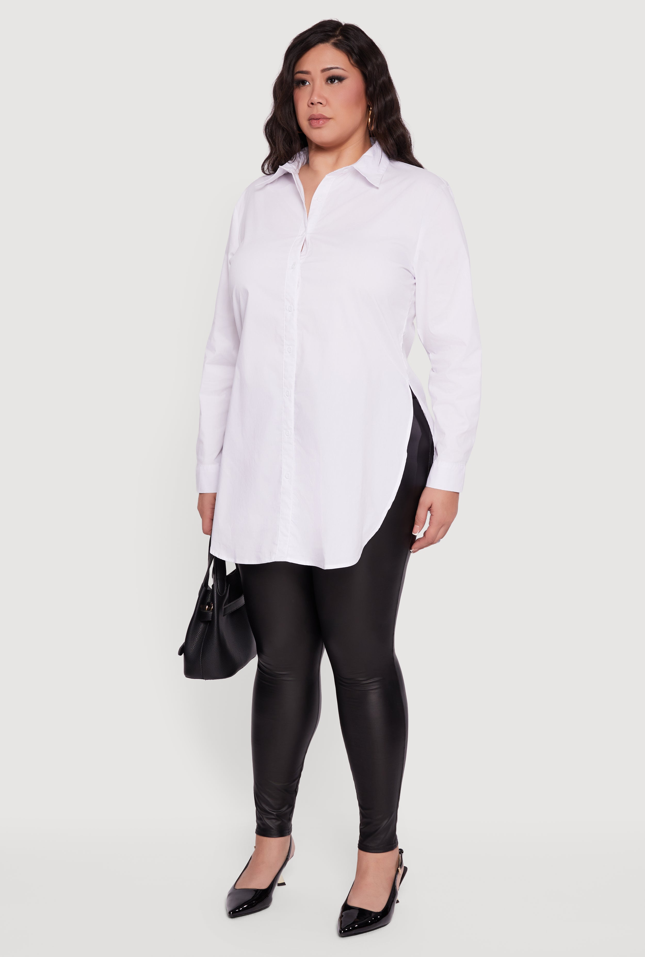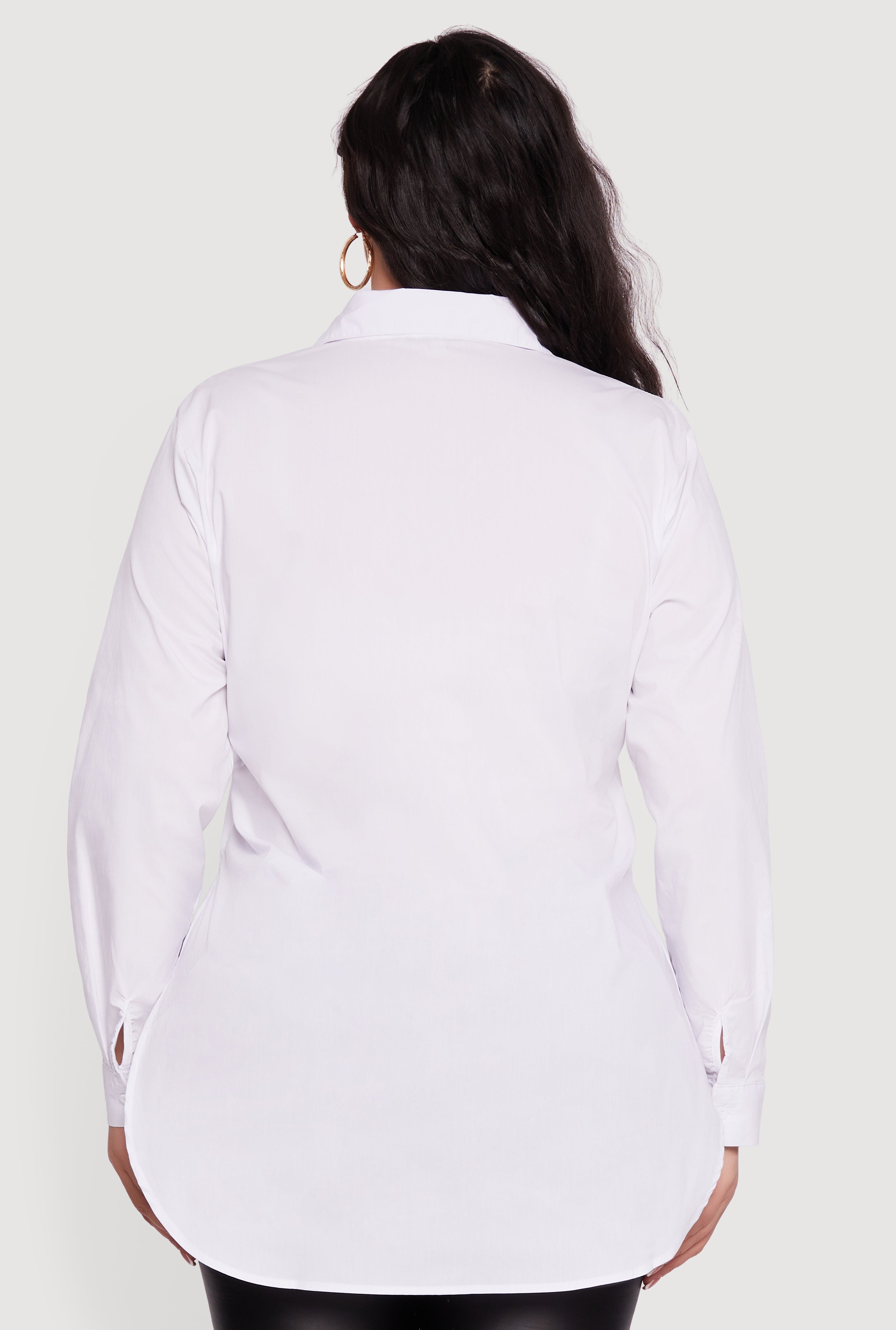 Step up your style game with this Plus Size Long Sleeve Button Front Tunic Blouse designed to flatter every curve. Featuring a classic fit and timeless collar, this blouse effortlessly blends casual comfort with office-ready polish. The button front adds a chic touch while side slits give you freedom to move and layer with ease. Perfect for casual days or a night out, this solid-colored tunic is your new go-to for versatile, confident looks.