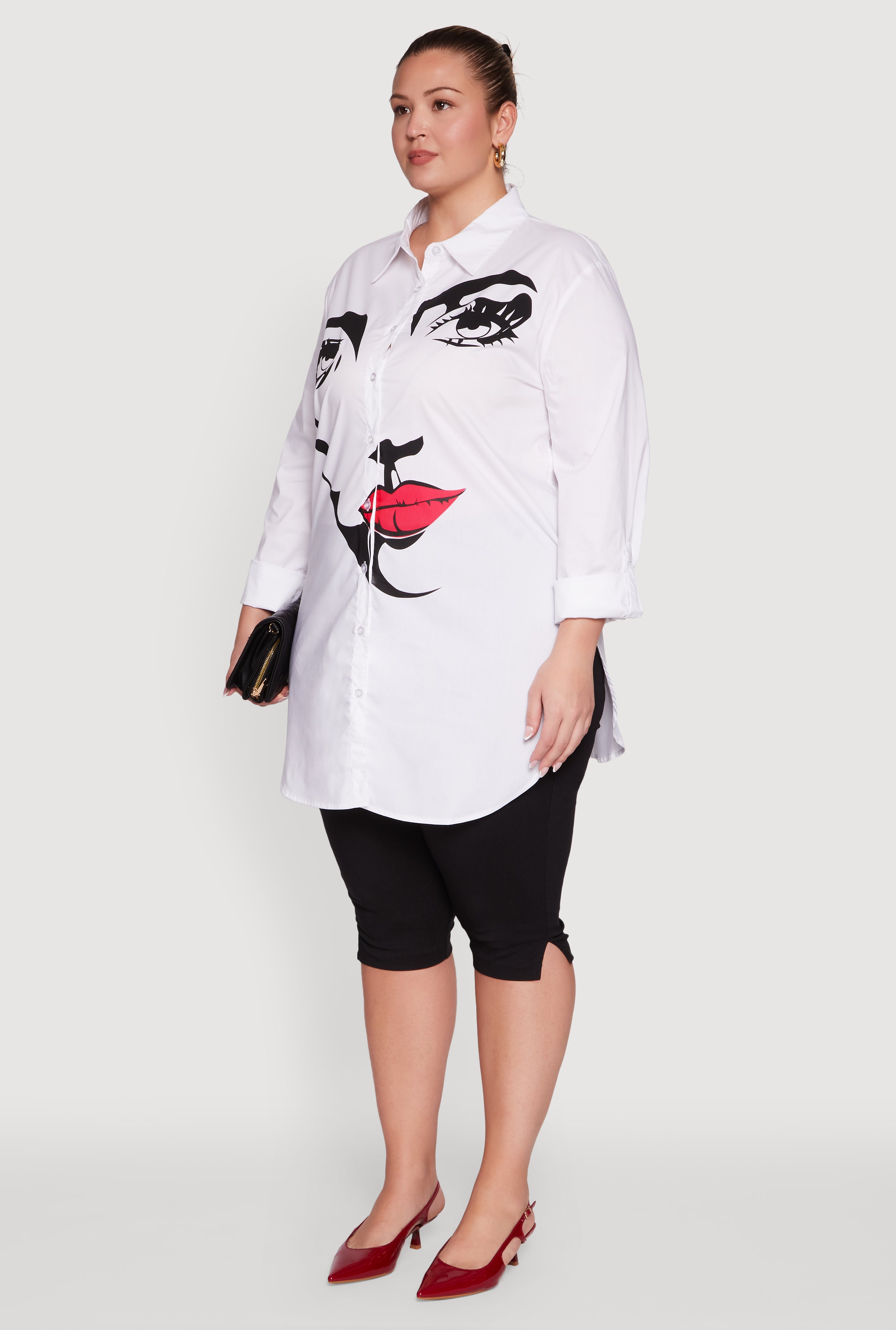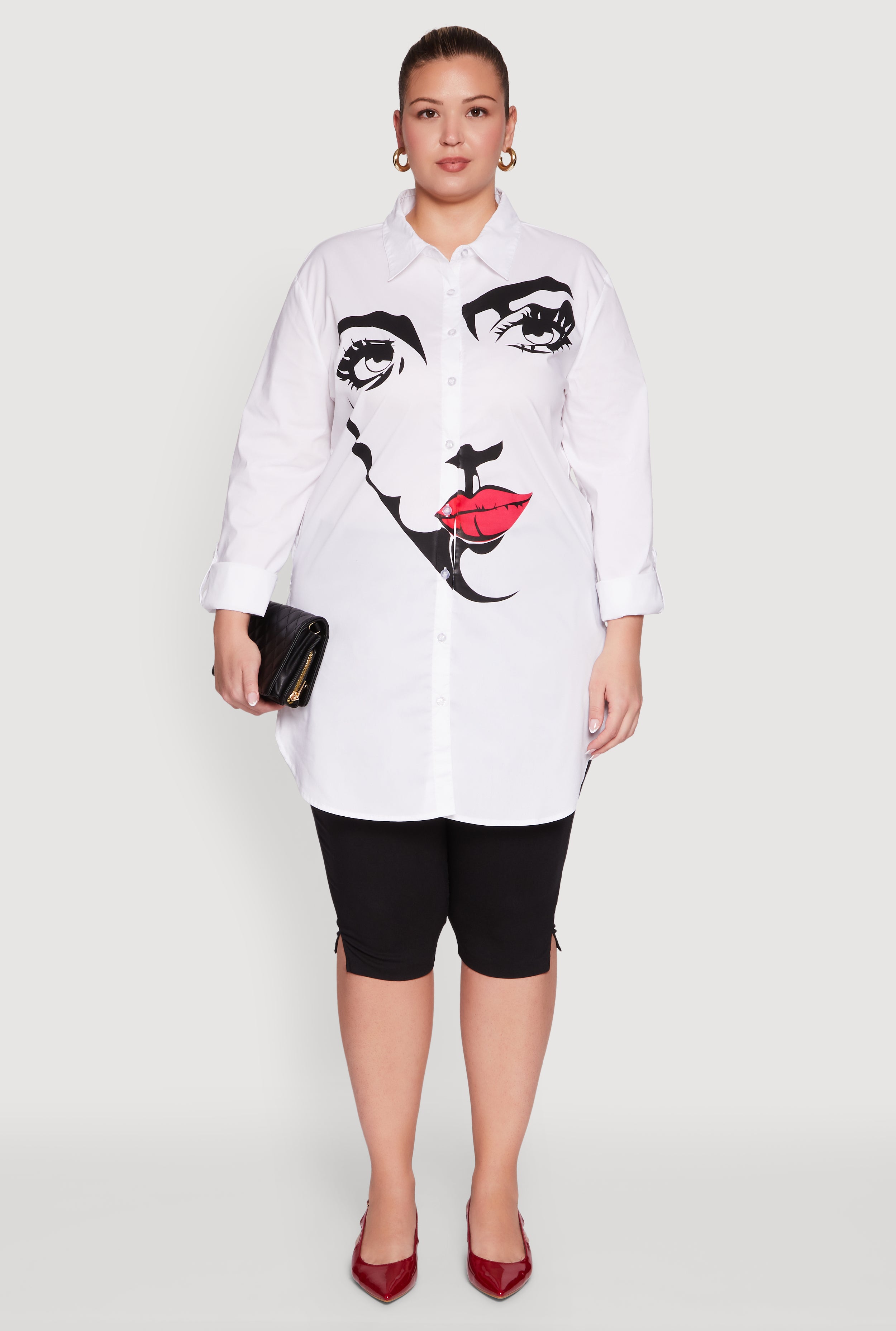 Meet your new go-to for effortless style and comfort. This Plus Size Long Sleeve Tunic Shirt with Face Print brings a fresh twist to your casual wardrobe with its bold graphic print and classic fit. The timeless shirt collar and tunic hem create a flattering silhouette that moves with you, making it perfect for everything from brunch dates to chill weekends. Easy to pair and impossible to ignore, this tunic shirt is here to upgrade your everyday look without breaking the bank.
