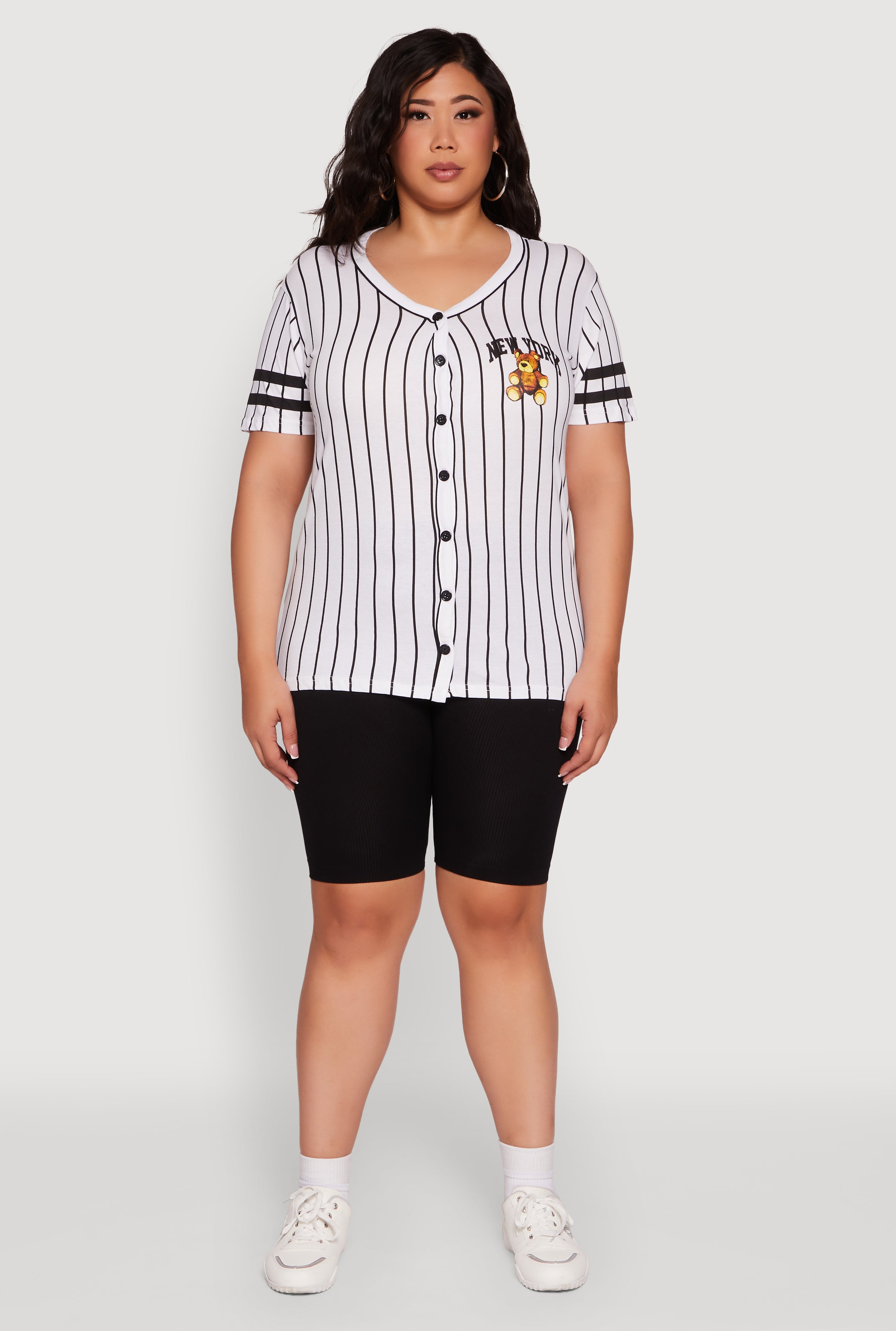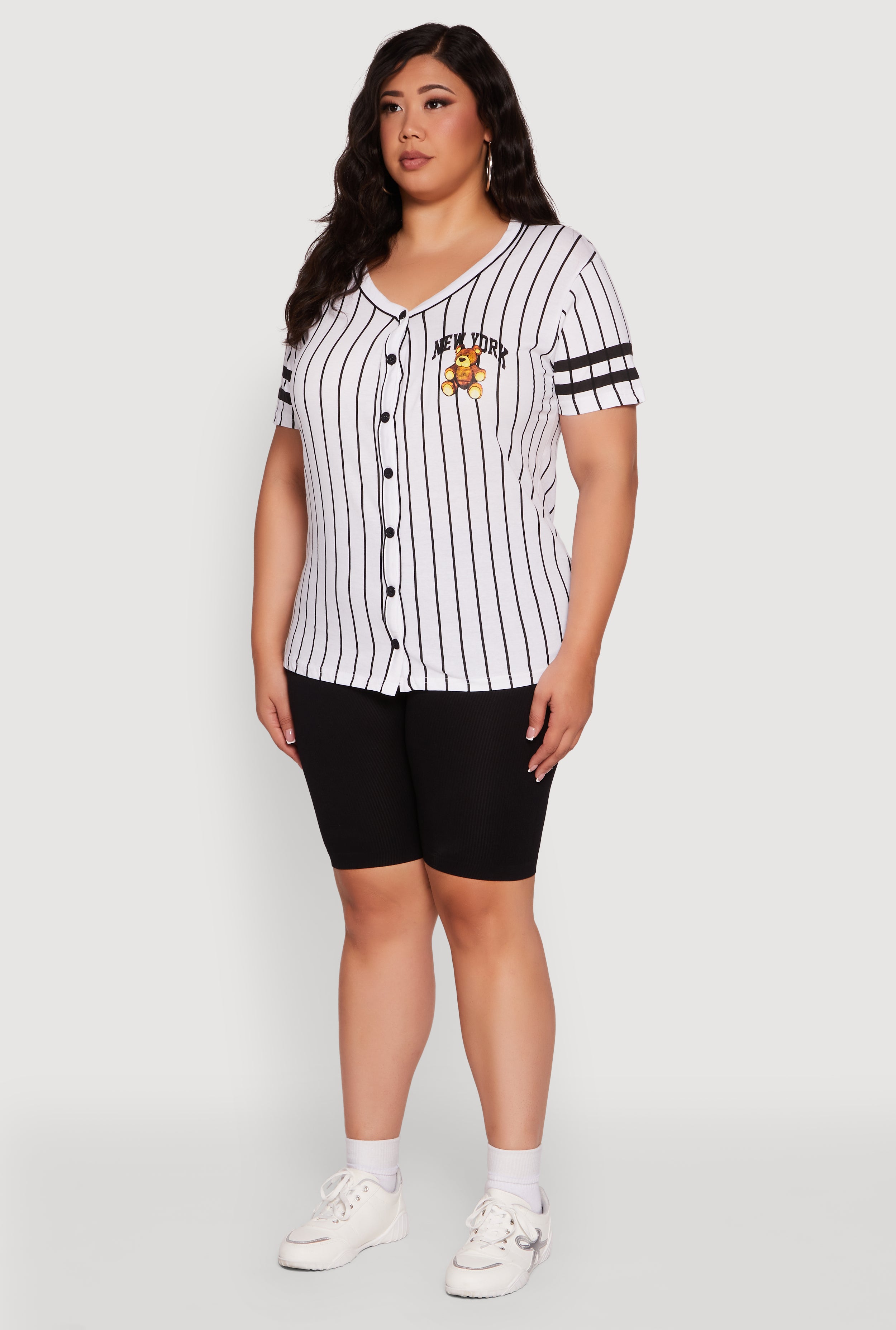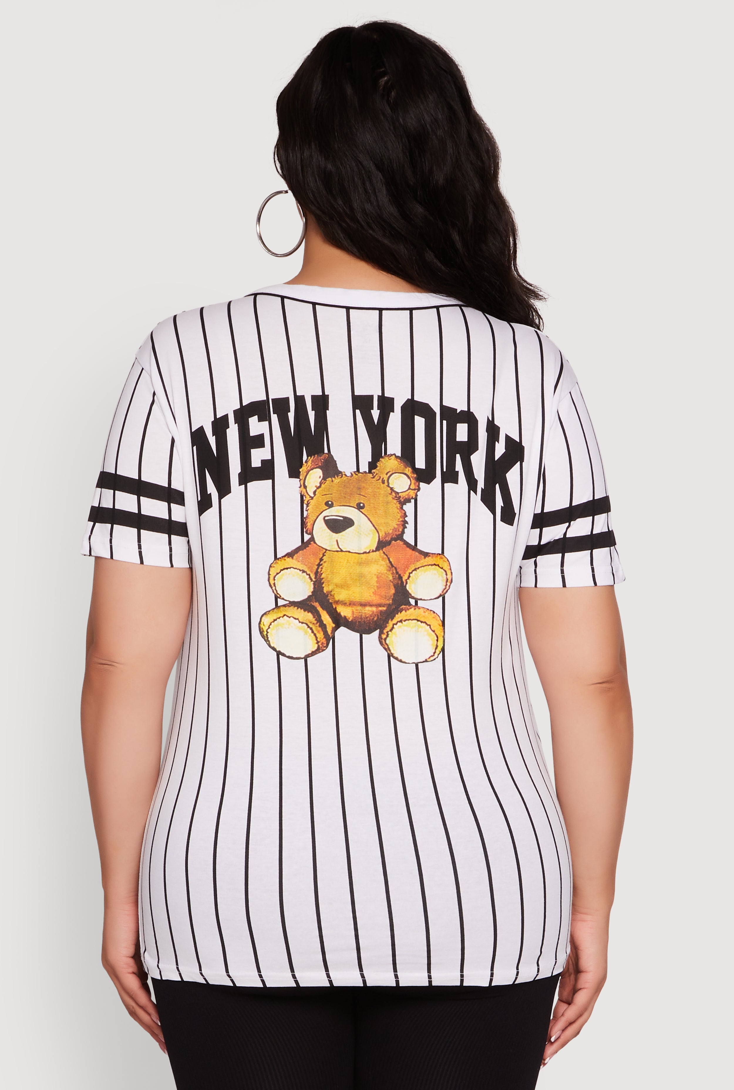 Step up your casual game with this Plus Size New York Bear Graphic Striped Baseball Tee. Featuring a classic fit and a flattering V-neck, this tee blends sporty stripes with a bold New York bear graphic for a look that’s effortlessly cool. The button front adds a little extra flair, making it perfect for those days when you want to feel comfortable and stylish without trying too hard. Whether you're hitting the streets or chilling with friends, this tee is your new go-to for easy, laid-back vibes.