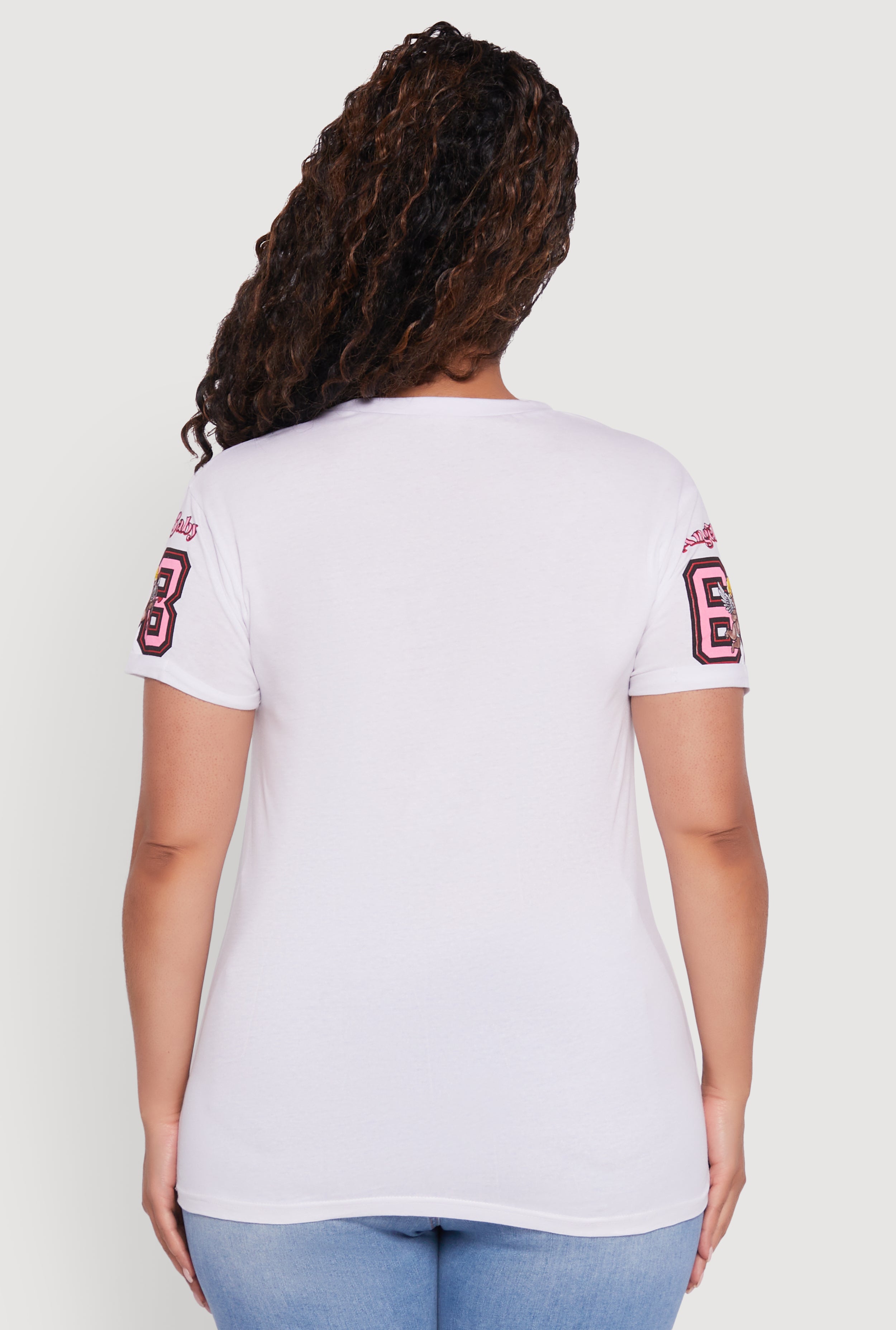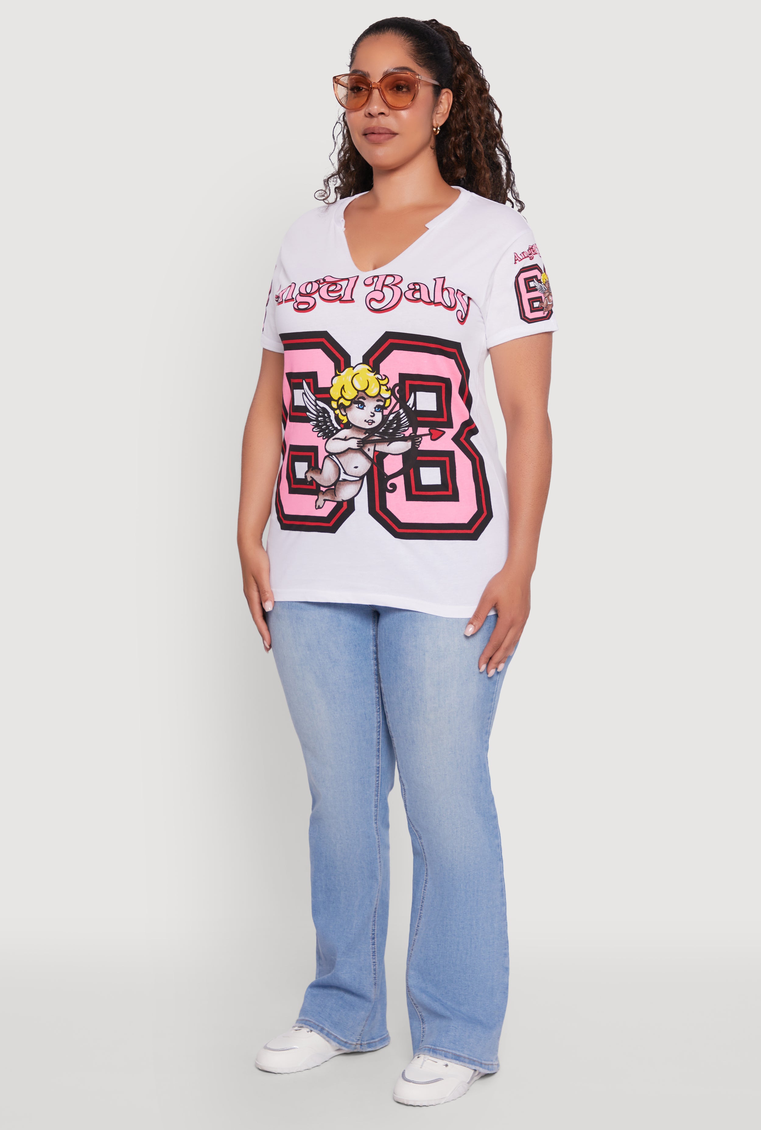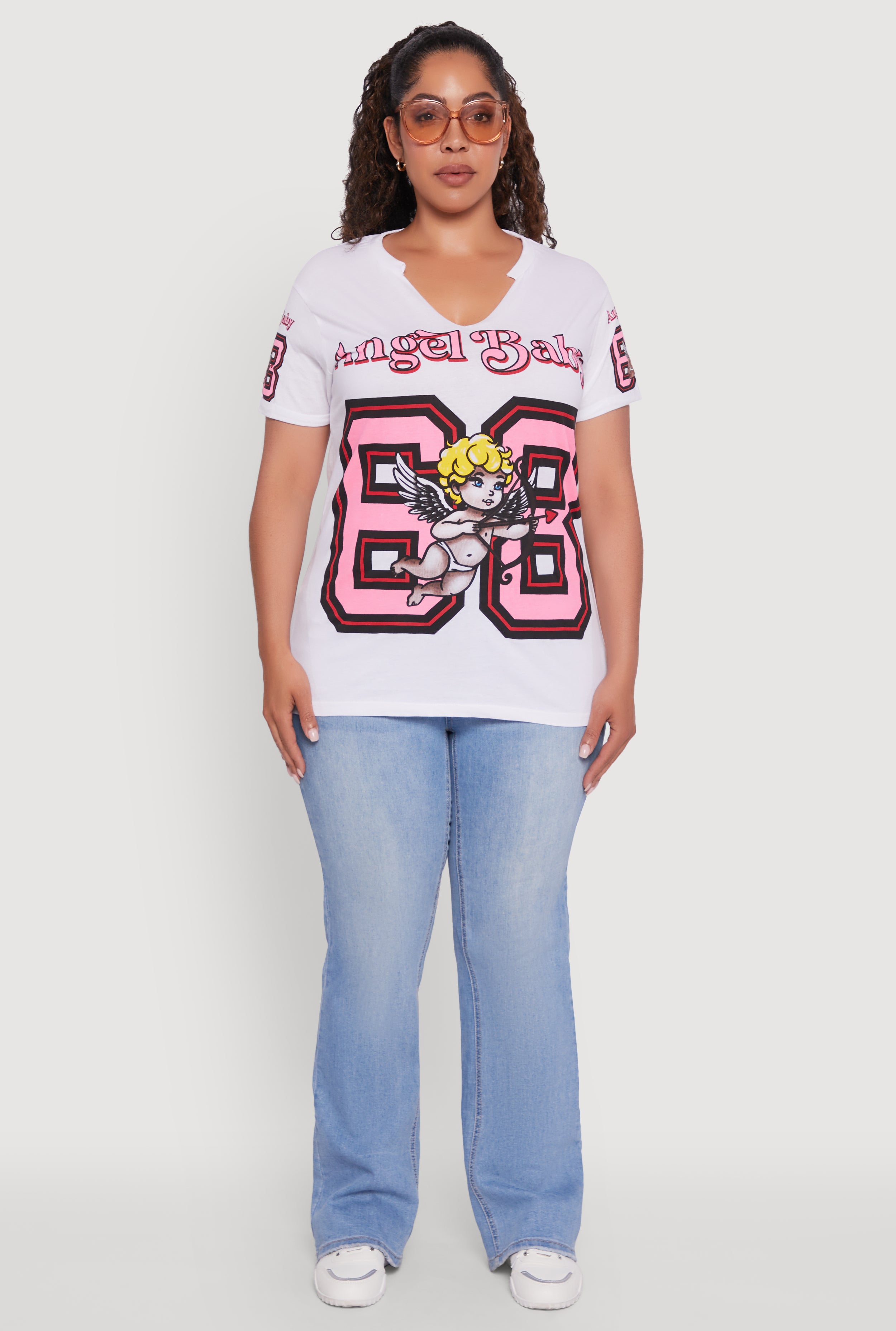 Step up your casual game with the Plus Size Notch Neck Angel Baby 68 Graphic Tee. This classic fit tee features a cool Angel Baby 68 graphic that adds a touch of edgy charm to your everyday look. The notch neck design gives it a trendy twist while keeping it comfy and easy to wear. Perfect for chilling with friends or running errands, this tee is your new go-to for effortless style that celebrates your curves.