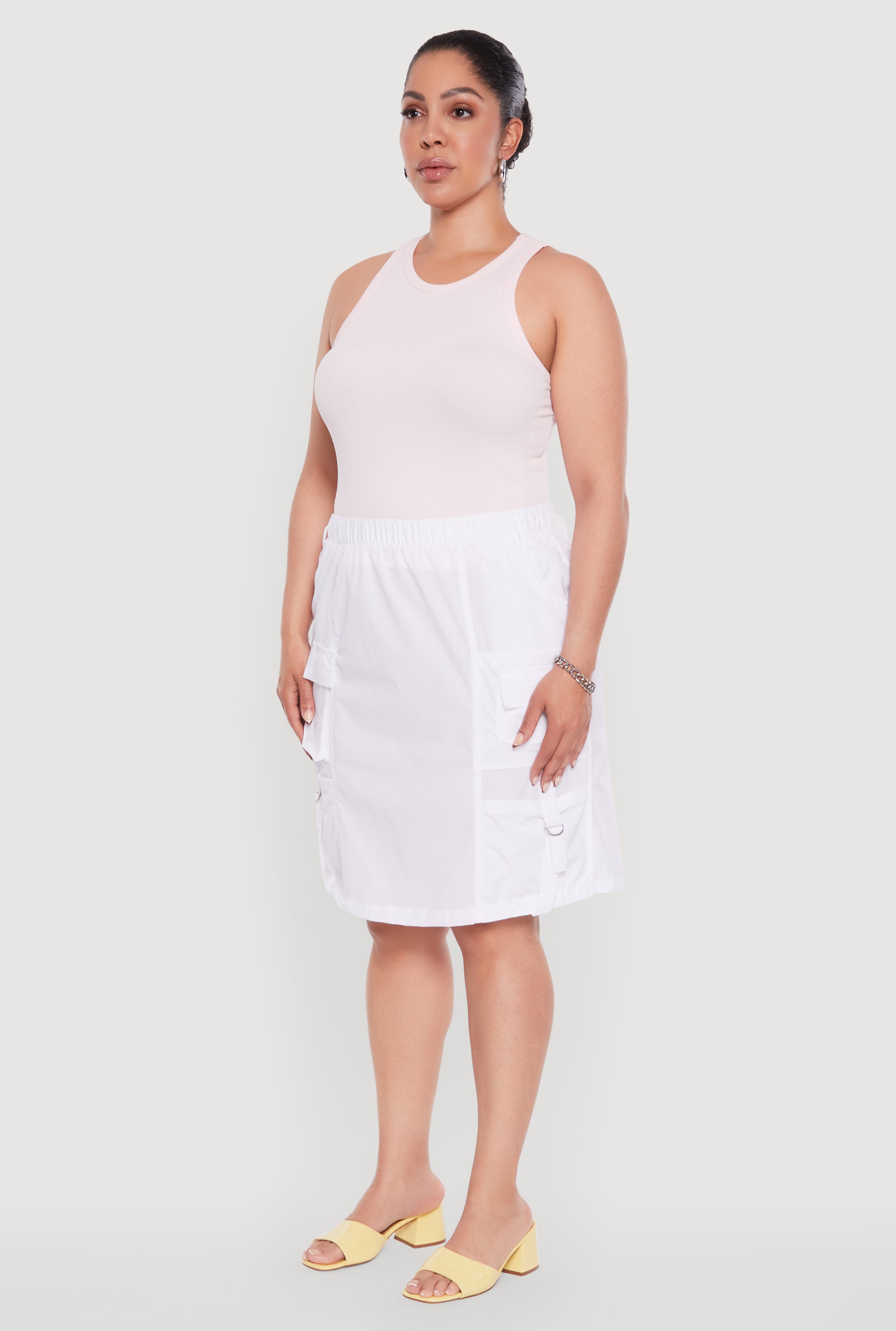 Step up your style game with our Plus Size Nylon Pull On Utility Skirt with Elastic Waist. Designed for comfort and versatility, this mid-length skirt features a high waist and easy pull-on style that moves with you. Perfect for casual outings or dressing up for a night out, its utility design with cargo pockets adds a trendy edge to your wardrobe. Feel confident, comfortable, and effortlessly chic in this must-have piece that celebrates your curves and your style.