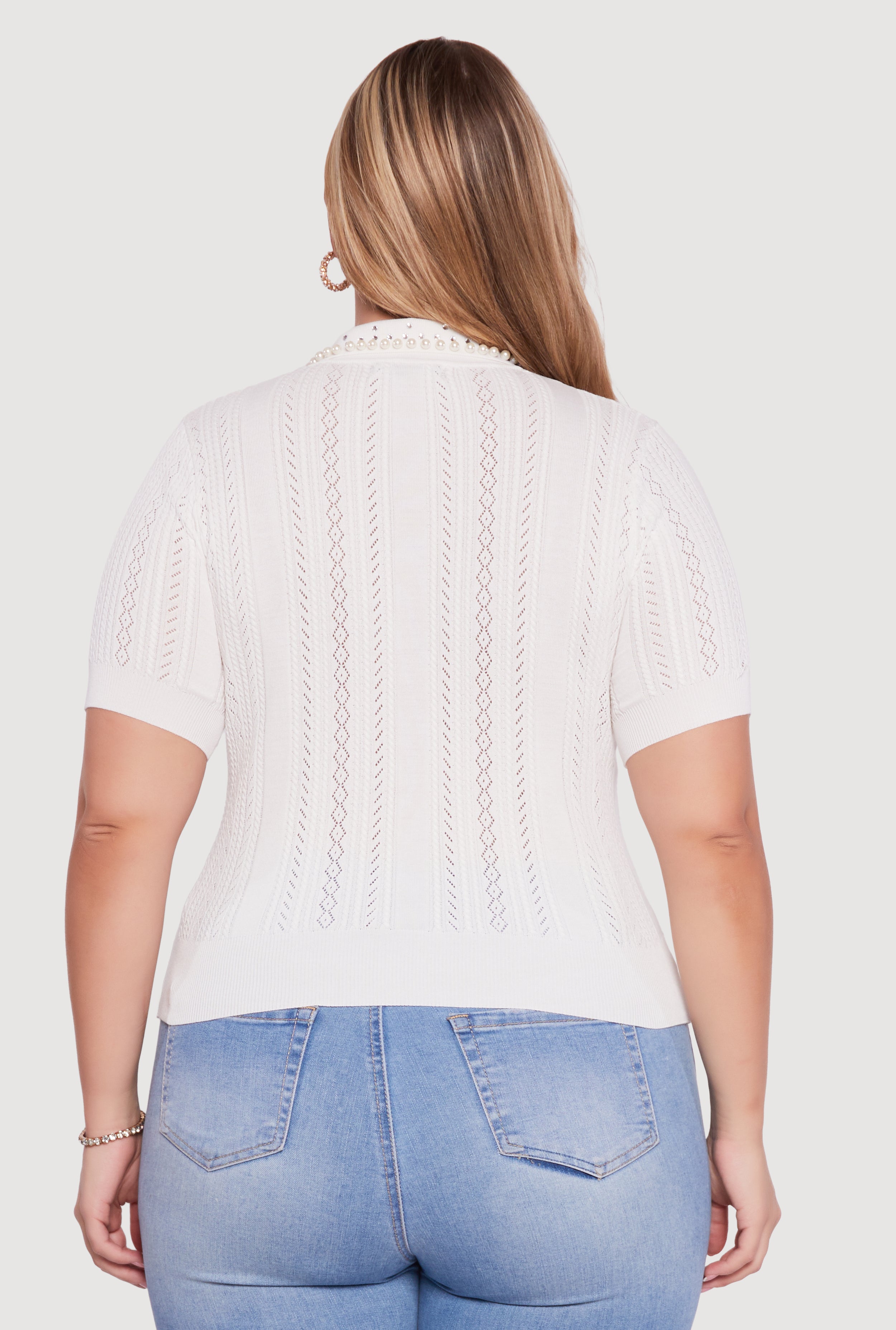 Plus Size Rhinestone and Faux Pearl Detail Pointelle Blouse