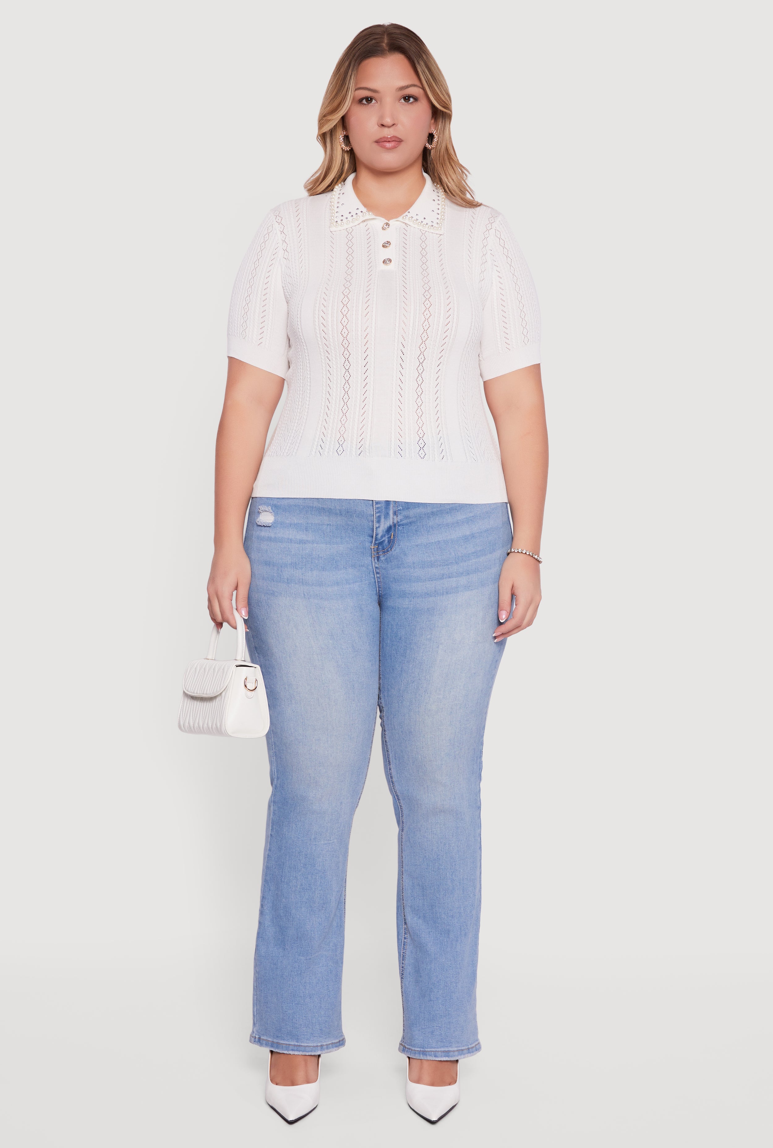 Step up your casual game with this Plus Size Rhinestone and Faux Pearl Detail Pointelle Blouse. Featuring a classic fit and timeless collar, this blouse adds a touch of sparkle and elegance to your everyday style. The delicate pointelle fabric keeps things light and breezy while the button front makes it easy to wear from day to night. Perfect for those who want to shine without trying too hard.
