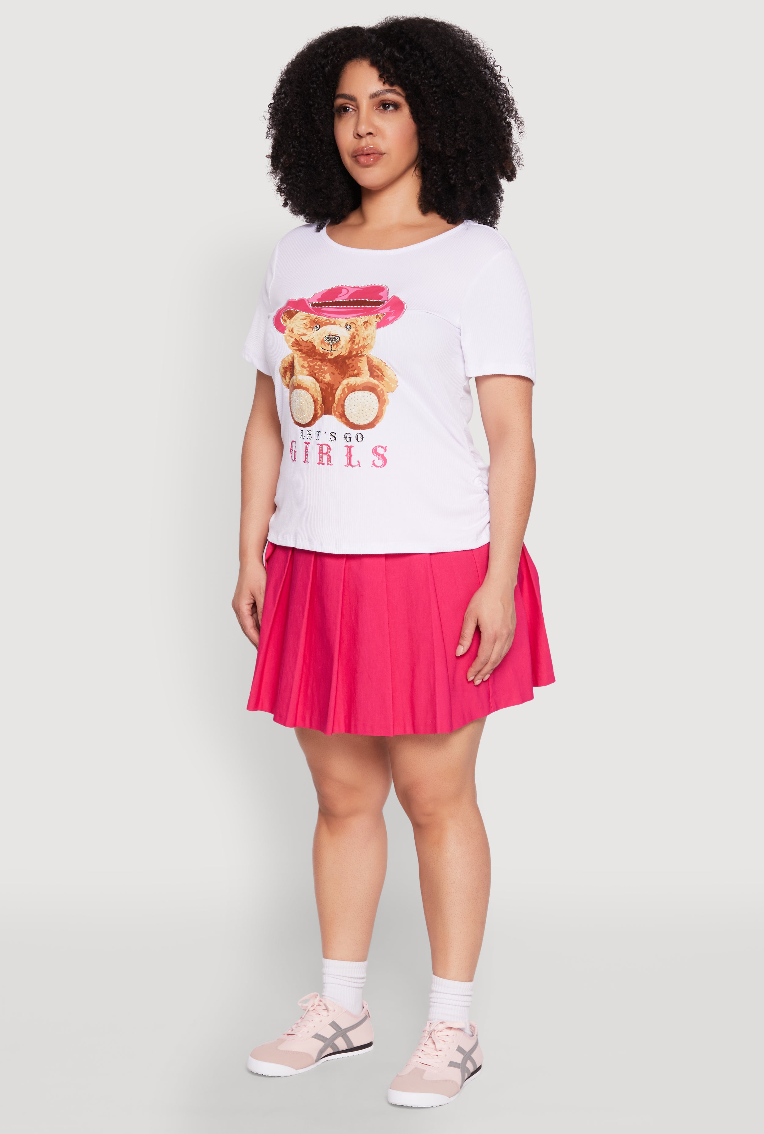 Get ready to turn heads and spread good vibes with the Plus Size Rib Knit Lets Go Girls Graphic Tee. Designed for comfort and style, this classic fit tee features a bold "Let's Go Girls" graphic that perfectly captures your energetic spirit. With its timeless crew neck and short sleeves, it’s your go-to top for casual days, brunch dates, or just because you want to feel fabulous. Whether you’re rocking it with jeans or layering it up, this tee is all about empowering your everyday look while keeping it affordable and fun.