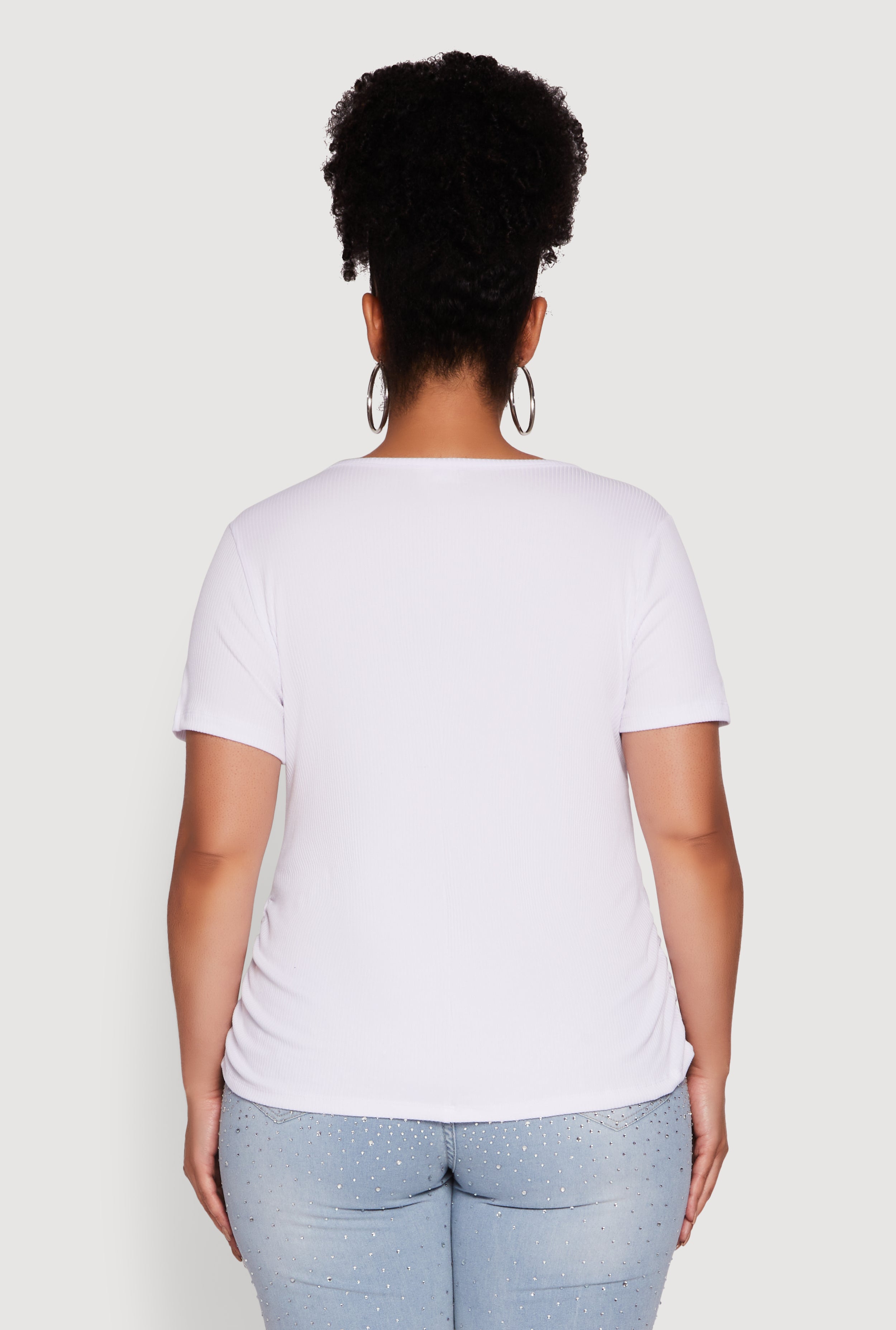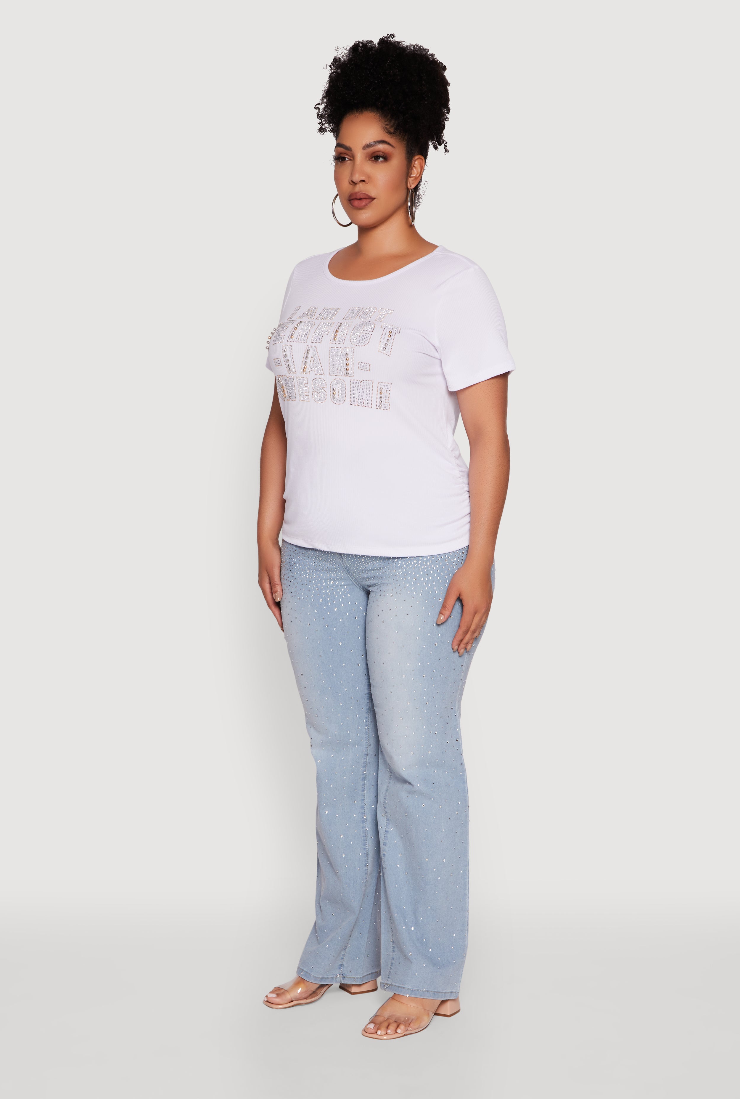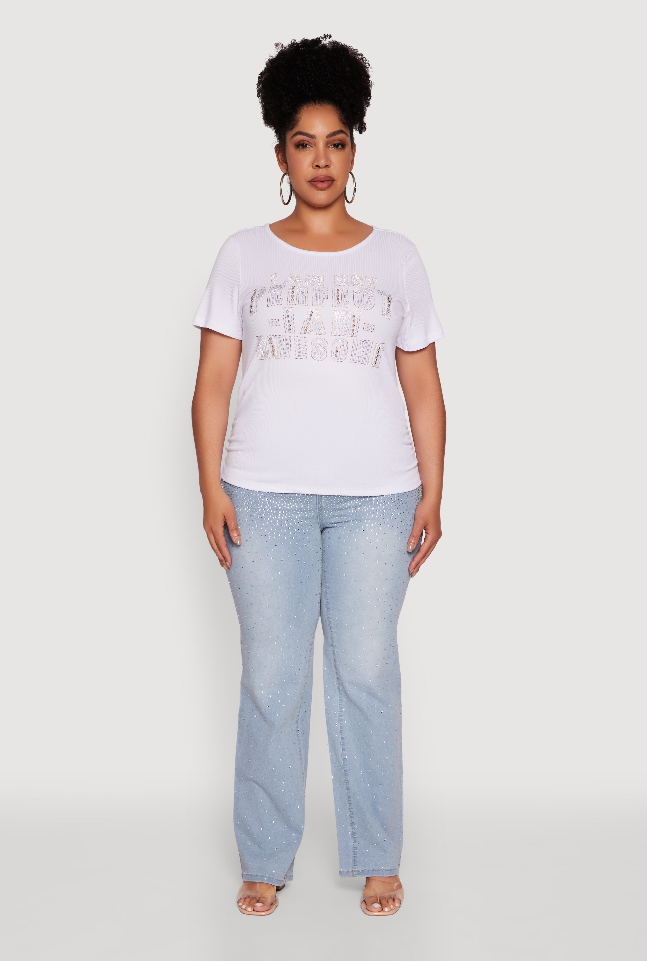 Own your vibe with the Plus Size Ribbed Knit I Am Awesome Graphic Tee. This classic fit tee is all about confidence and comfort, featuring a bold "I Am Not Perfect I Am Awesome" print that speaks your truth. Made from soft ribbed knit fabric, it’s perfect for casual days when you want to keep it cool and effortless. The rhinestone embellishments add just the right touch of sparkle to keep your look fresh and fun. Ready to slay your day? This tee’s got your back.