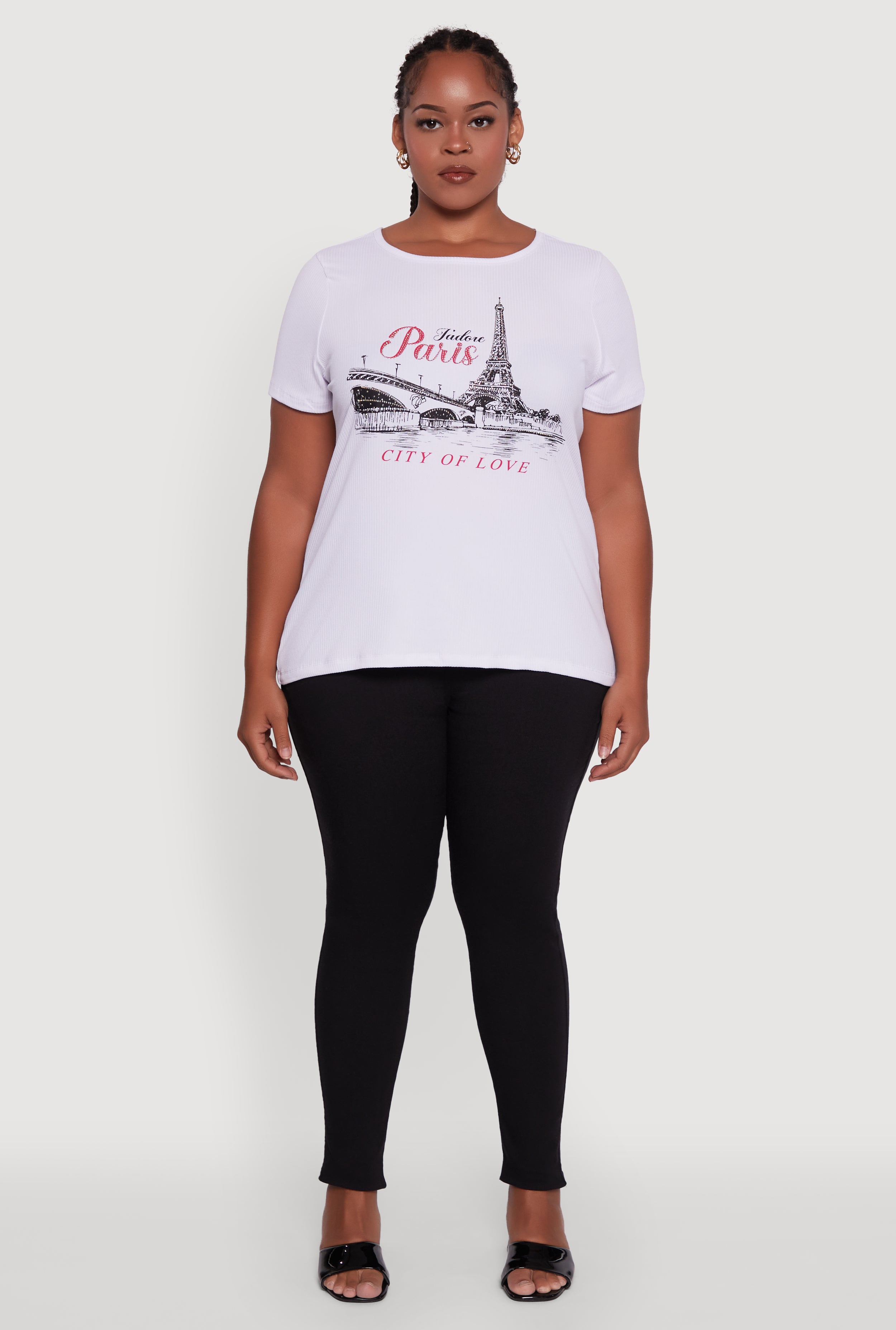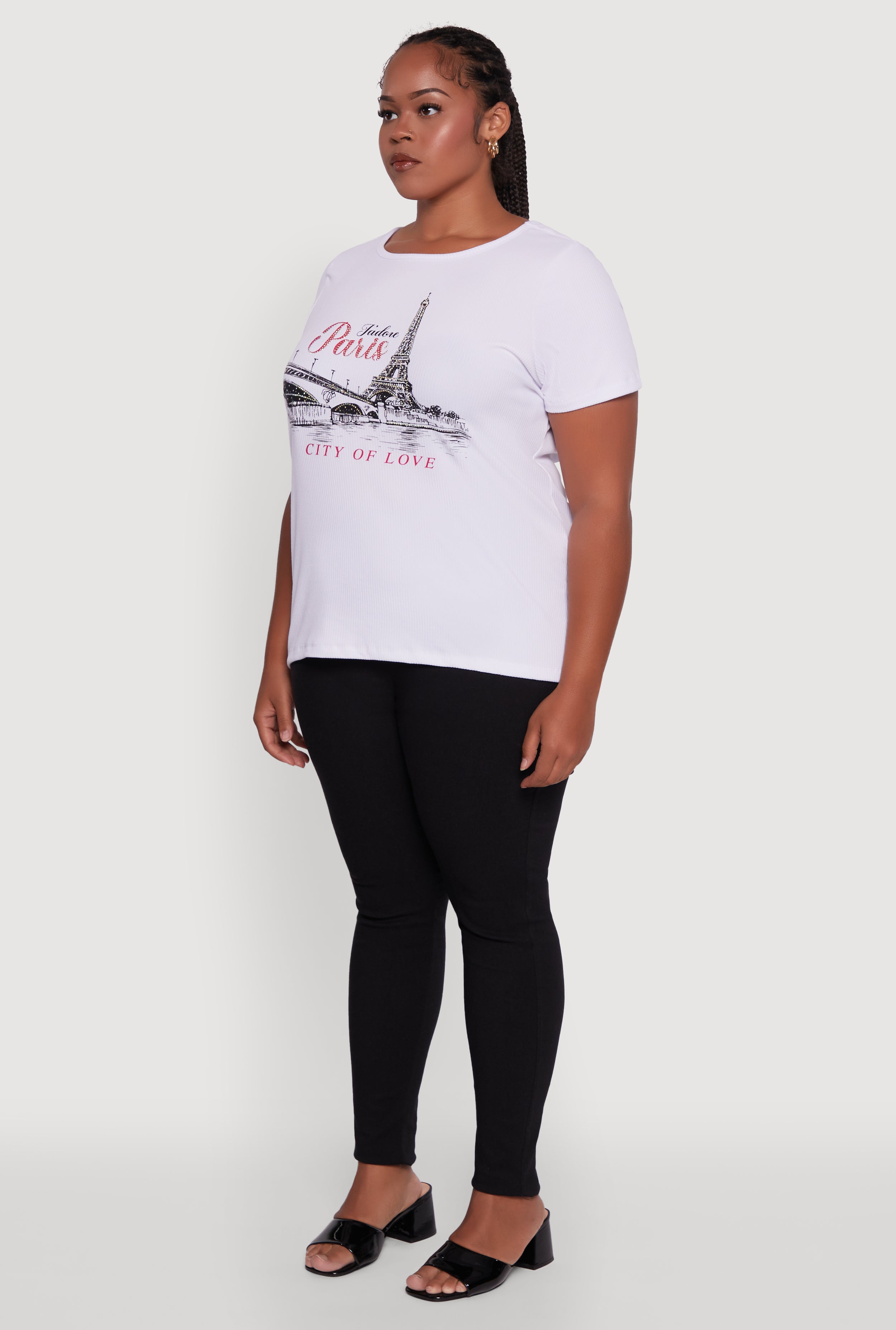 Step out in style and sparkle with the Plus Size Ribbed Knit Rhinestone Paris Graphic Tee. This classic fit tee blends comfy ribbed knit fabric with a chic crew neck and short sleeves, making it your go-to for casual days with a touch of glam. The dazzling rhinestone "J'adore Paris City Of Love" graphic adds just the right amount of shine to elevate your everyday look. Perfect for those who want to keep it effortless yet eye-catching, this tee is a timeless staple that celebrates your curves and your love for all things Paris.