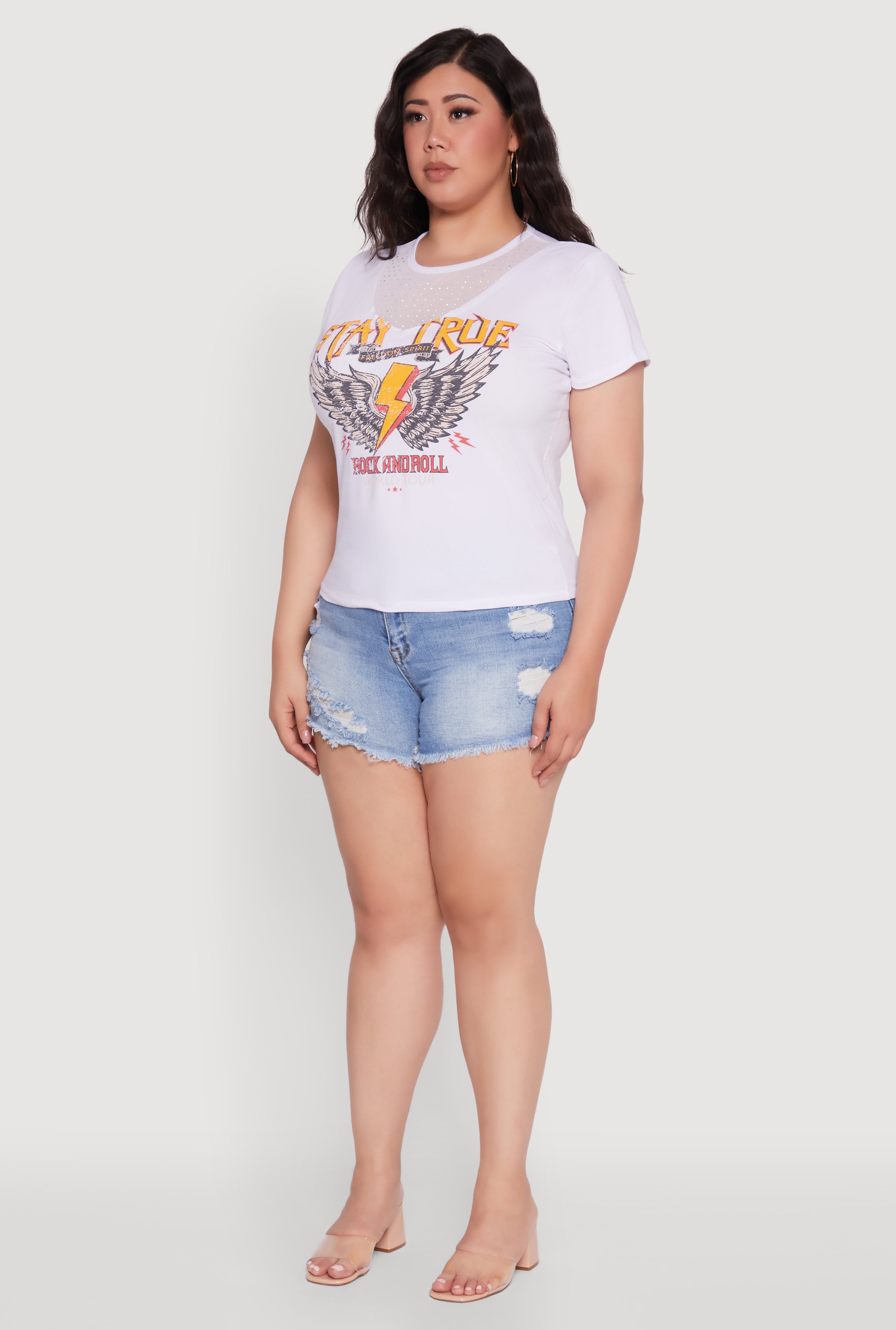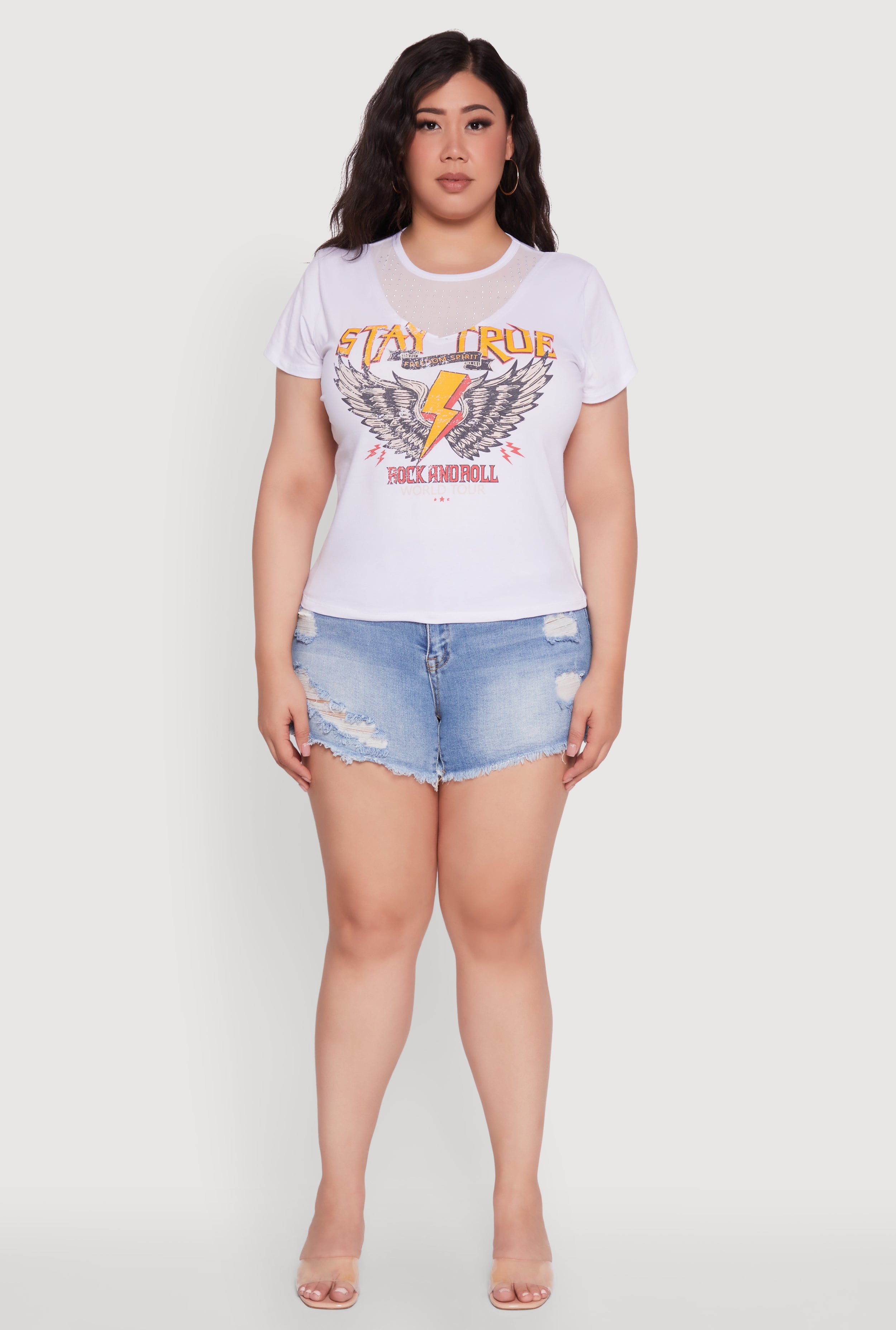 Rock your vibe with this Plus Size Rock And Roll Graphic Mesh Detail T-Shirt. Designed for the bold and free-spirited, this classic fit tee brings together edgy graphic prints and a touch of glam with rhinestone embellishments. Perfect for casual days or festival nights, its breathable mesh details keep you cool while making a statement. Embrace your style and let your outfit do the talking.