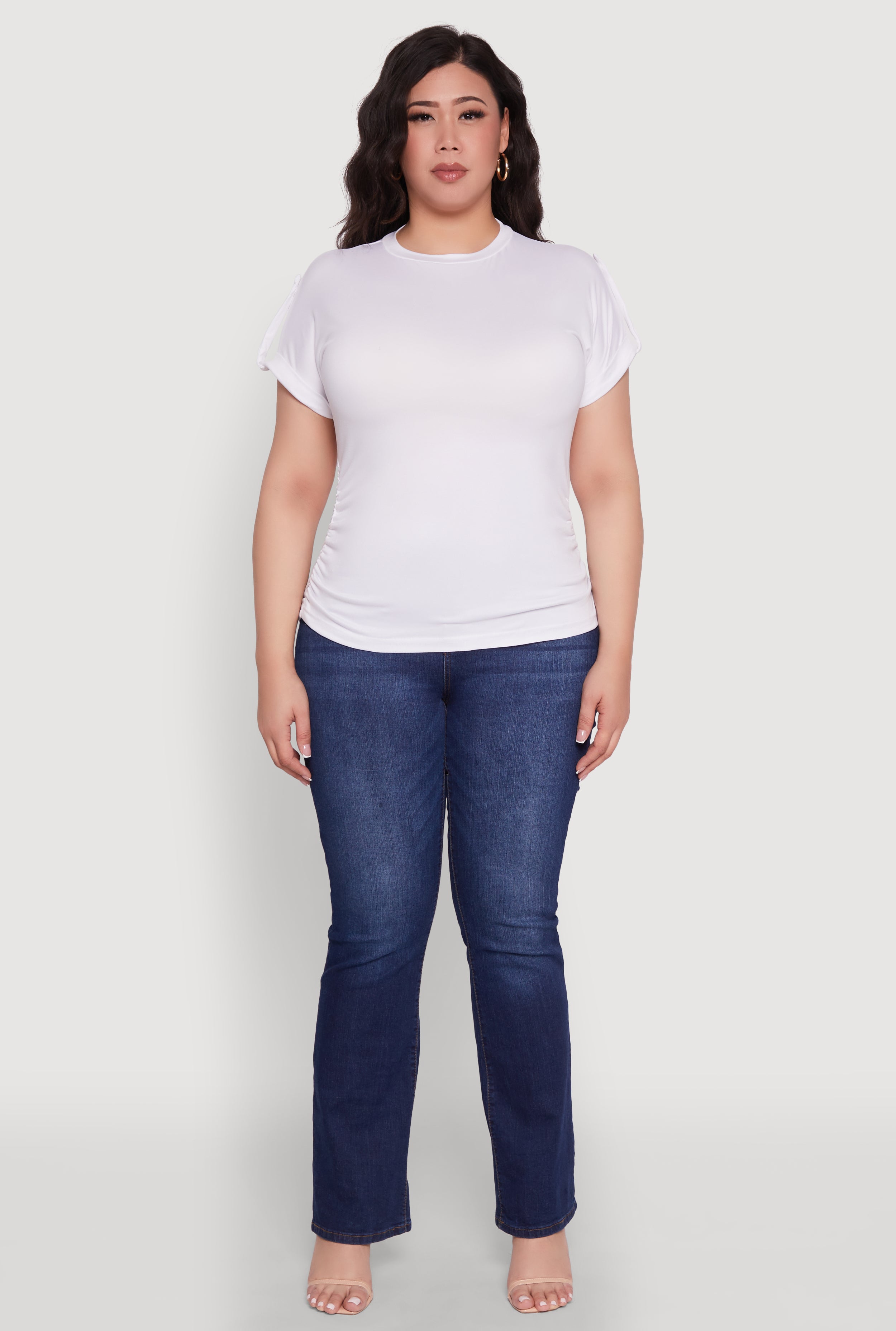 Upgrade your wardrobe with the Plus Size Ruched Tabbed Short Sleeve Top, a perfect blend of comfort and style that keeps you looking effortlessly chic. Designed with a classic fit and timeless silhouette, this T-shirt is a versatile must-have for any deal day or casual outing. The adorable tabbed short sleeves add a touch of flair, while the crew neckline keeps it simple and flattering. Whether you're running errands or meeting friends, this top is your new go-to for all-day confidence and comfort.