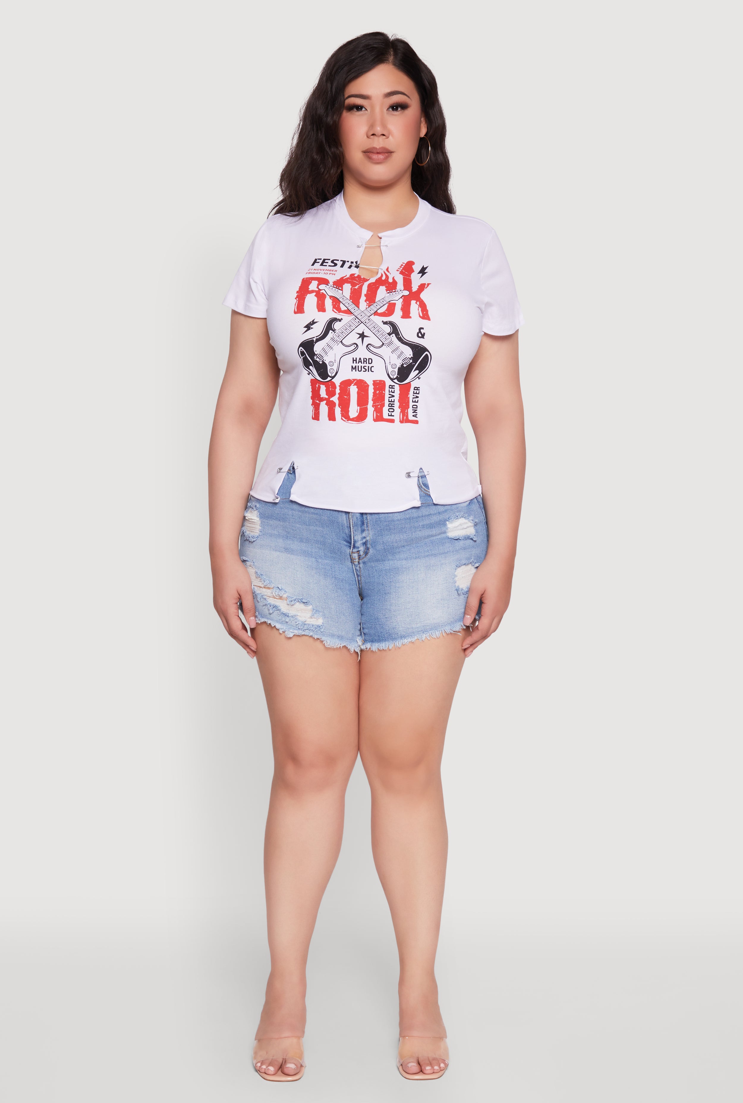Turn up the volume on your casual look with this Plus Size Safety Pin Rock and Roll Graphic Notch Neck Tee. Designed for festival vibes and everyday cool, this classic fit tee features a bold rock and roll graphic paired with an edgy safety pin detail. The notch neck adds a trendy twist while keeping it effortlessly comfy. Whether you're hitting a concert or just chilling with friends, this tee brings that forever and ever hard music spirit to your wardrobe.