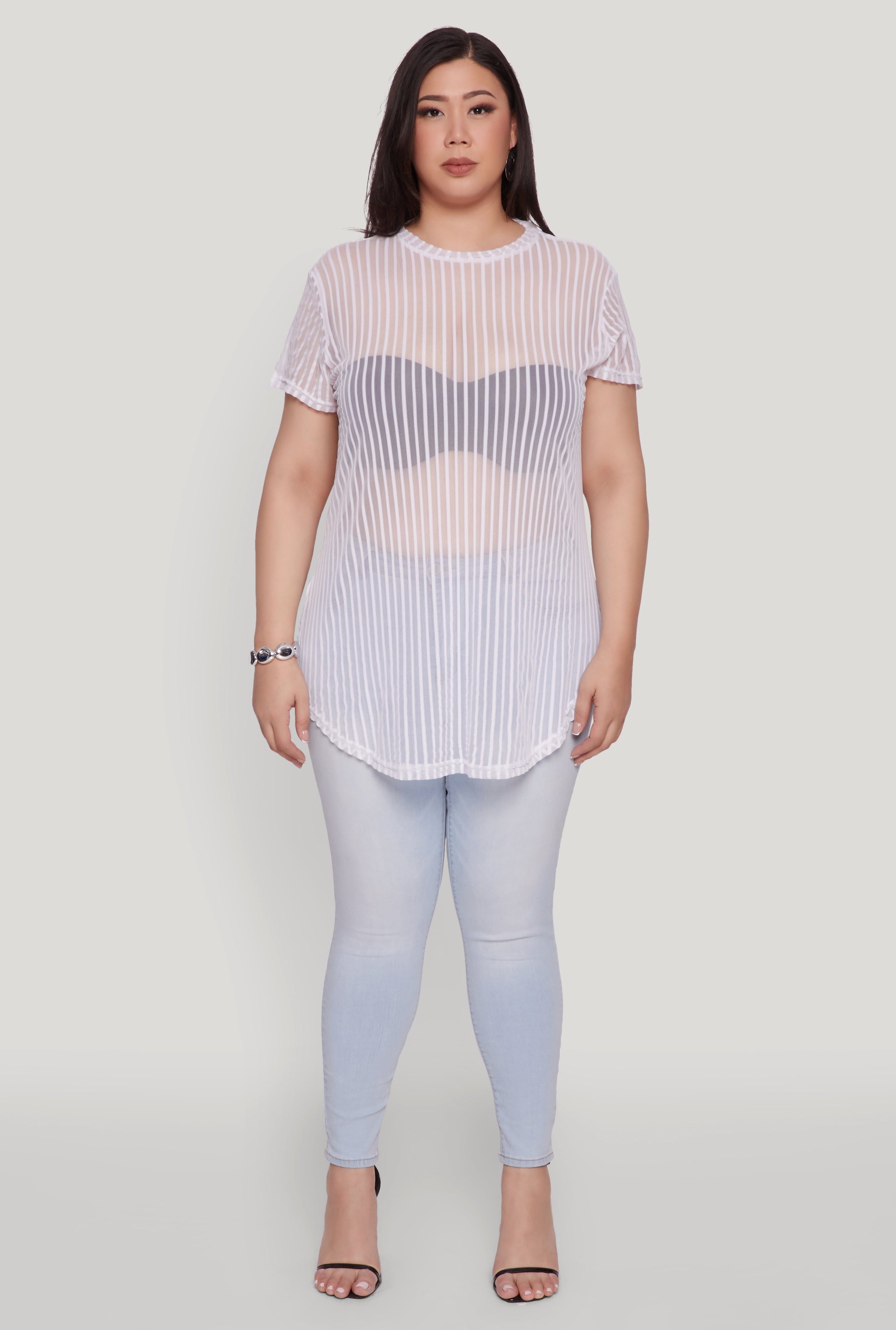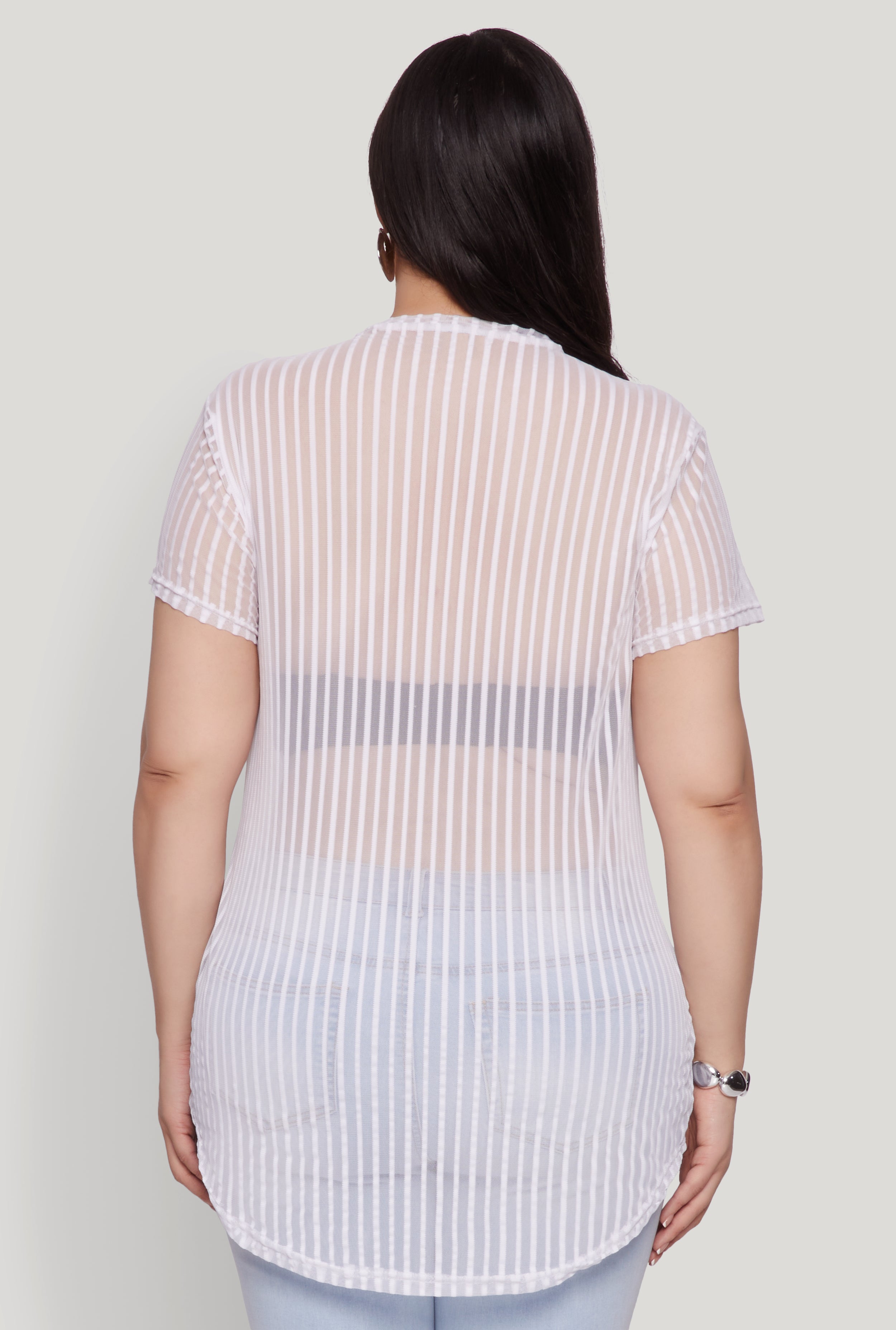 Upgrade your wardrobe with our Plus Size Shadow Stripe Mesh Top, the perfect blend of style and comfort for your next night out. Featuring a classic crew neck and short sleeves, this sheer mesh tee offers a timeless silhouette that flatters every curve. Its shadow stripe pattern adds a subtle touch of edge, making it a must-have for fashion-forward women who love to stand out. Whether you're layering or wearing it solo, this top is your new go-to for effortless, chic looks.