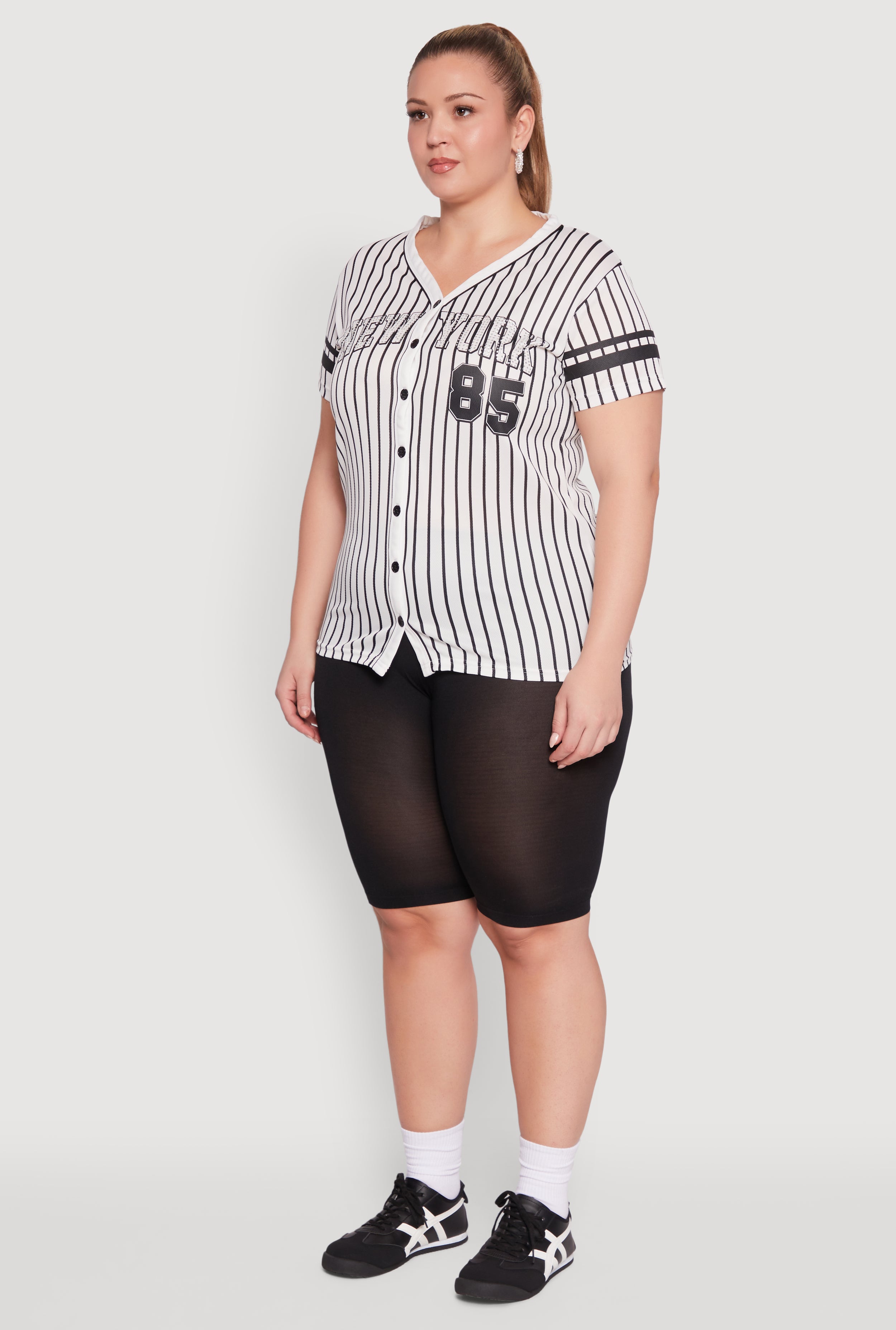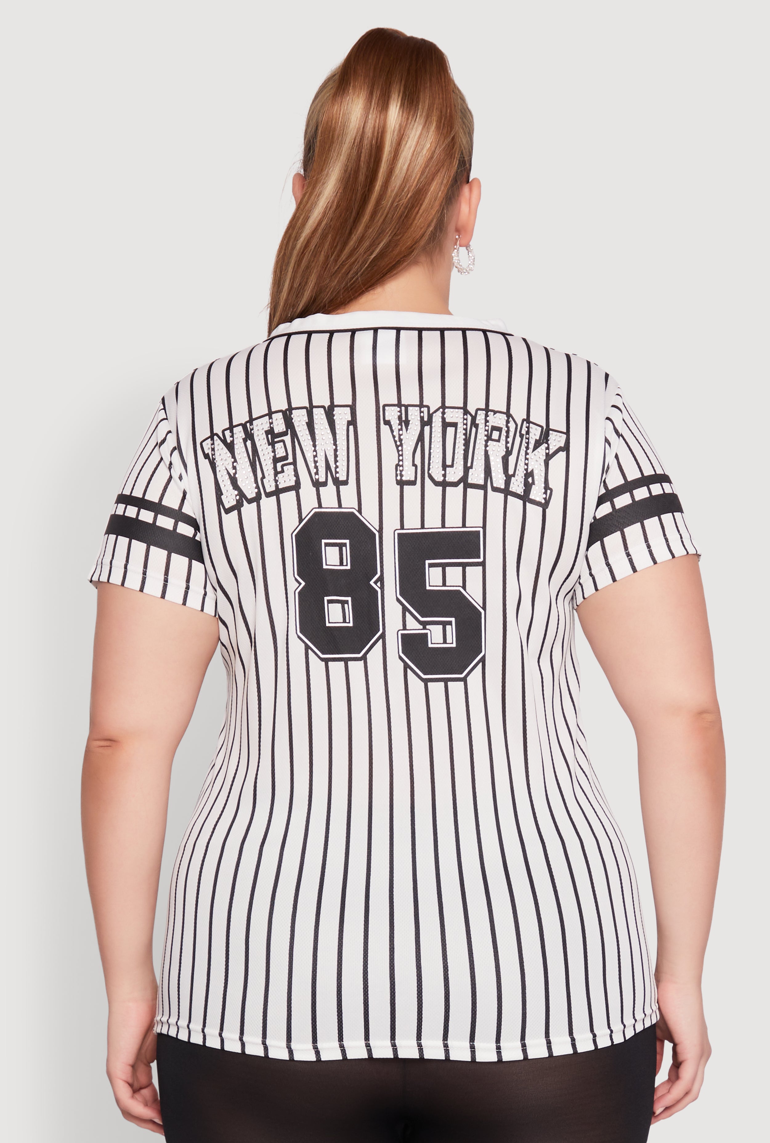 Looking for a stylish way to elevate your everyday look? Our Plus Size Striped New York Print Jersey Mesh Tee is the perfect blend of comfort and fashion. With its classic fit and timeless silhouette, this tee is designed to keep you feeling confident and looking fresh. Featuring a vibrant New York print and fun varsity stripe detail, it adds a touch of city chic to any outfit. The lightweight jersey mesh material keeps you cool while the V-neck and short sleeves make it ideal for any season. Whether you're out with friends or just relaxing, this versatile tee is a must-have in your wardrobe.