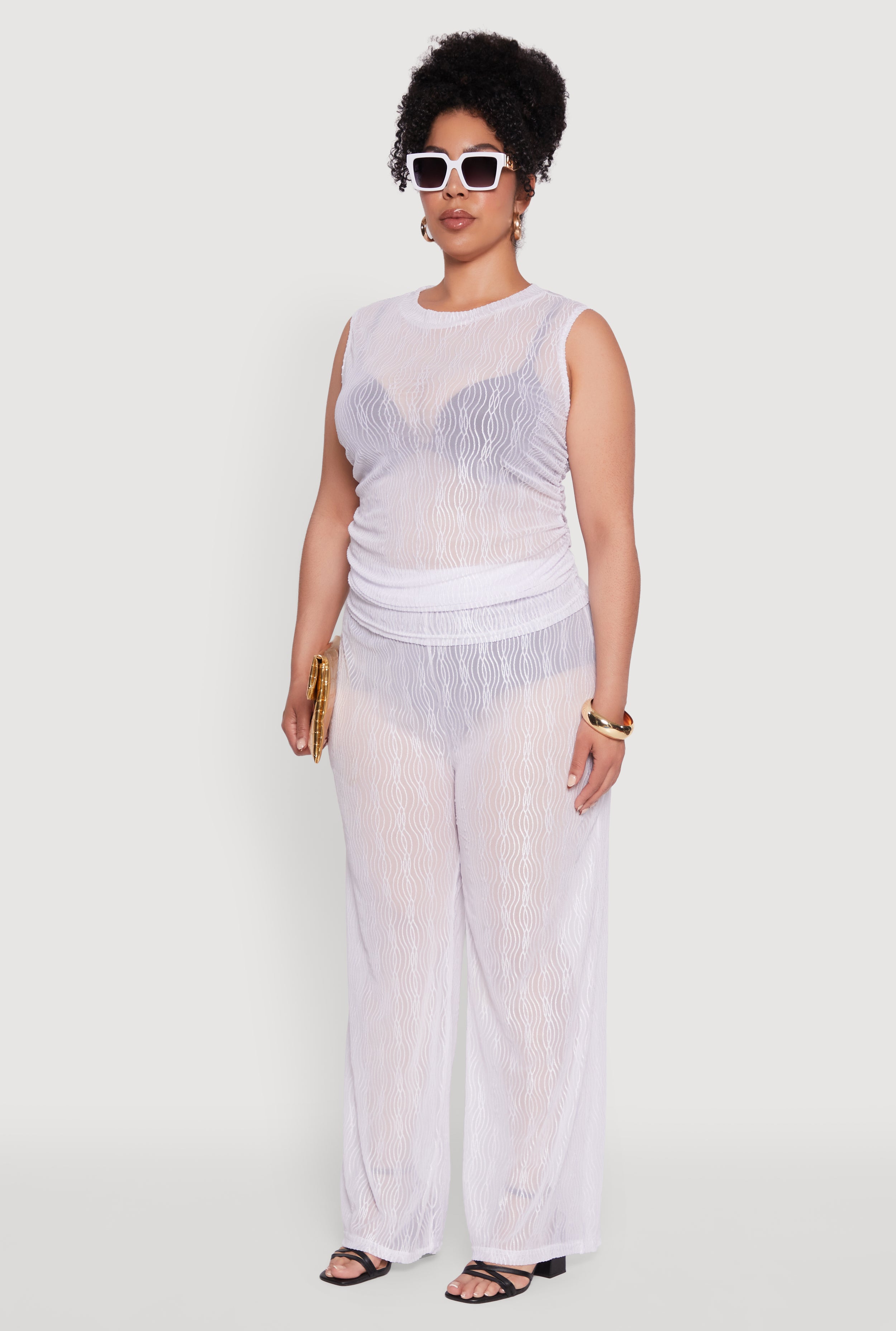 Upgrade your wardrobe with this Plus Size Trendy Wavy Stripe Mesh Sleeveless Top that effortlessly combines style and comfort. Featuring a chic high neckline and a flattering classic fit, this blouse is perfect for making a statement whether you're dressing up or down. The sheer mesh fabric with eye-catching wavy stripes adds a playful touch to your look, making it a must-have for fashion-forward queens. Pair it with your favorite accessories and you're ready to turn heads wherever you go.