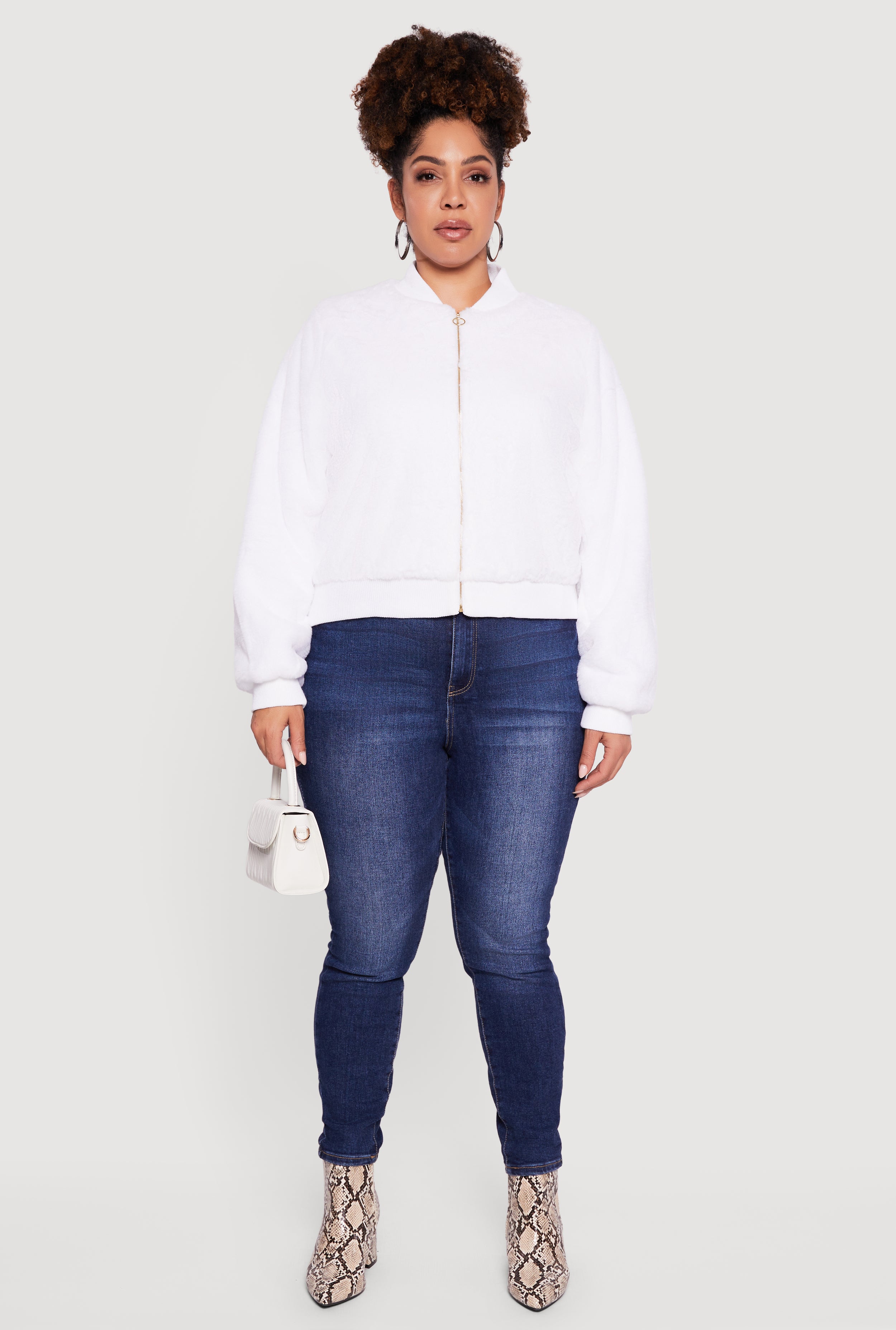 Cozy up in style with this Plus Size Zip Front Faux Fur Bomber Jacket. Designed to keep you warm without sacrificing fashion, this jacket features a soft faux fur texture and a sleek mandarin collar for a modern twist. The zip front closure adds convenience and edge, making it perfect for casual days or officewear with a trendy vibe. Embrace comfort and confidence with a jacket that fits your curves and your mood.