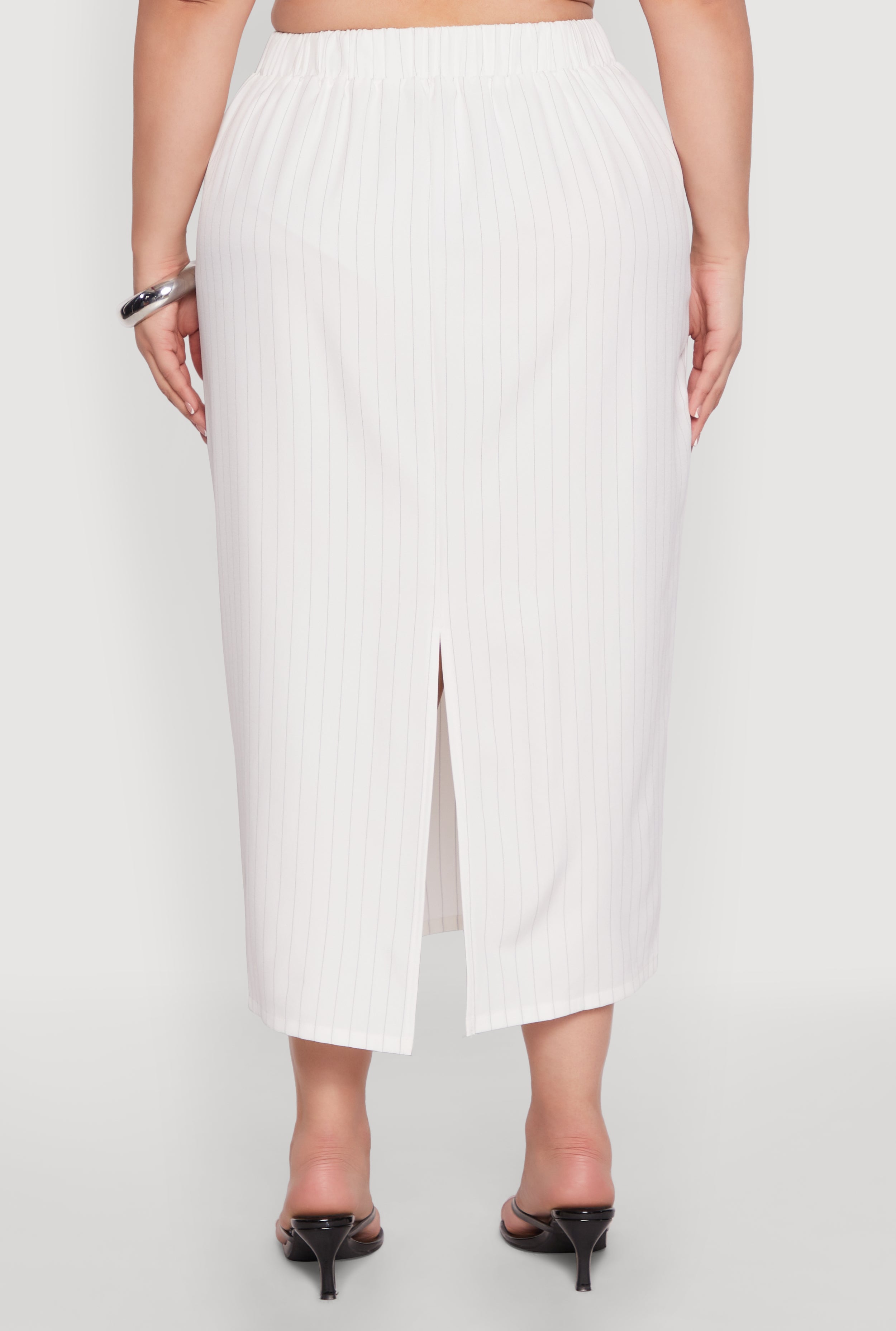 Step into confidence and style with our Plus Size Pinstripe High Waist Skirt. Designed to flatter your curves, this maxi-length pencil skirt features a chic pinstripe pattern and a comfortable elastic waistband. The back slit adds a touch of flirtiness, making it perfect for both casual outings and dressier sets. Elevate your wardrobe effortlessly and embrace your unique style with this must-have piece that combines comfort and fashion in one sleek package.