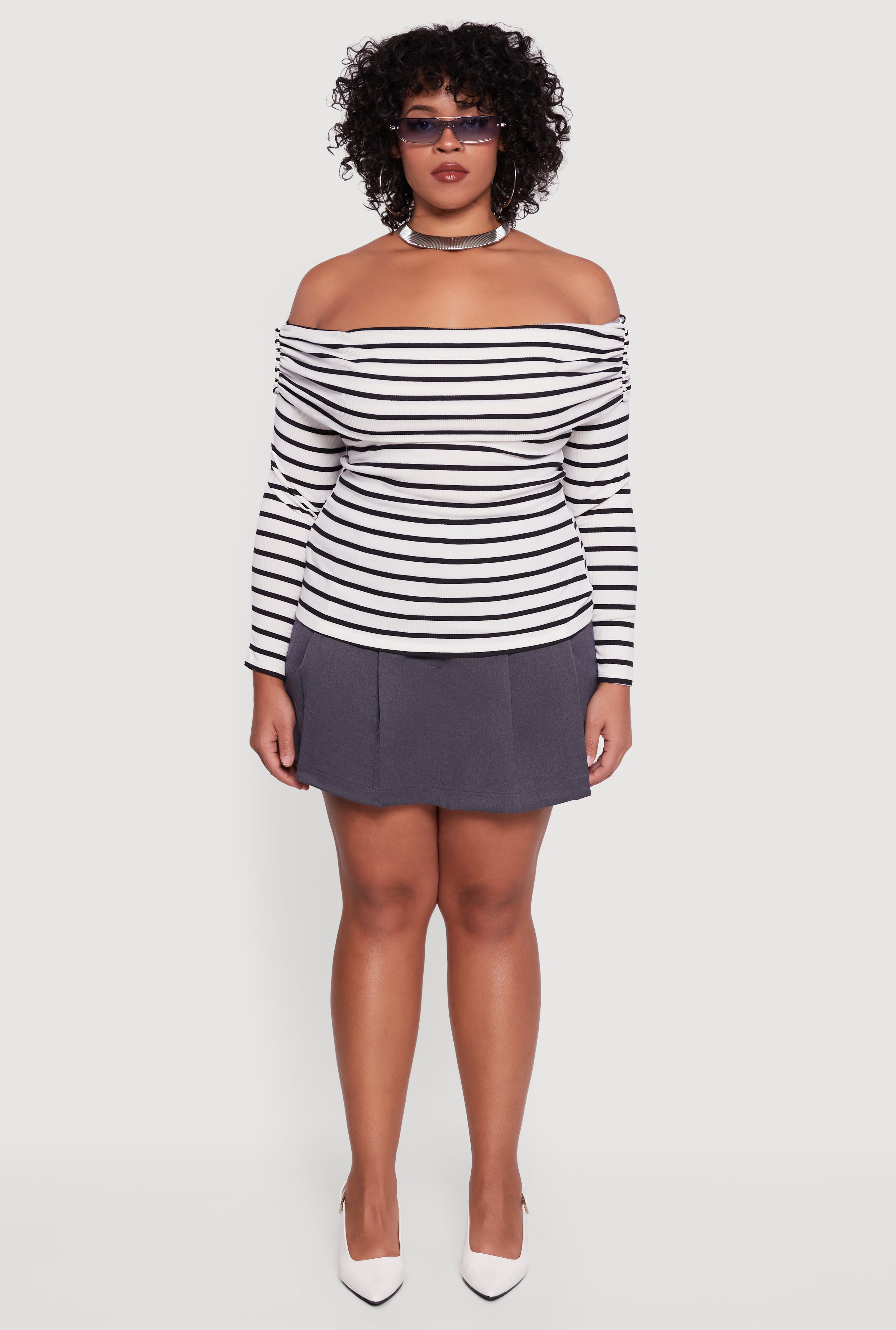 Step up your style game with this Plus Size Striped Ribbed Knit Fold Over Off Shoulder Top. Designed to hug your curves with a classic fit, this long sleeve top features a trendy off-the-shoulder neckline and a fold-over detail that adds a flirty twist. The ribbed knit fabric offers cozy comfort and a flattering silhouette, making it perfect for casual days when you want to look effortlessly chic. Pair it with your favorite jeans or skirt to create a standout look that’s both stylish and comfortable.