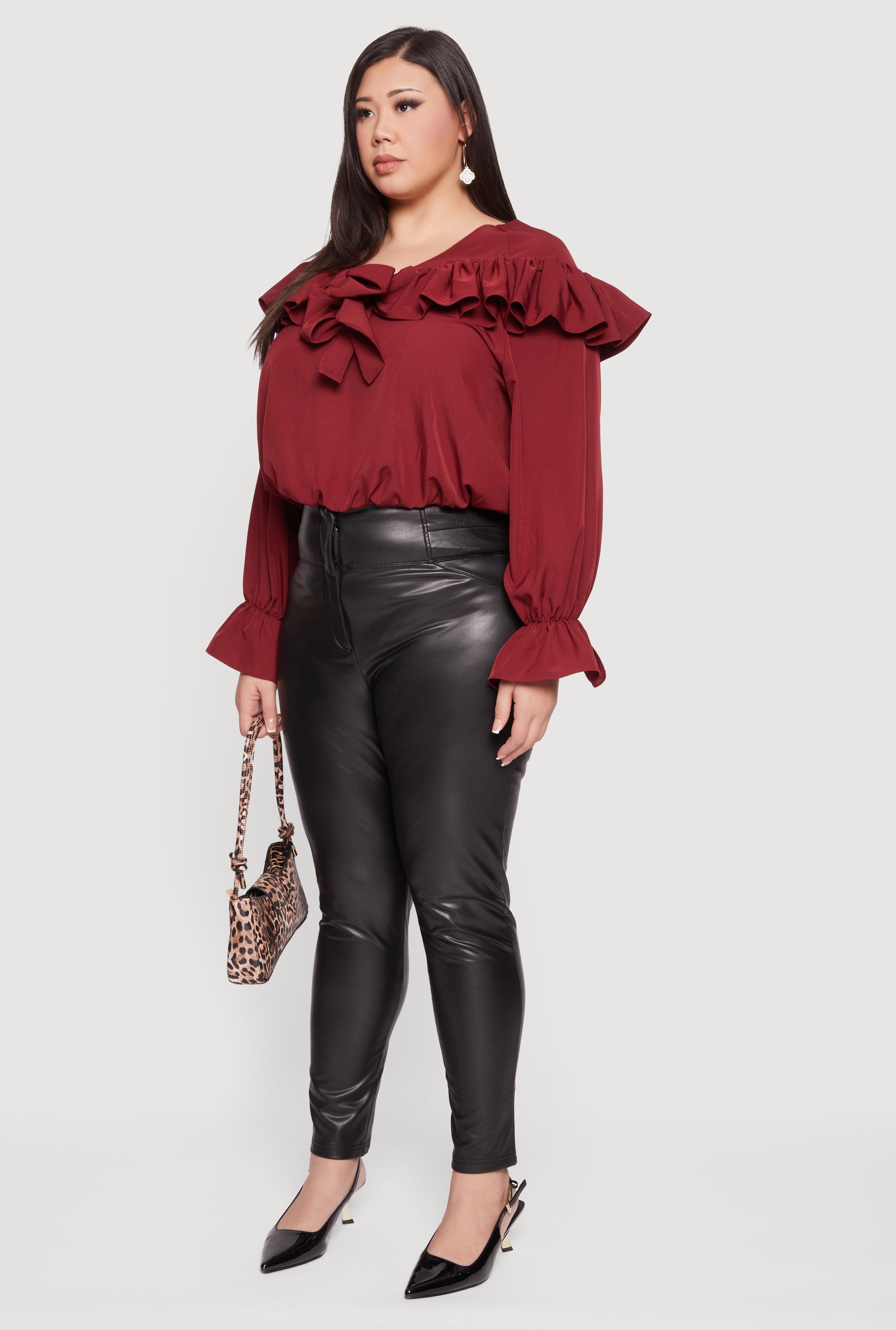 Plus Size Bell Sleeve Tie Front Ruffle Trim Blouse