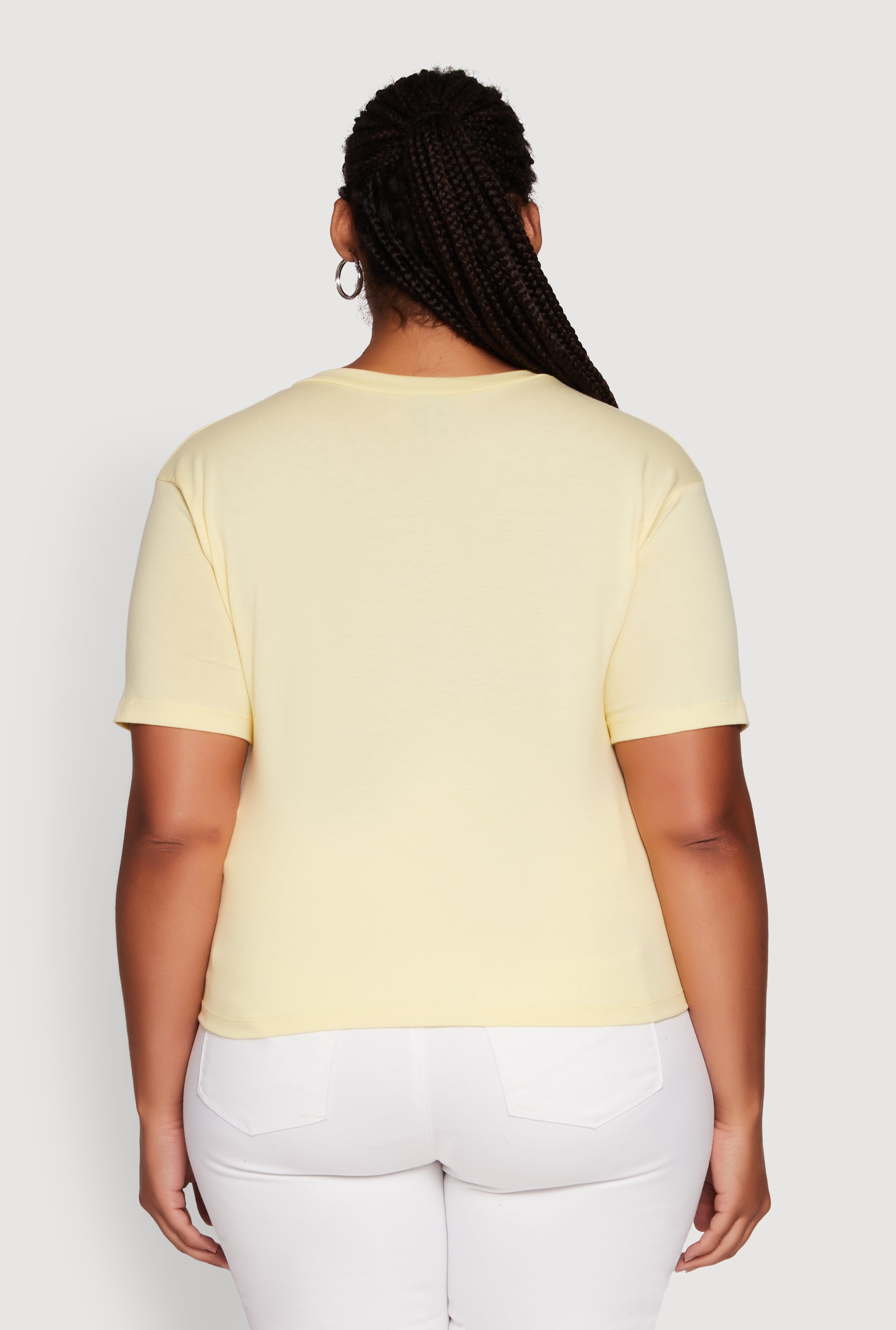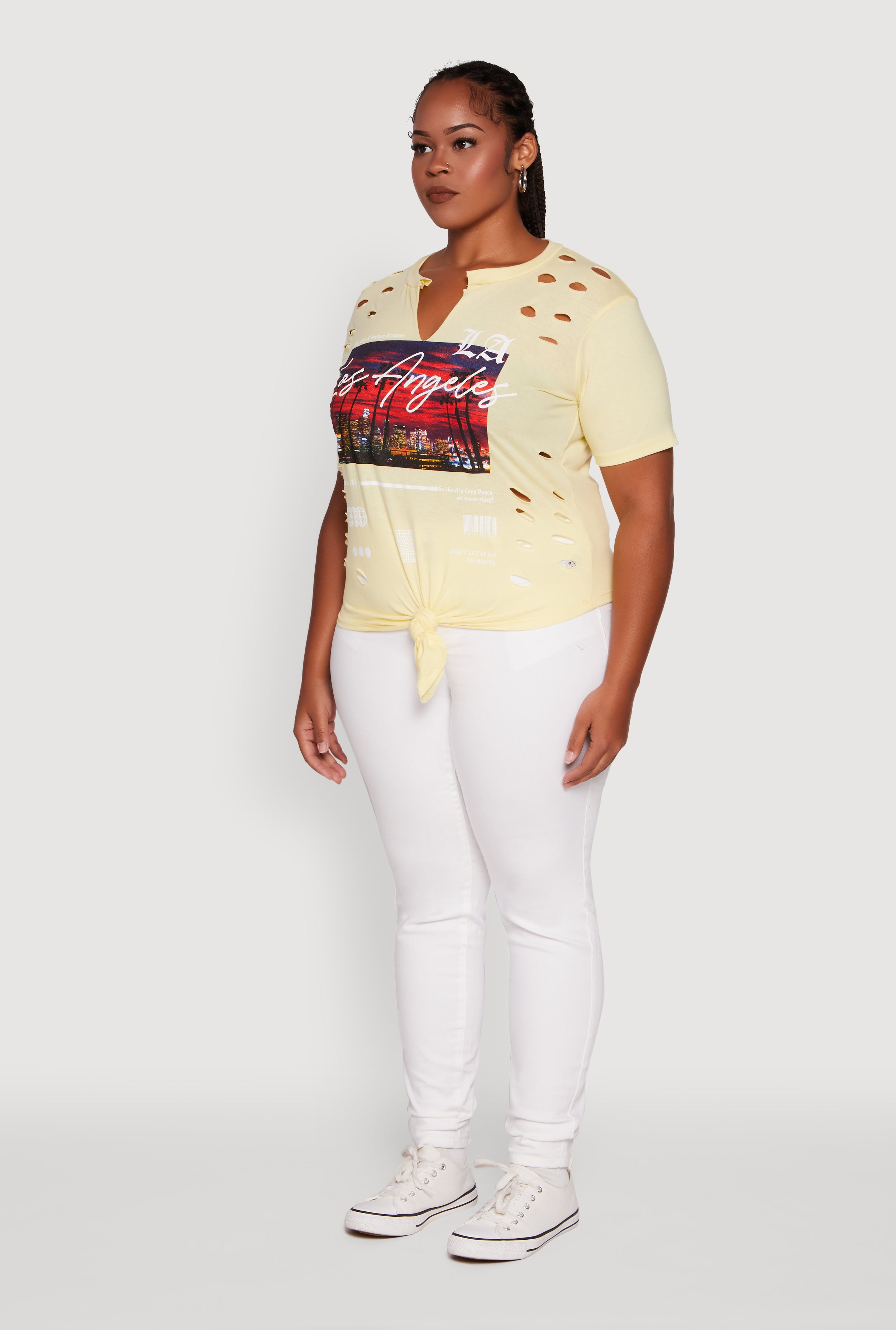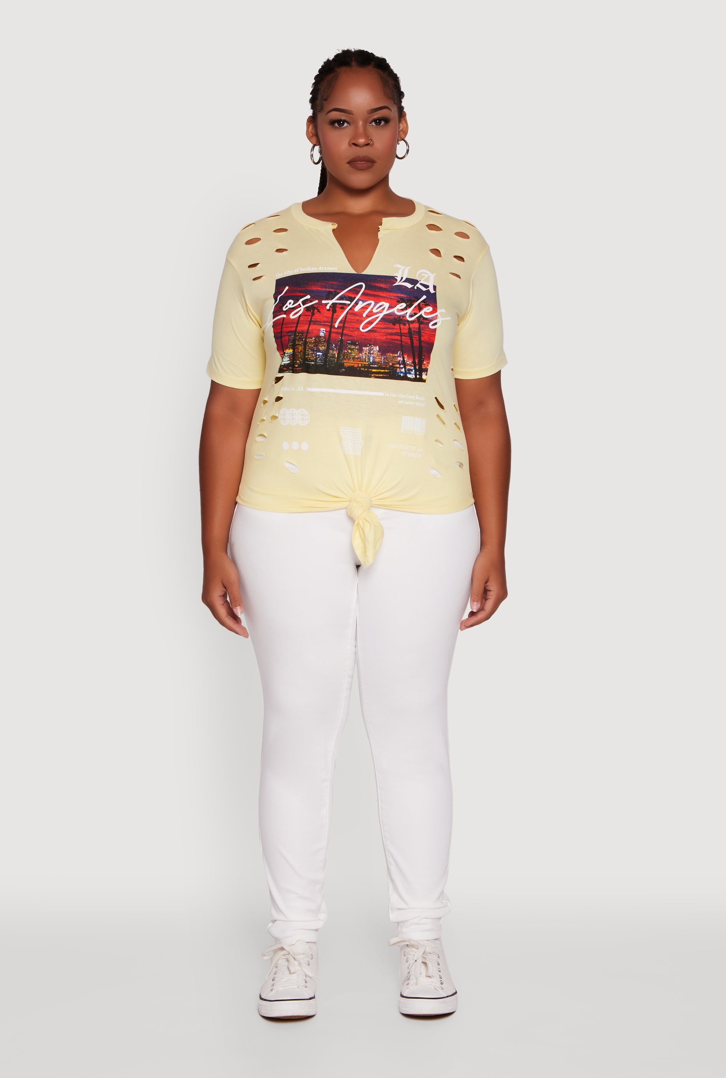 Step out in style with this Plus Size Cut Out Los Angeles Graphic Knot Front Tee. Featuring a bold "The City Of Broken Dreams LA Los Angeles" graphic, this tee brings a fresh streetwear vibe to your casual wardrobe. The classic fit and notch neck create a timeless silhouette, while the trendy knot front and laser cut details add a playful edge. Perfect for chill days or city adventures, this tee is your new go-to for effortless cool.