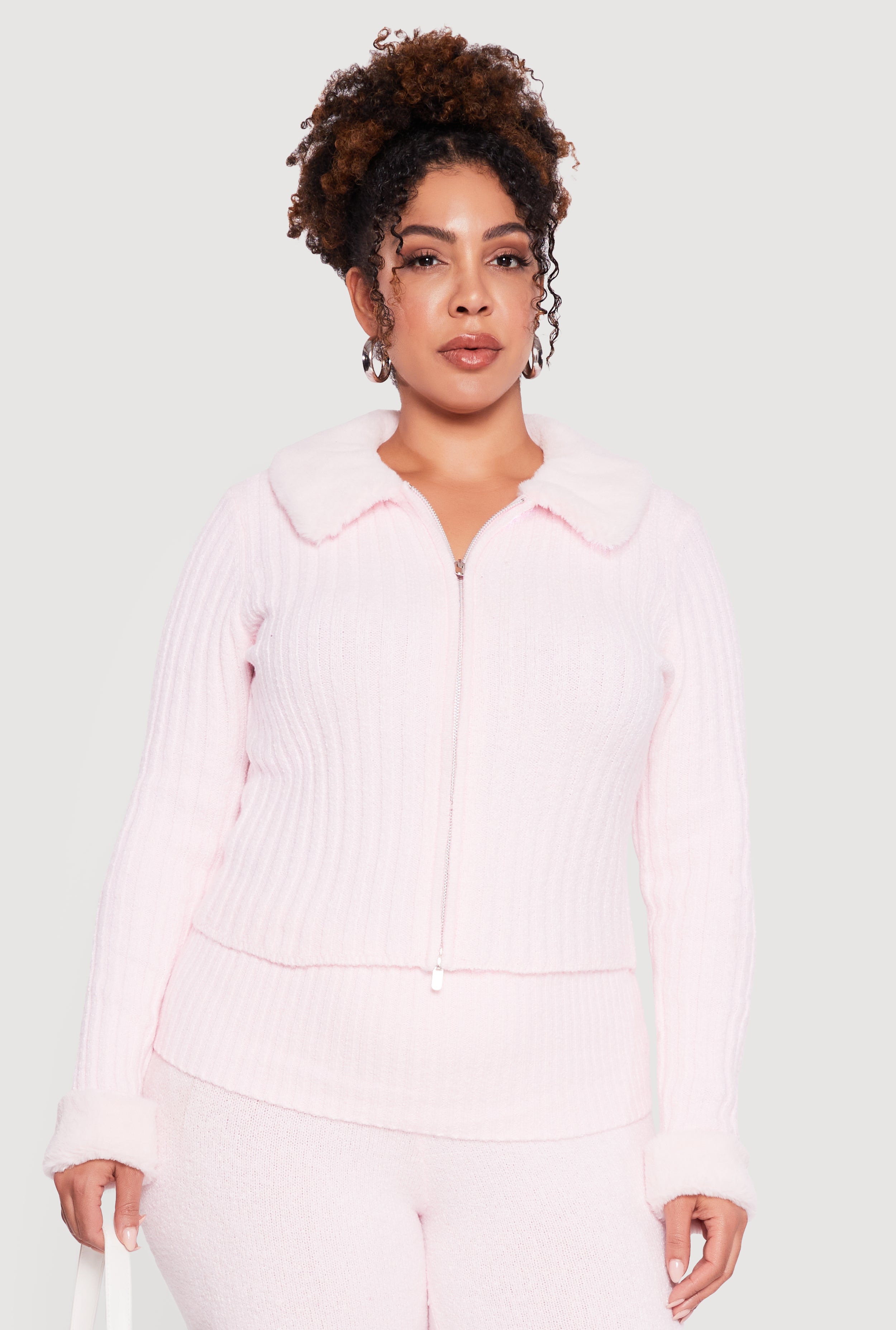 Plus Size Removable Faux Fur Trim Zip Front Sweater