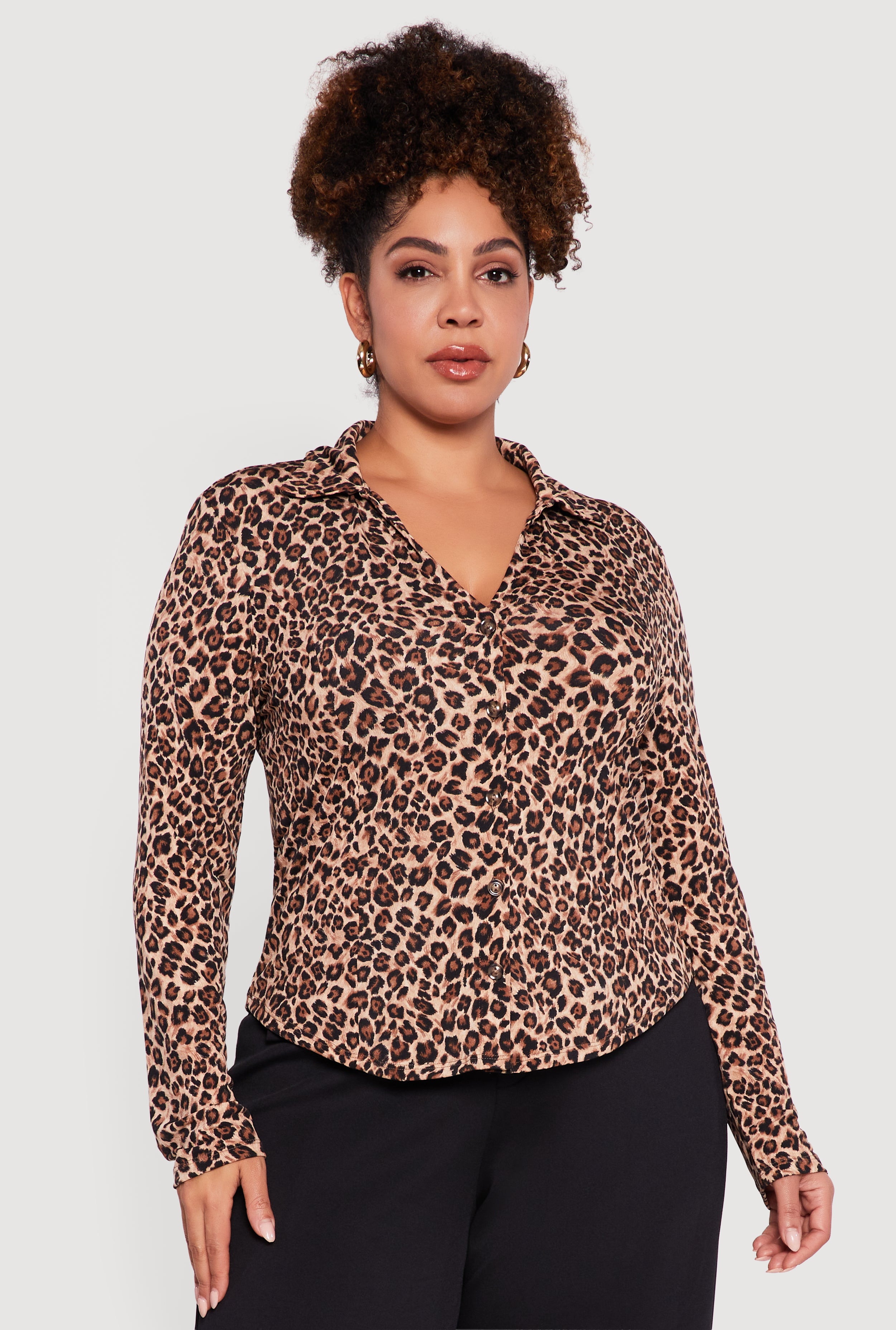 Plus Size Leopard Print Long Sleeve Button Front Shirt