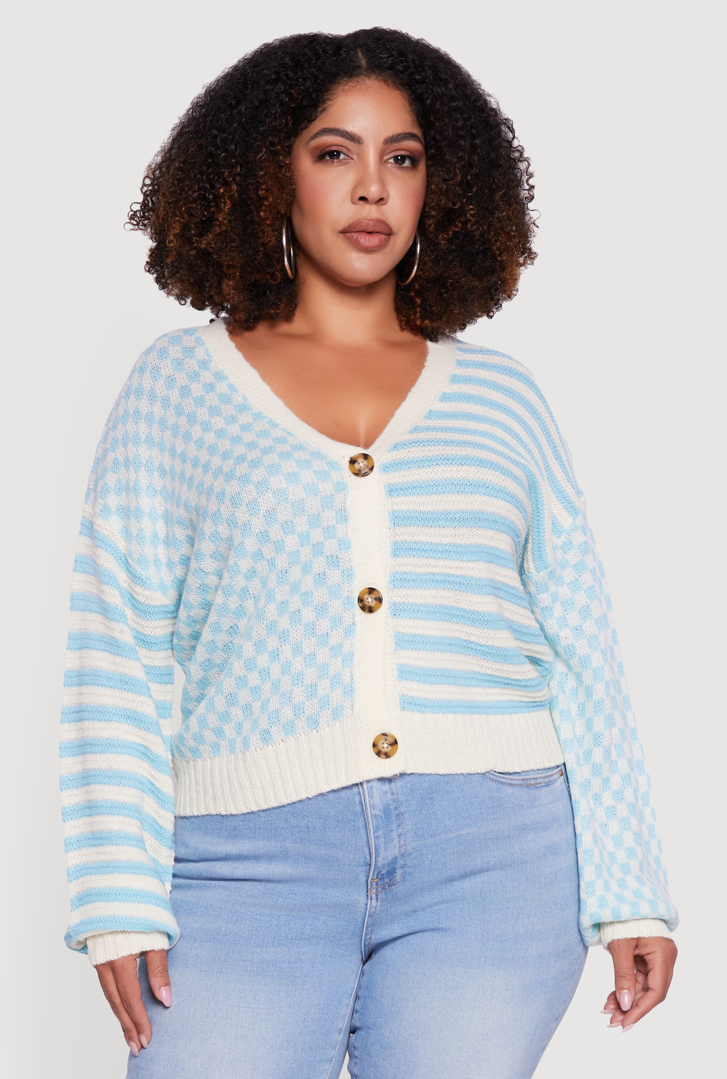 Plus Size Color Blocked Checkered Stripe Cardigan