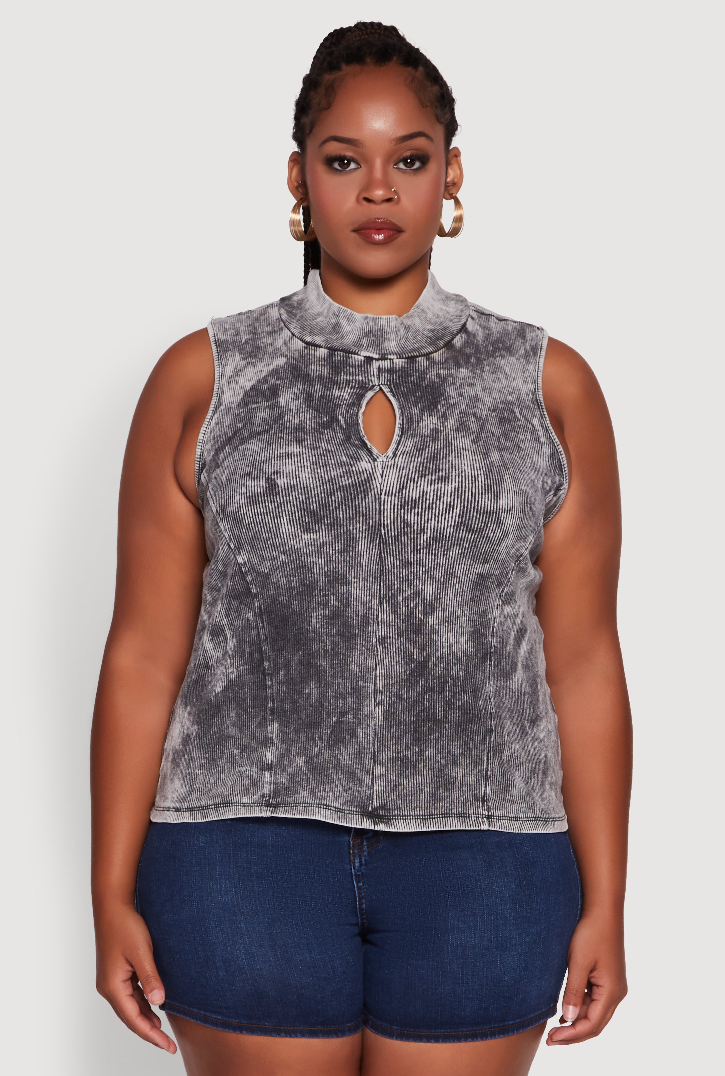 Plus Size Acid Wash Keyhole Mock Neck Tank Top