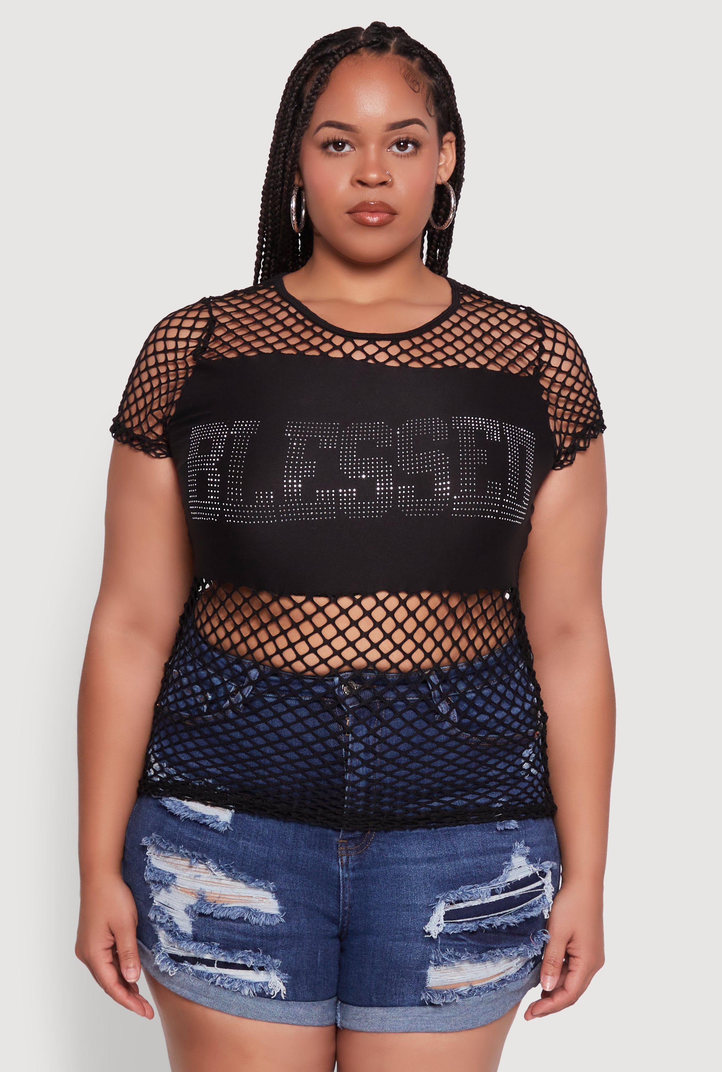 Plus Size Blessed Rhinestone Fishnet Top with Crew Neck