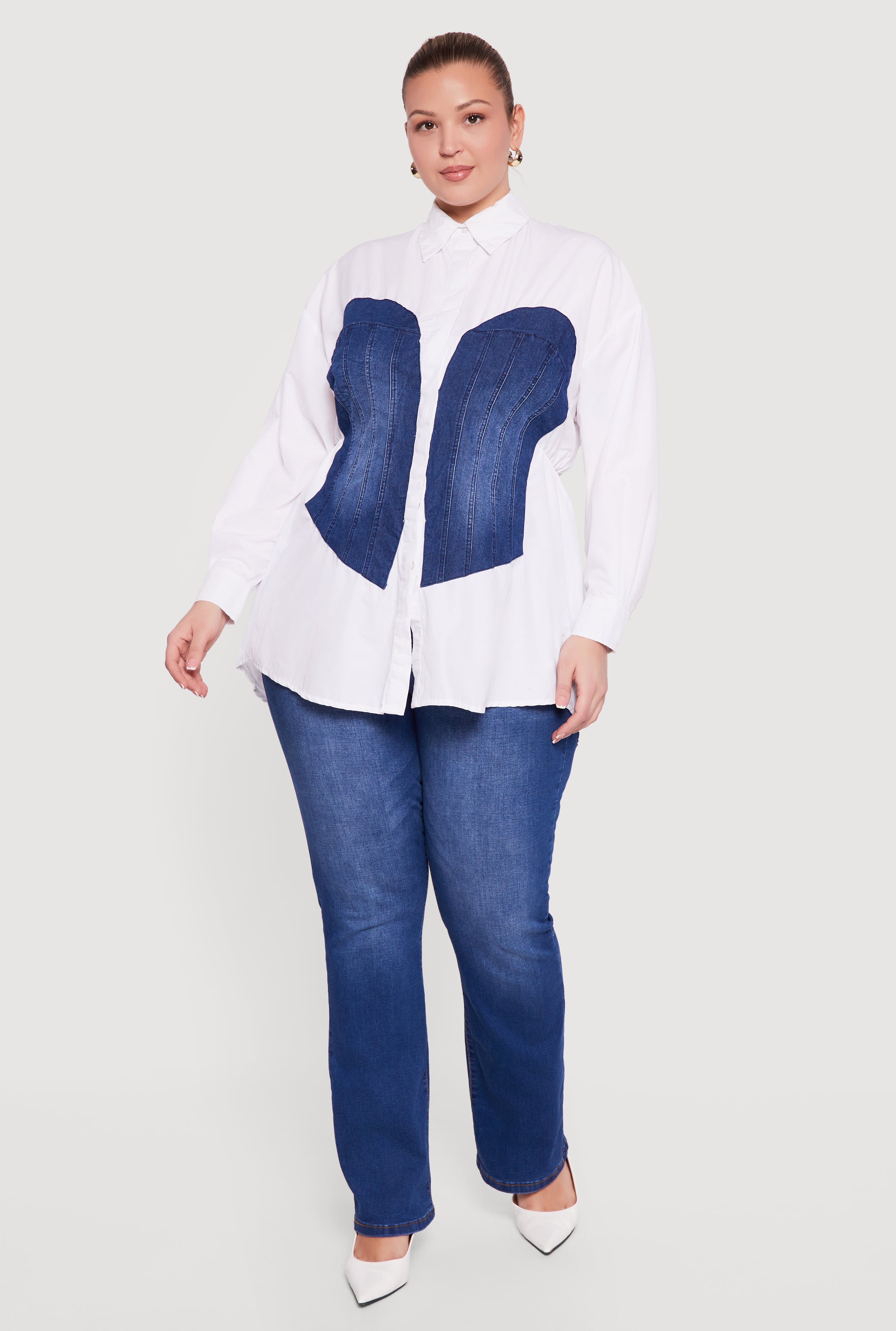 Plus Size Denim Corset Detail Button Down Long Sleeve Blouse