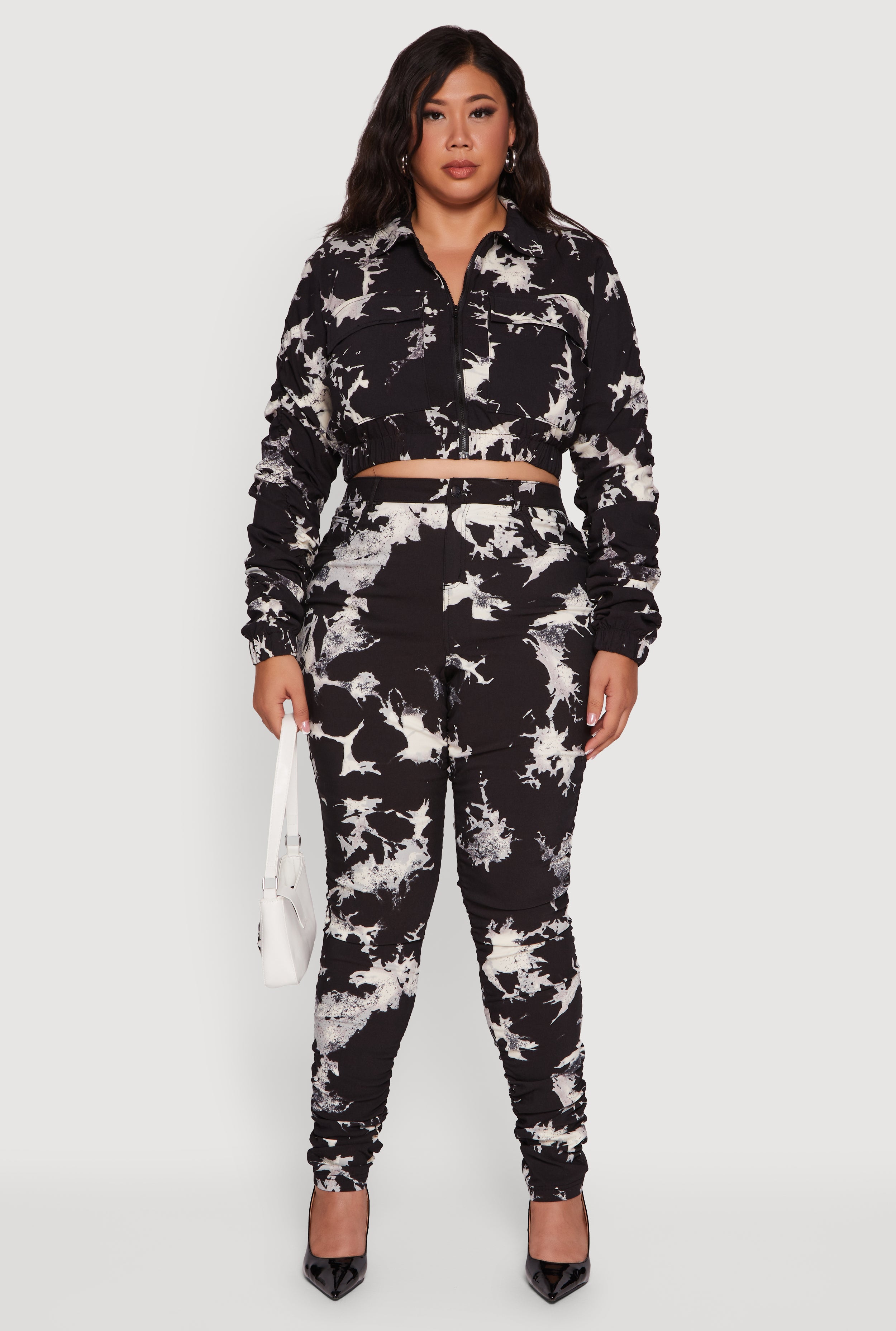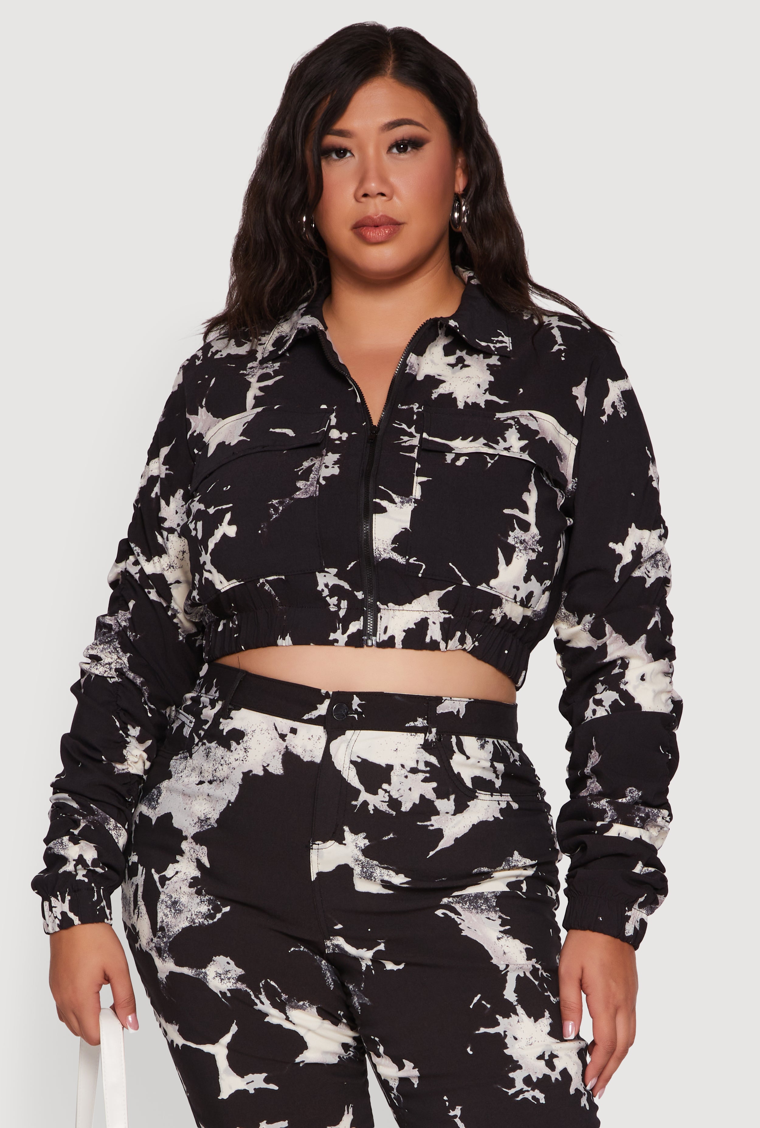 Plus Size Side Ruched Patterned Zip Front Cropped Jacket