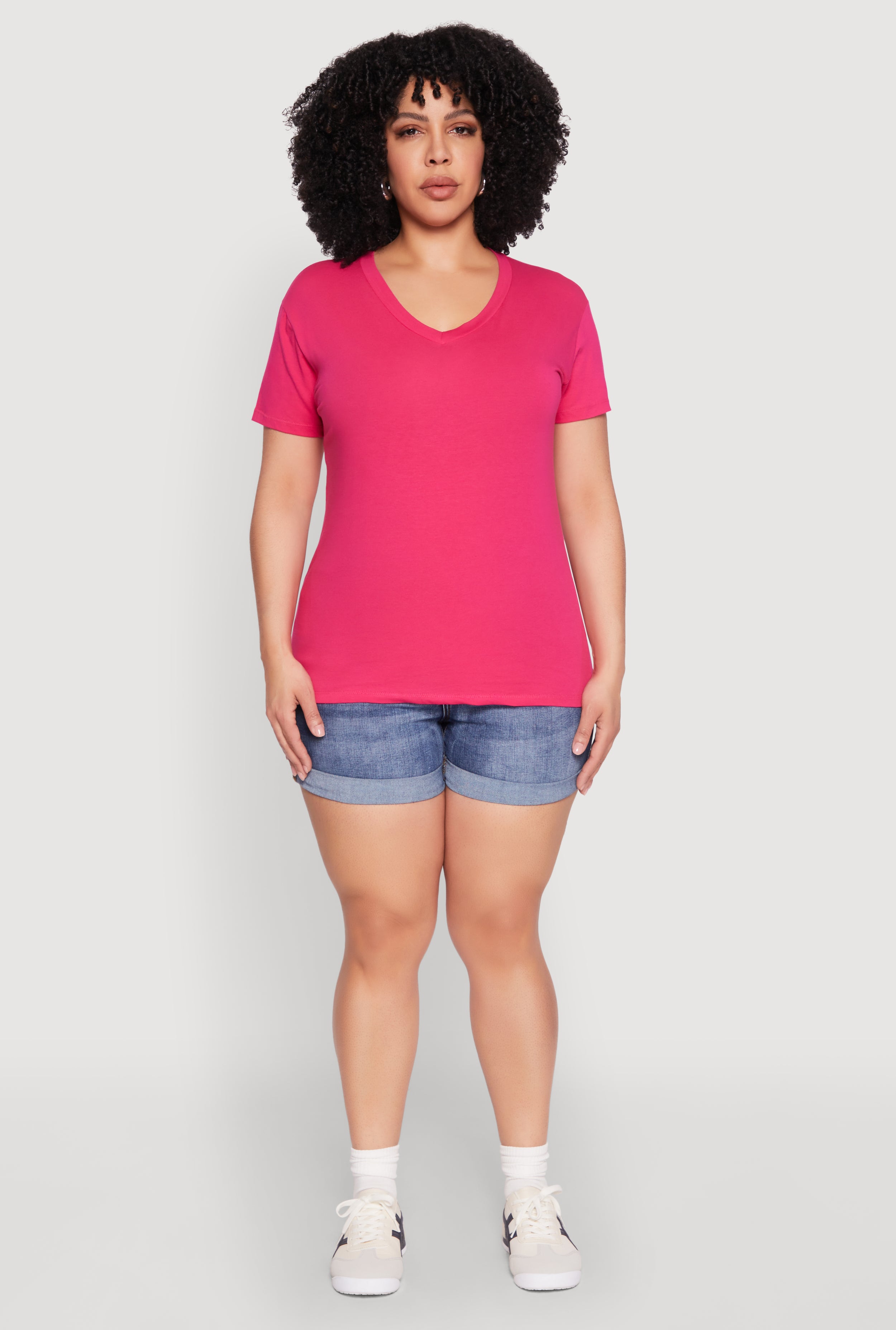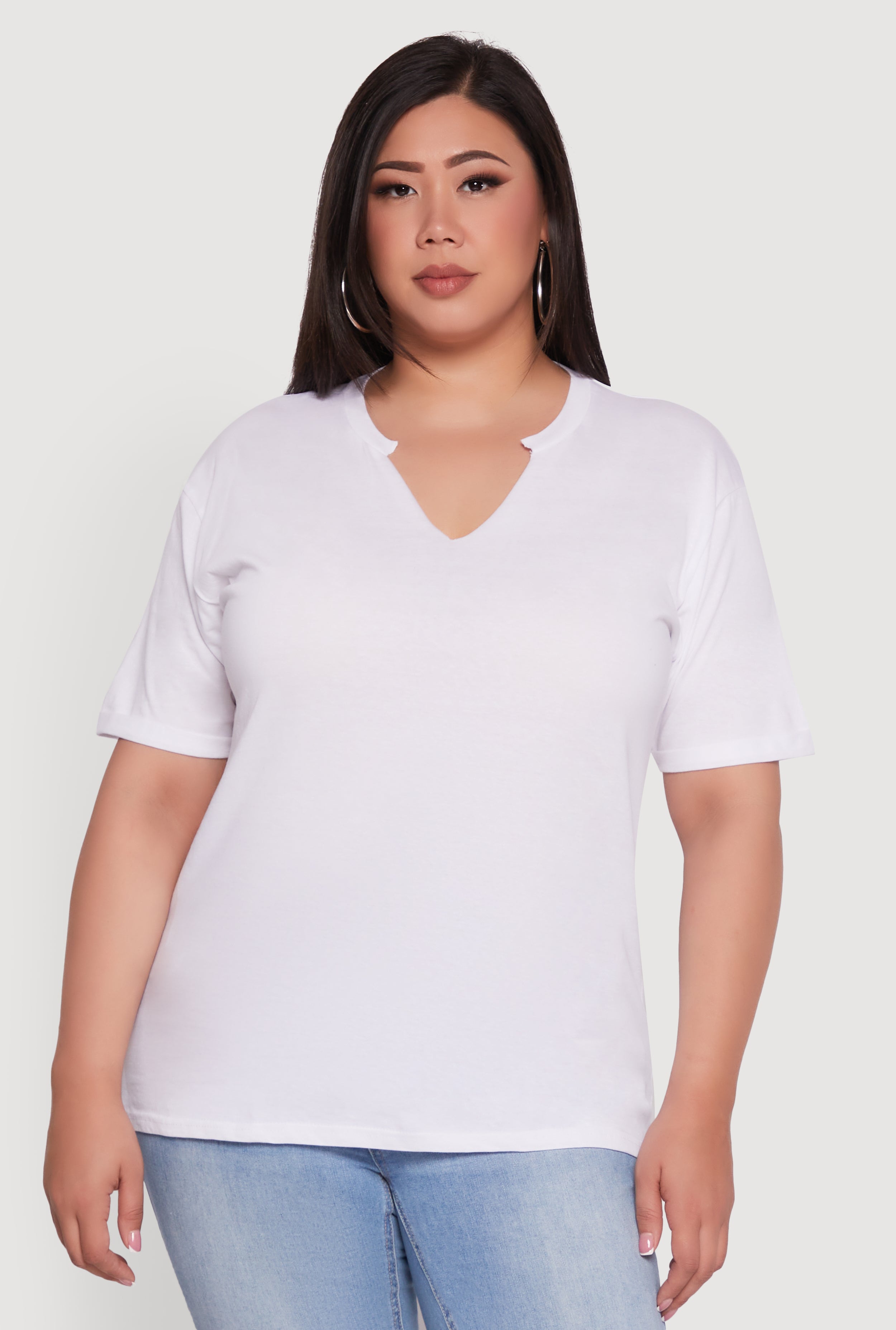 Plus Size Basic Fixed Cuff Notch Neck Tee