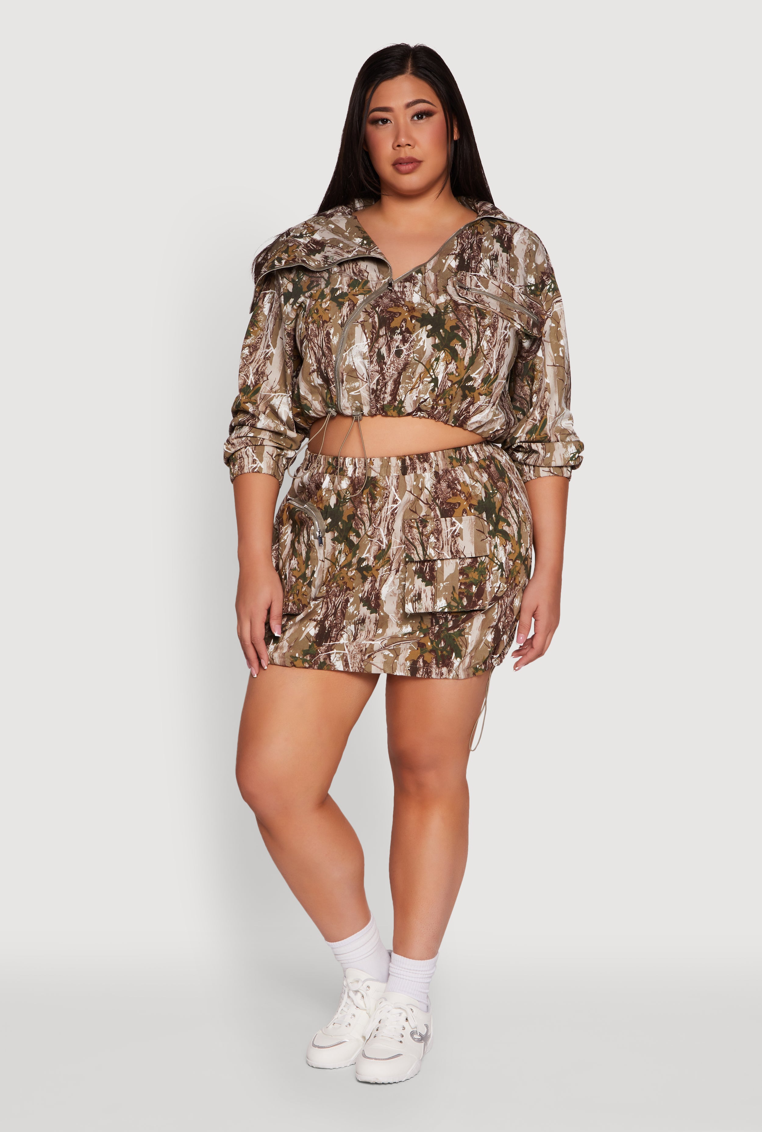 Plus Size Hunter Camo Zip Front Drawstring Hem Jacket