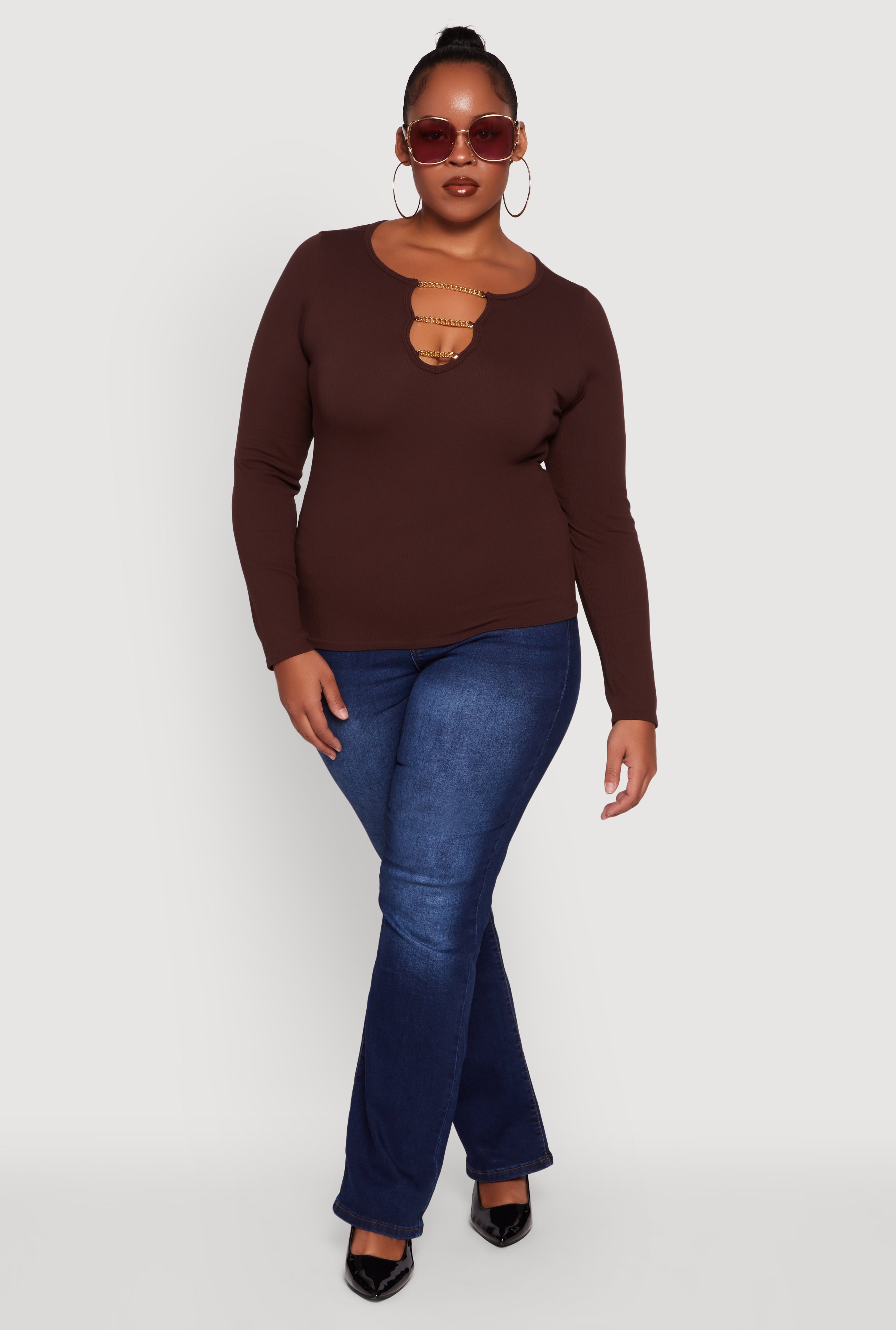 Plus Size Rib Knit Metallic Chain Keyhole Neckline Top