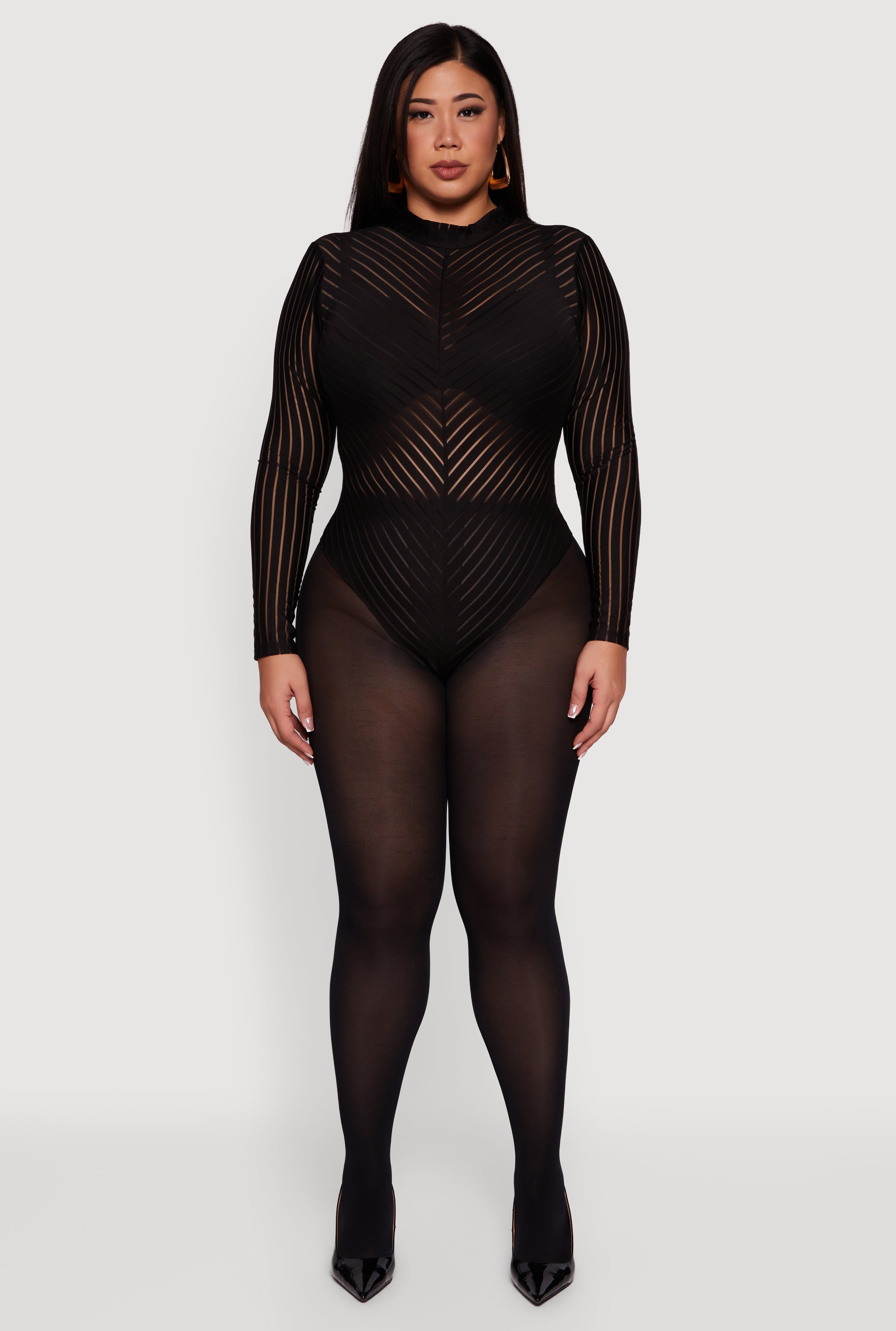 Plus Size Shadow Stripe Mesh Mock Neck Bodysuit
