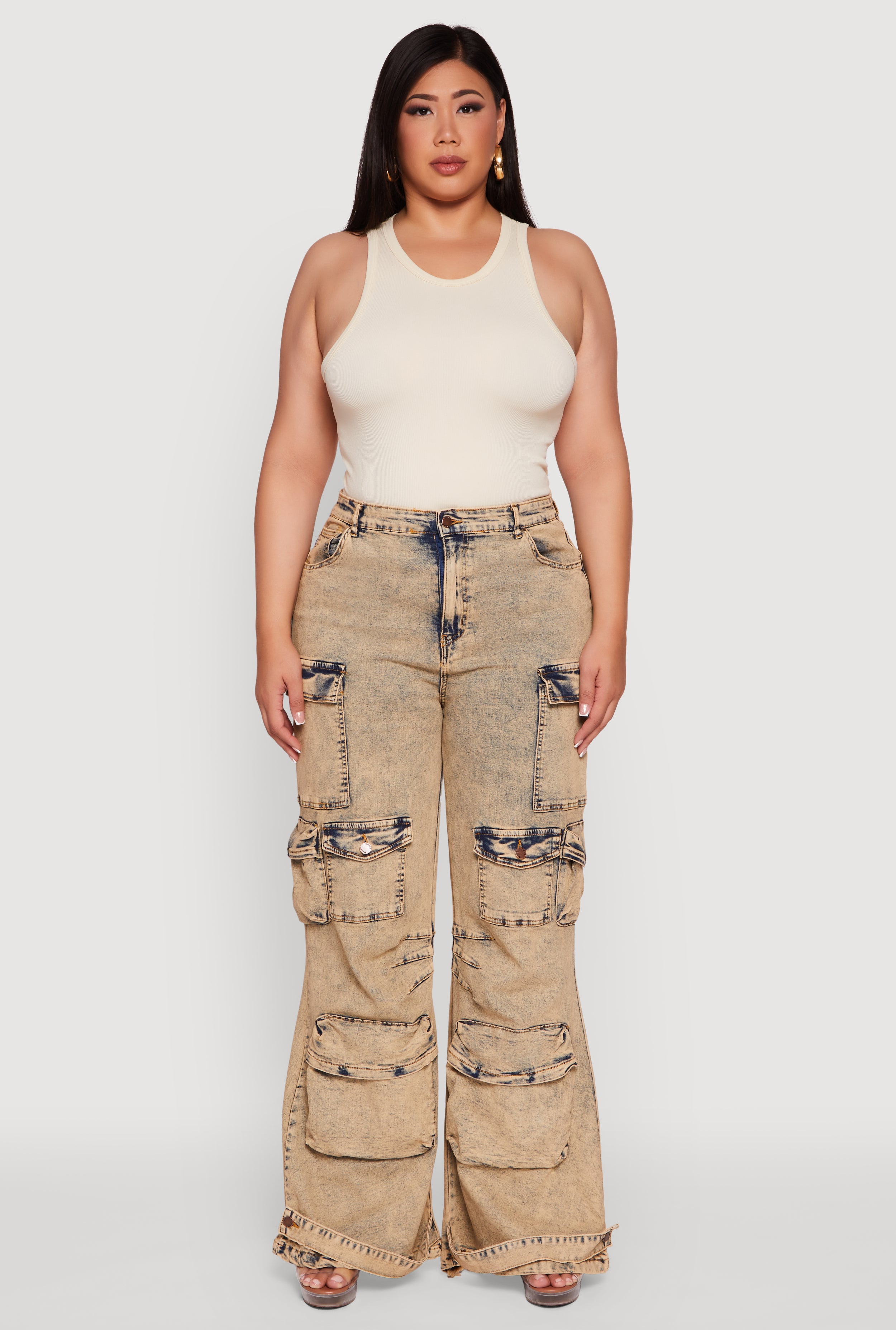 Plus Size Acid Wash High Waisted Wide Leg Utility Jeans