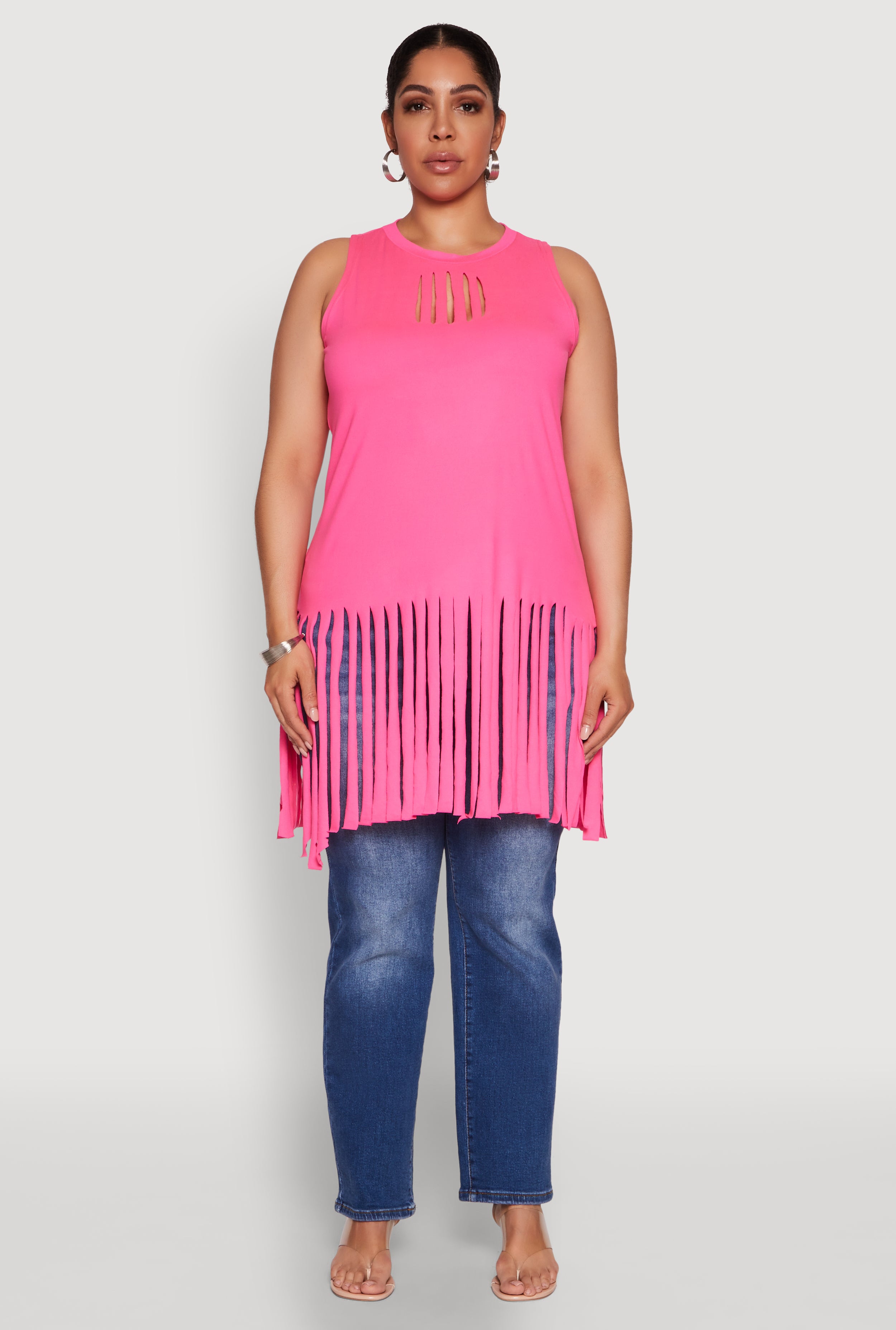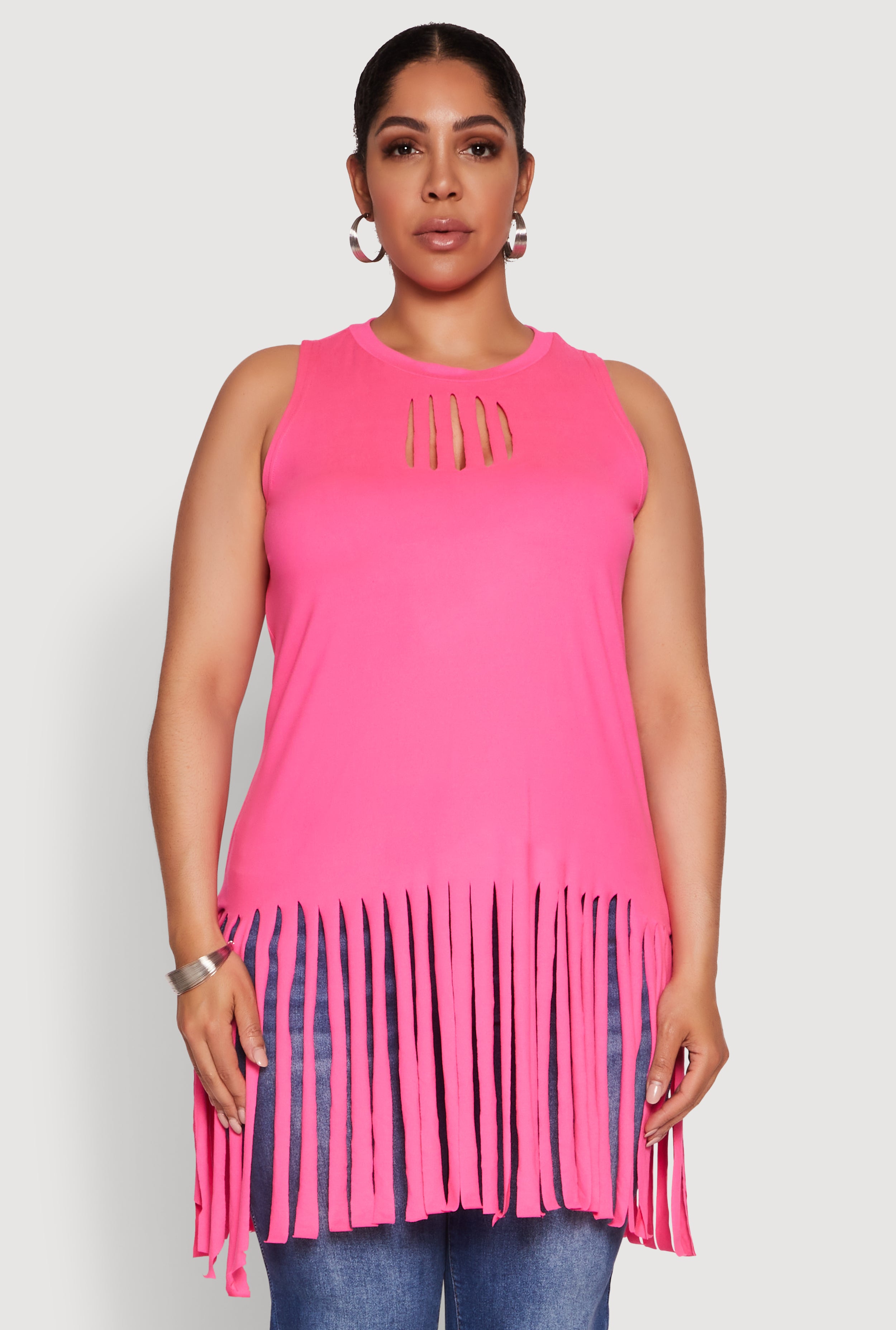 Plus Size Laser Cut Fringe Hem Tank Top