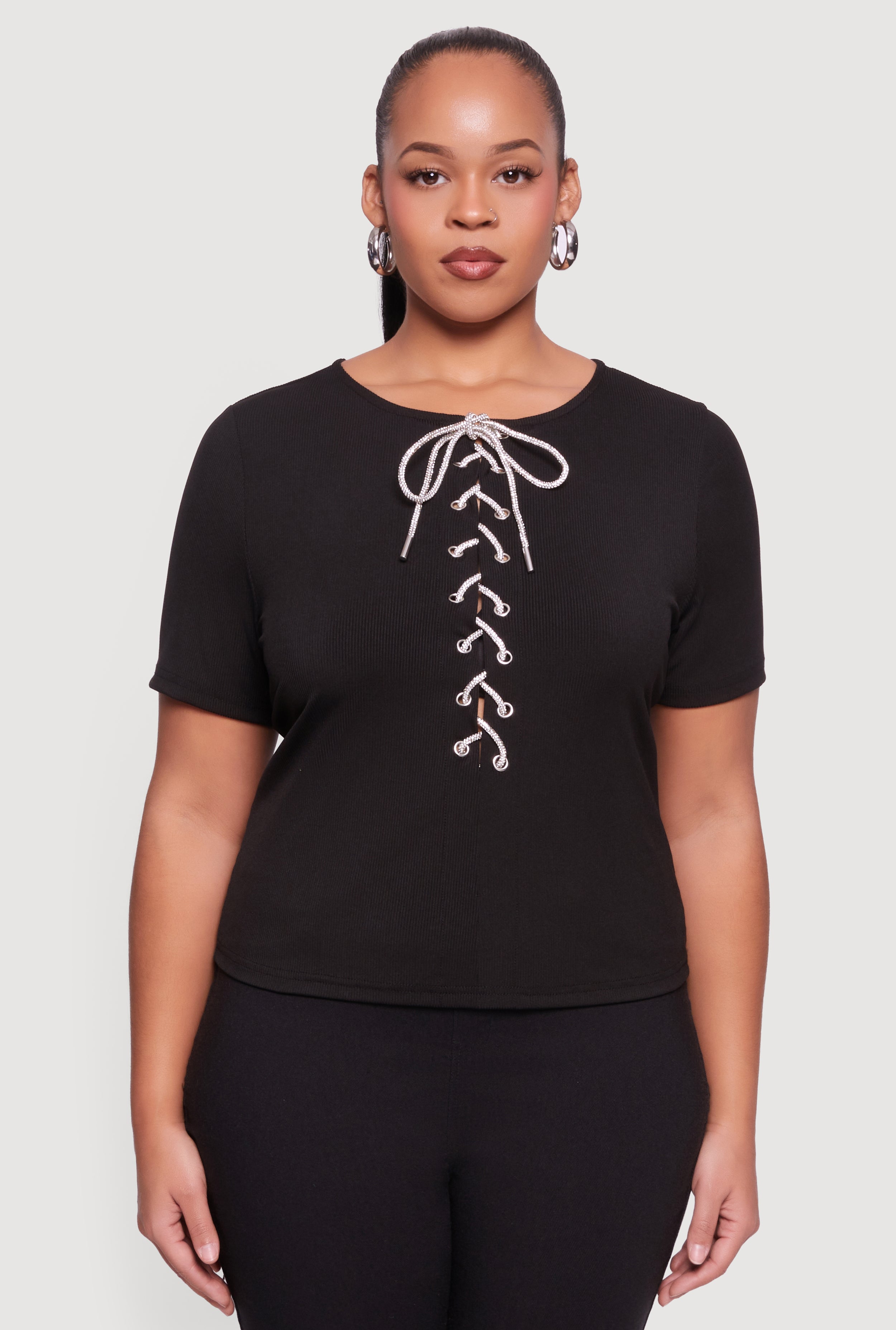 Plus Size Rhinestone Lace Up Front Ribbed Knit Top