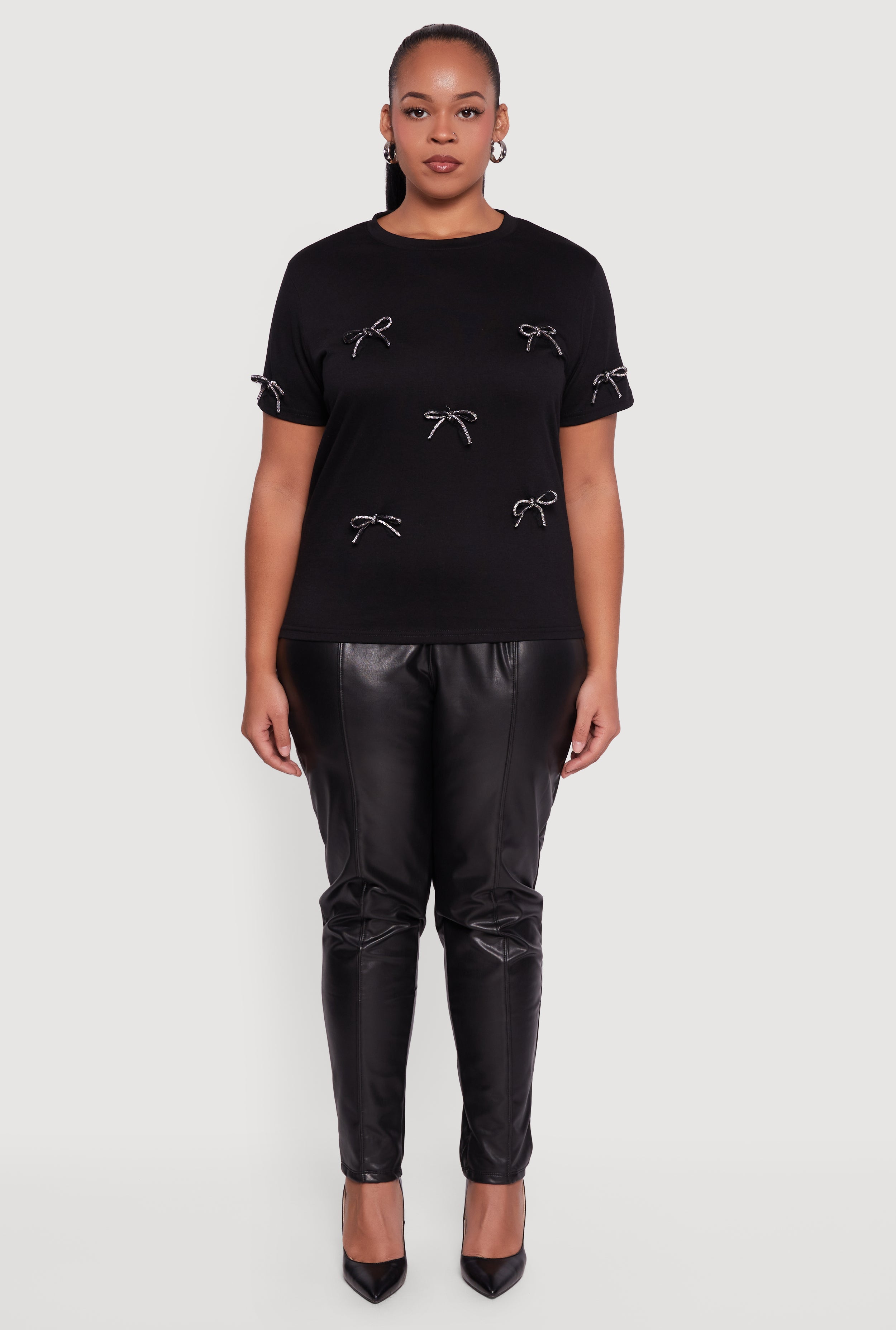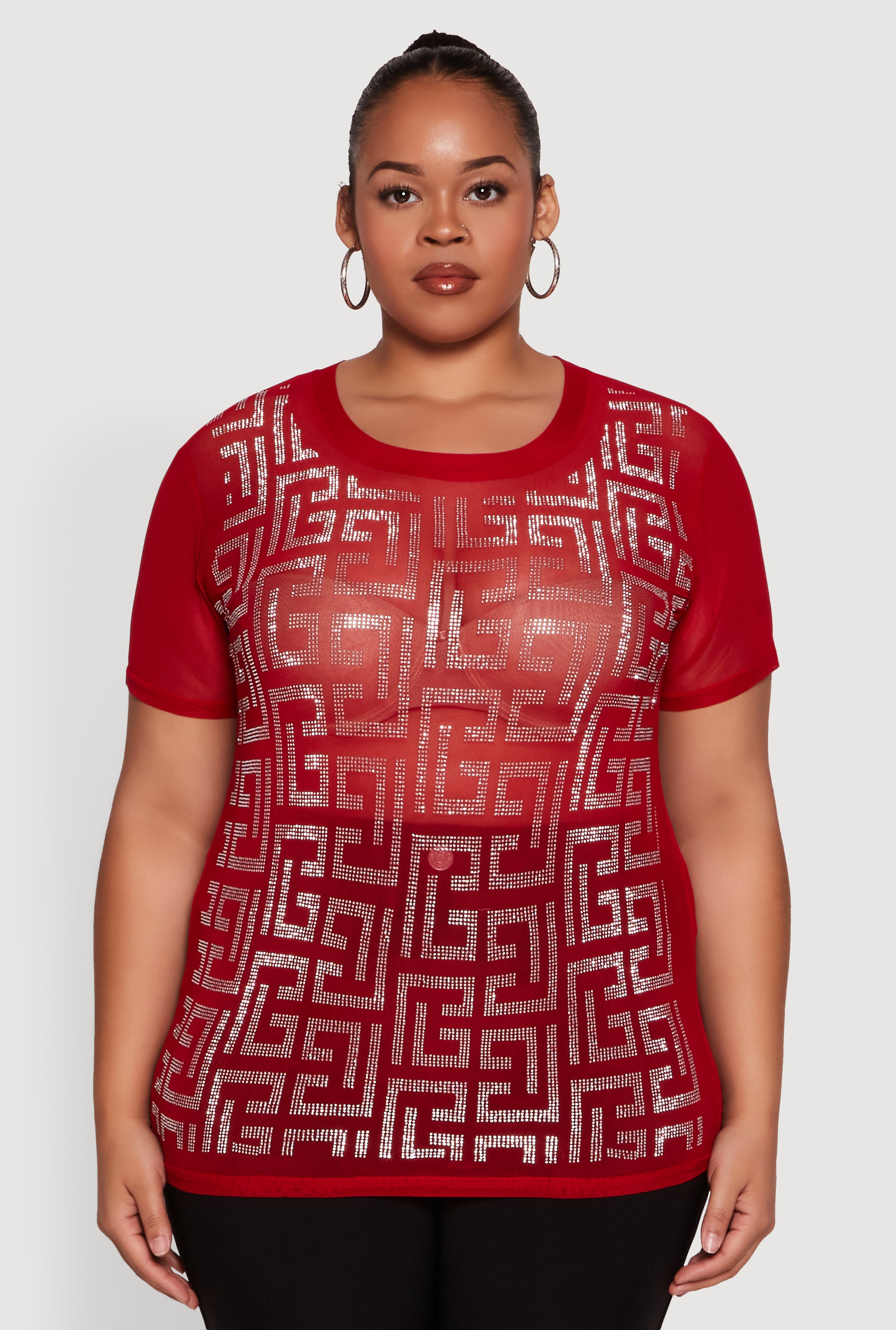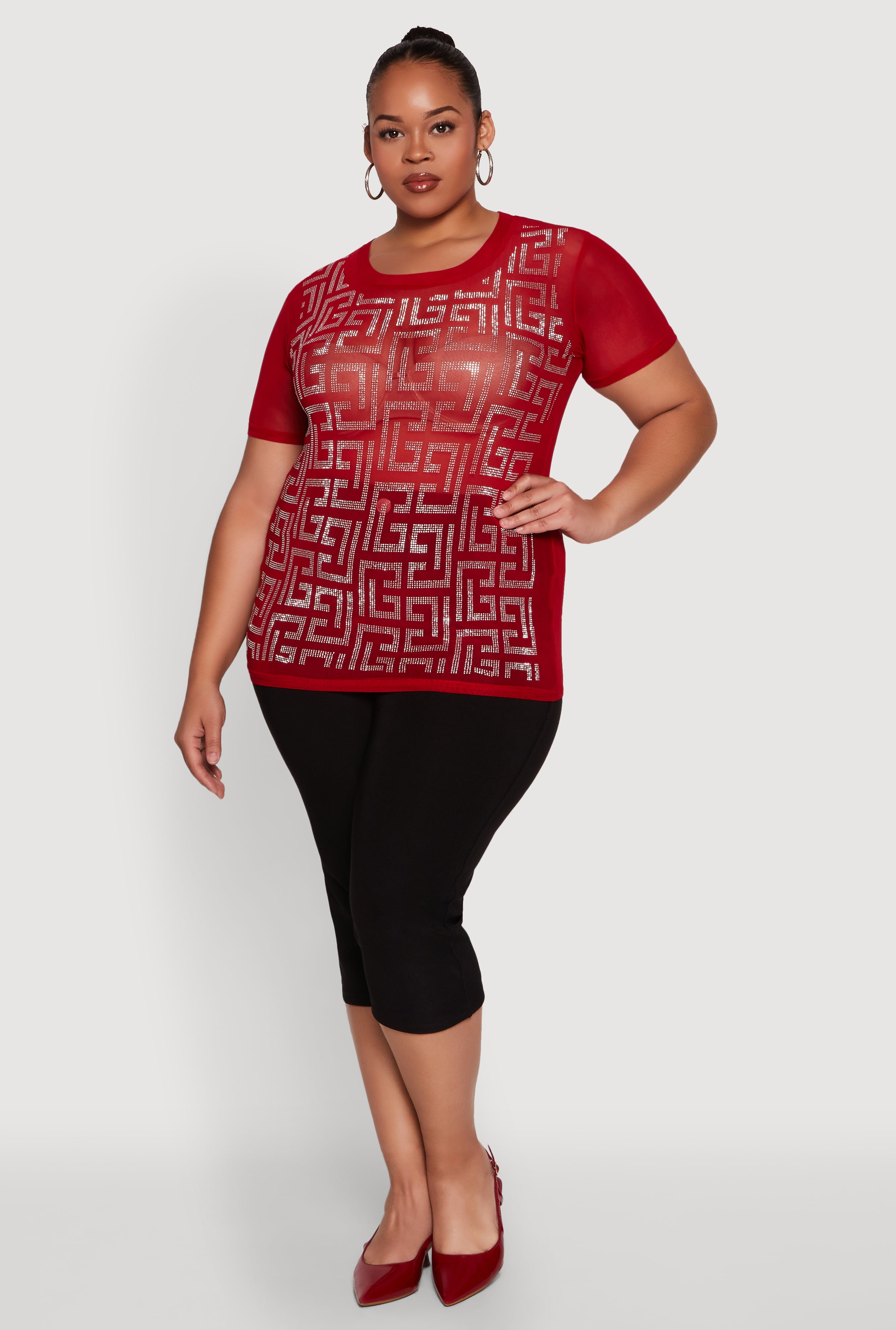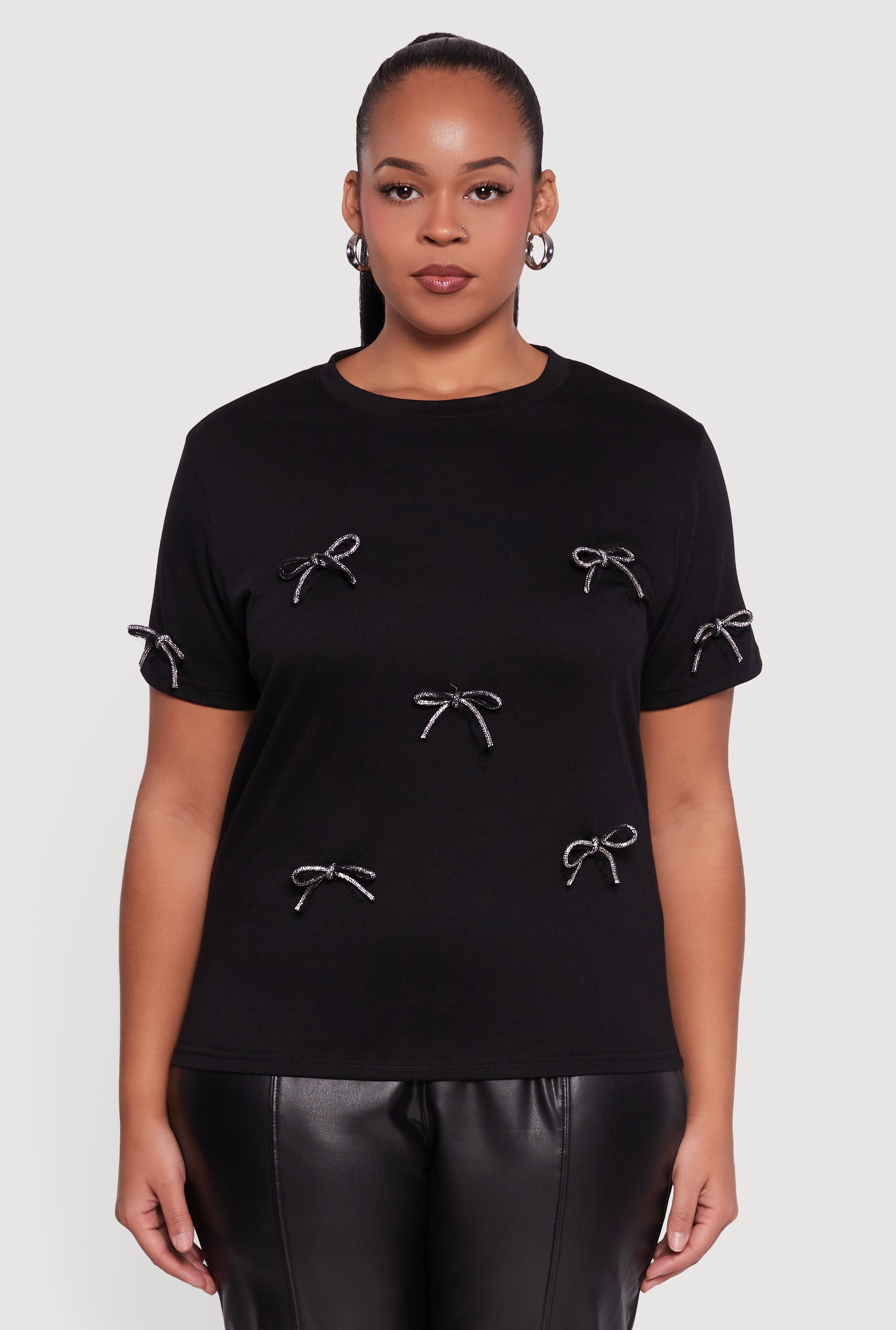 Plus Size Sheer Mesh Top with Rhinestone and Faux Pearl Bows