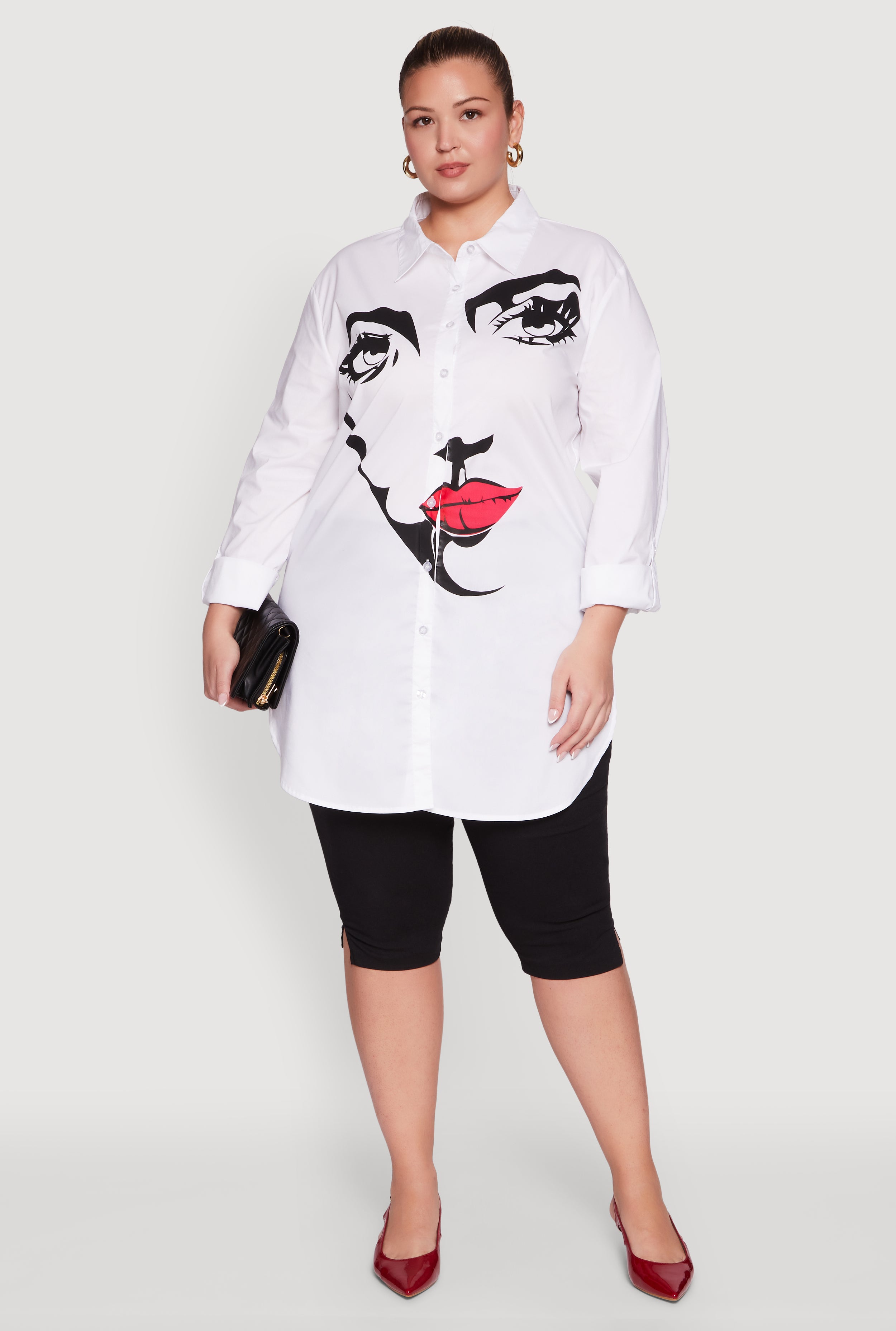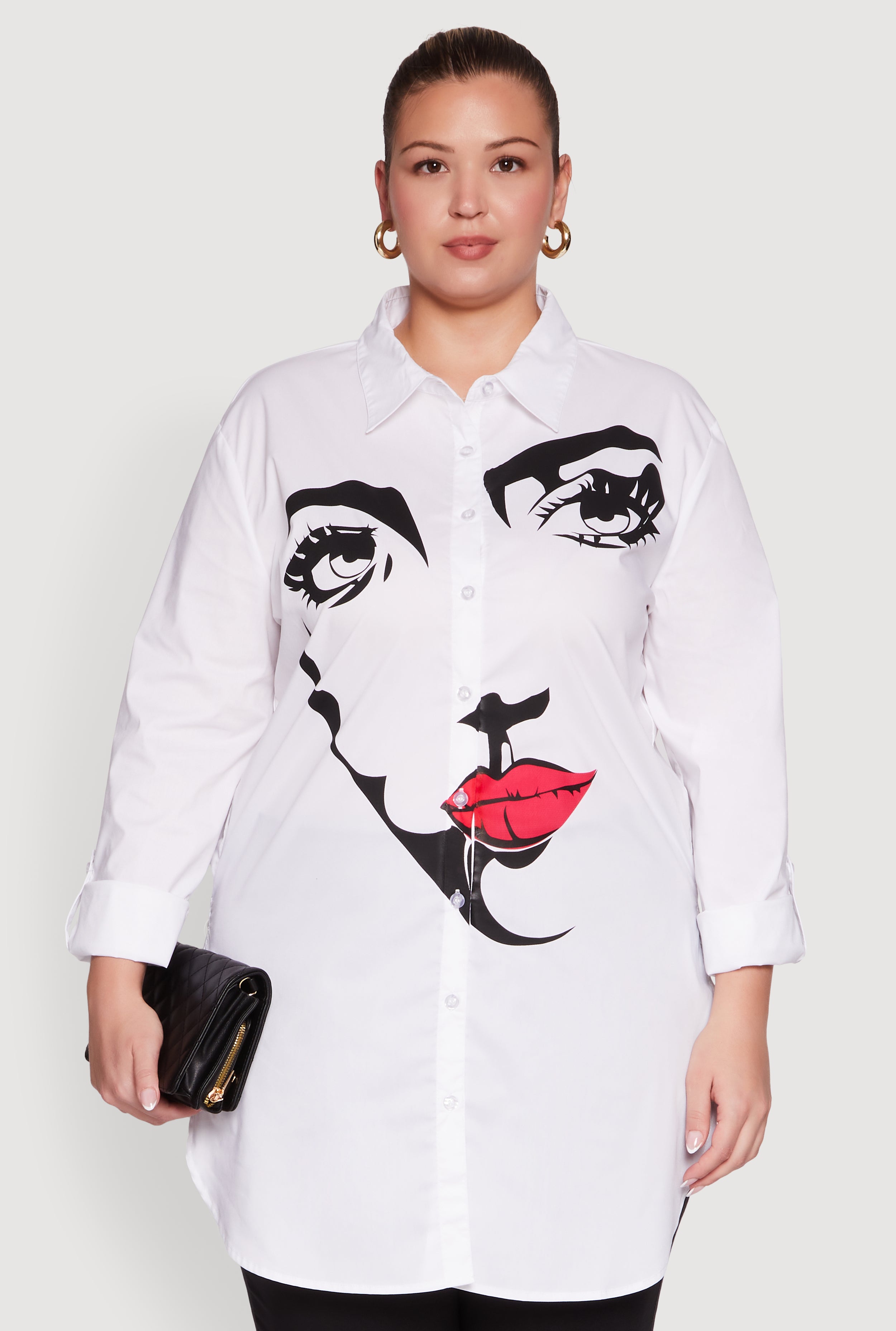 Plus Size Long Sleeve Tunic Shirt with Face Print