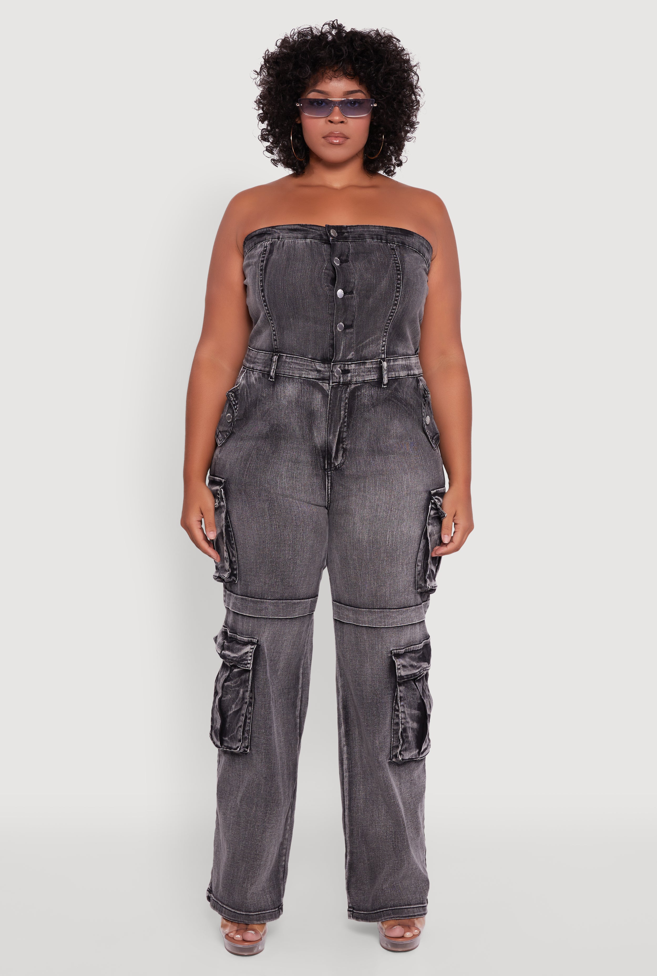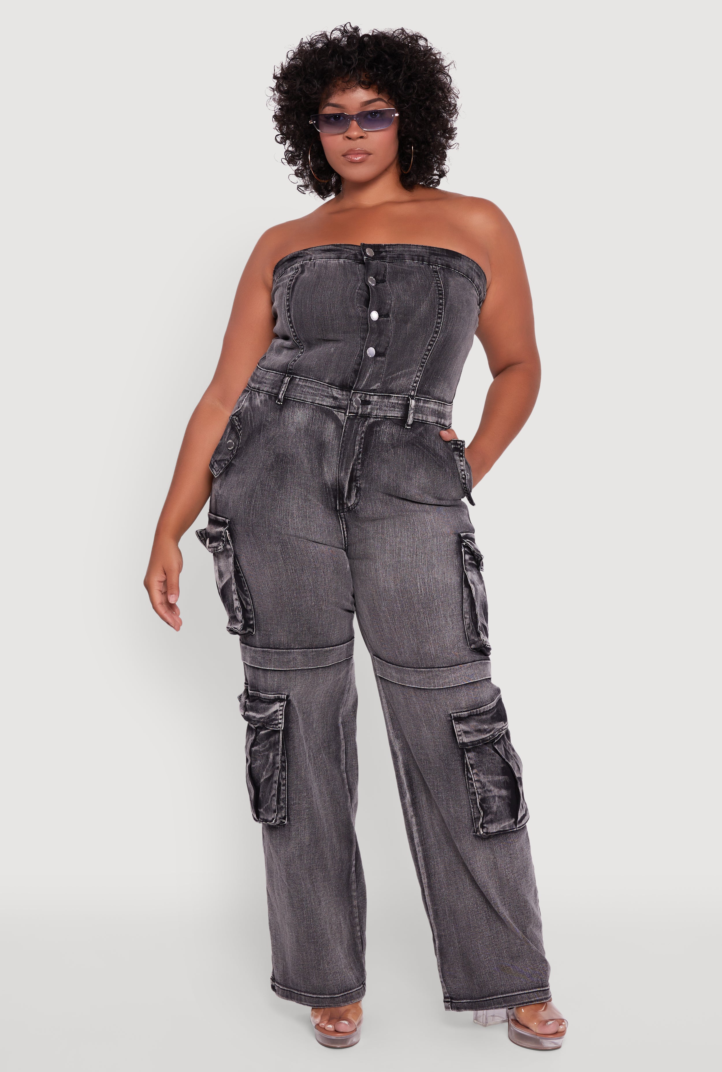 Plus Size Daisy Acid Wash Denim Strapless Jumpsuit