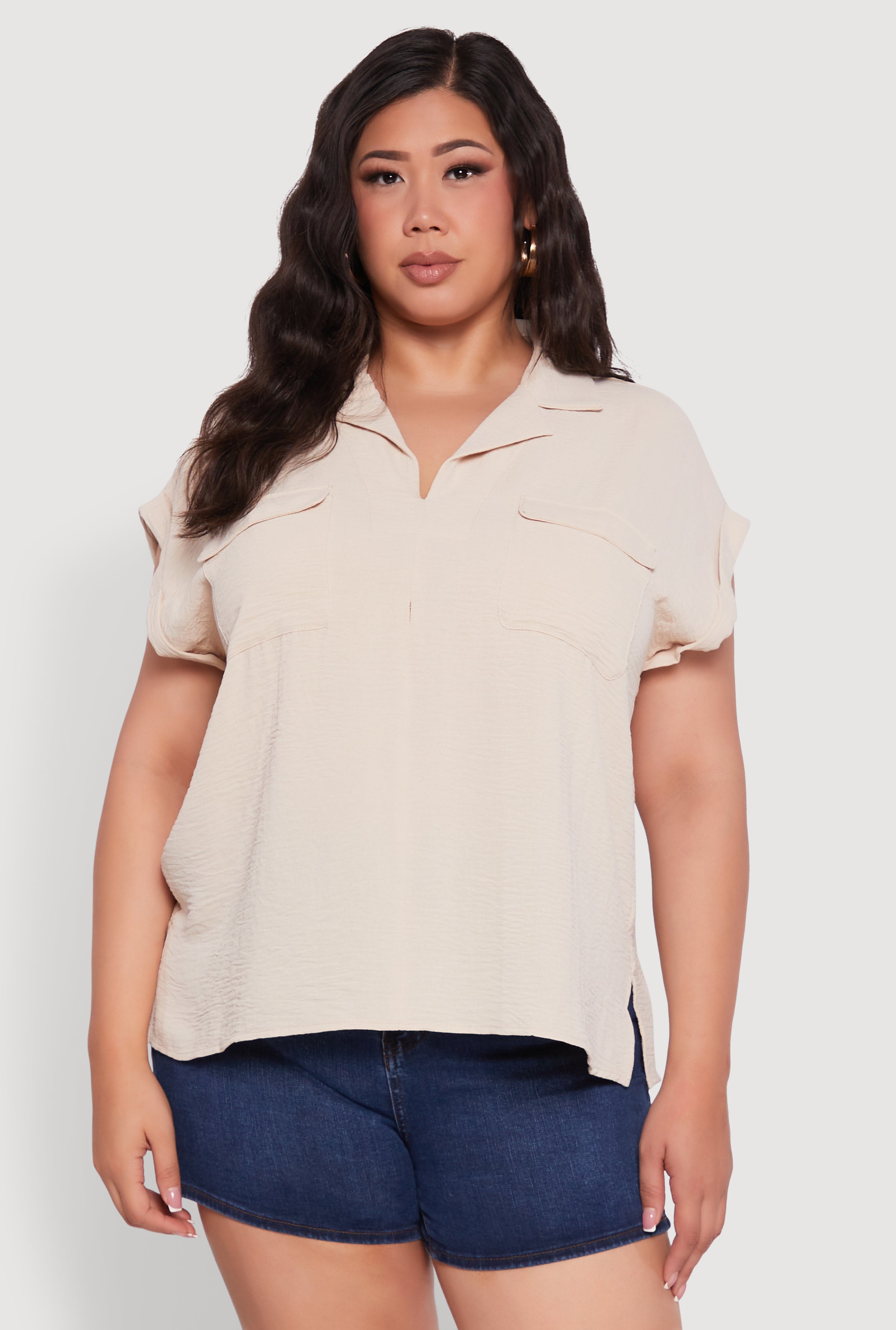 Plus Size Collared Crepe Knit Blouse with Flap Pockets