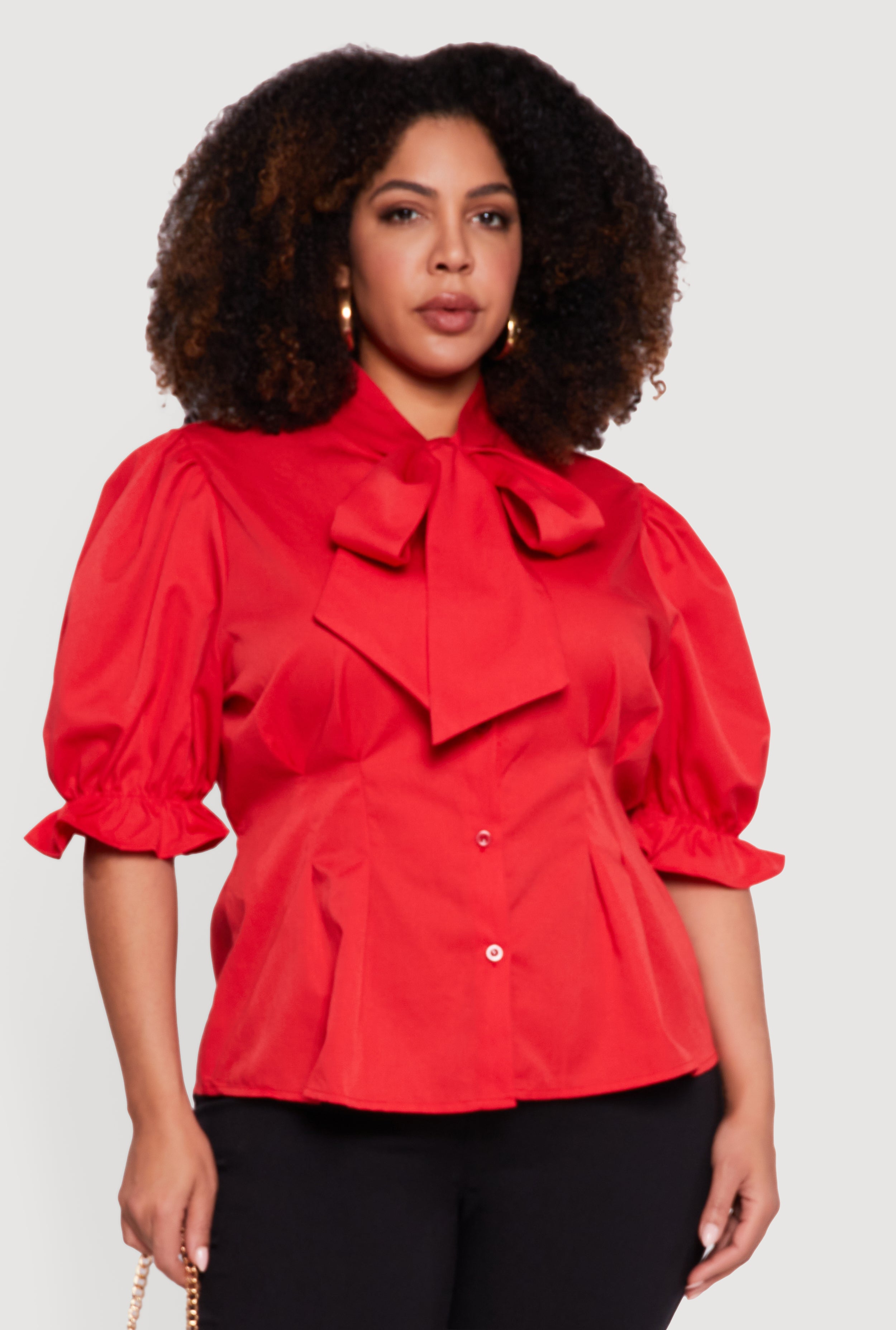 Plus Size Puff Sleeve Bow Tie Neck Blouse