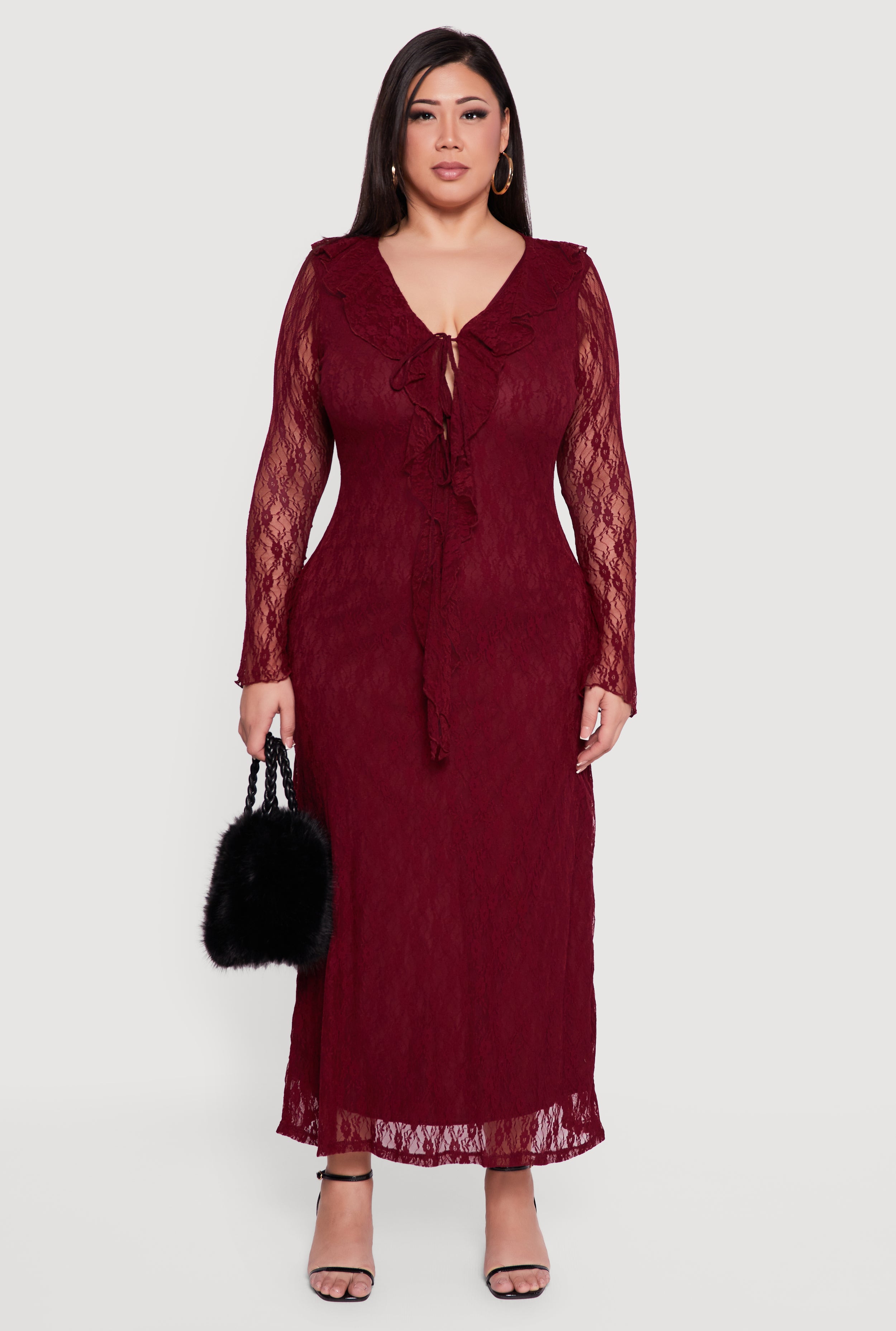 Plus Size Long Sleeve Lace Maxi Dress with Tie Front