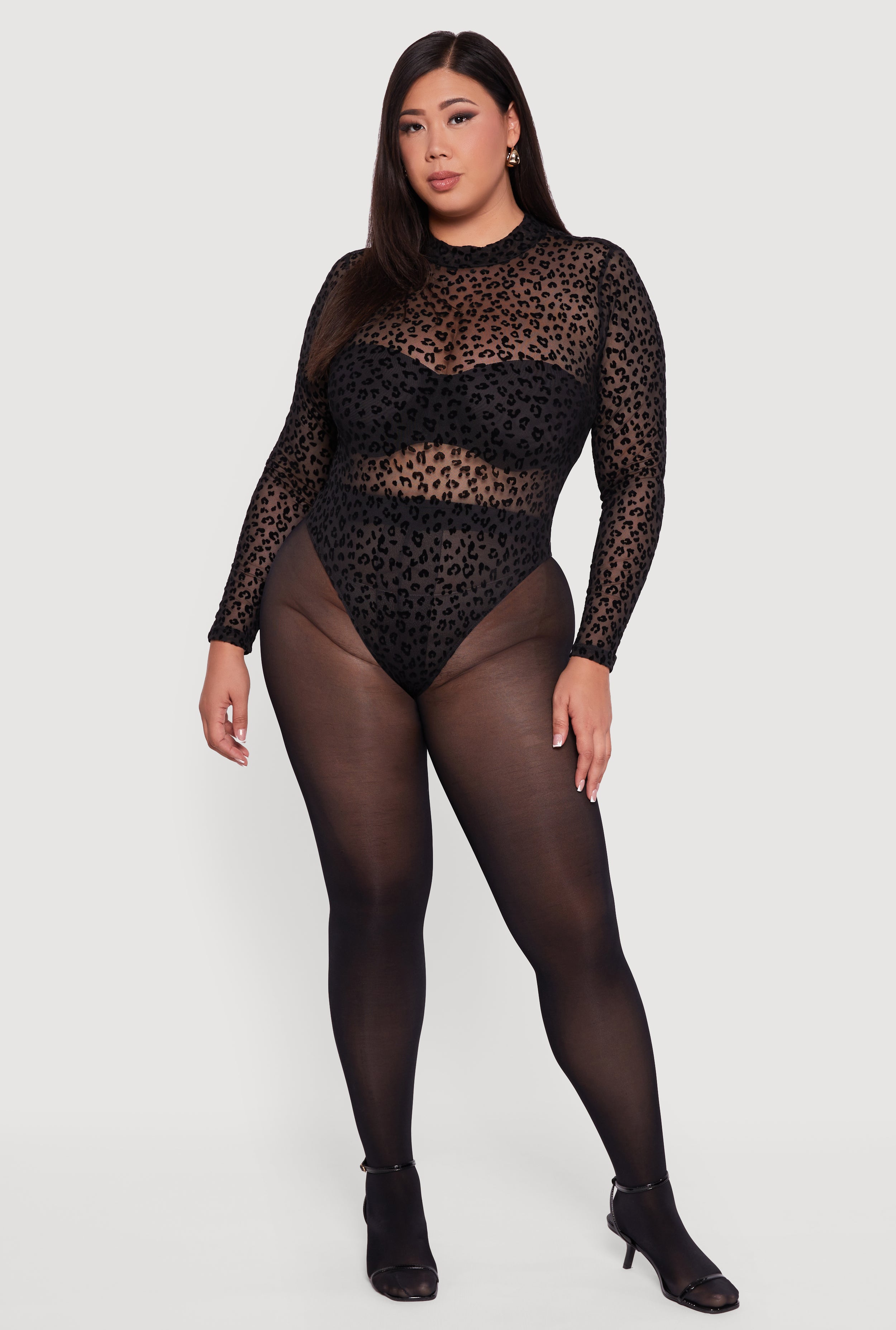Plus Size Leopard Print Velvet Burnout Mock Neck Bodysuit