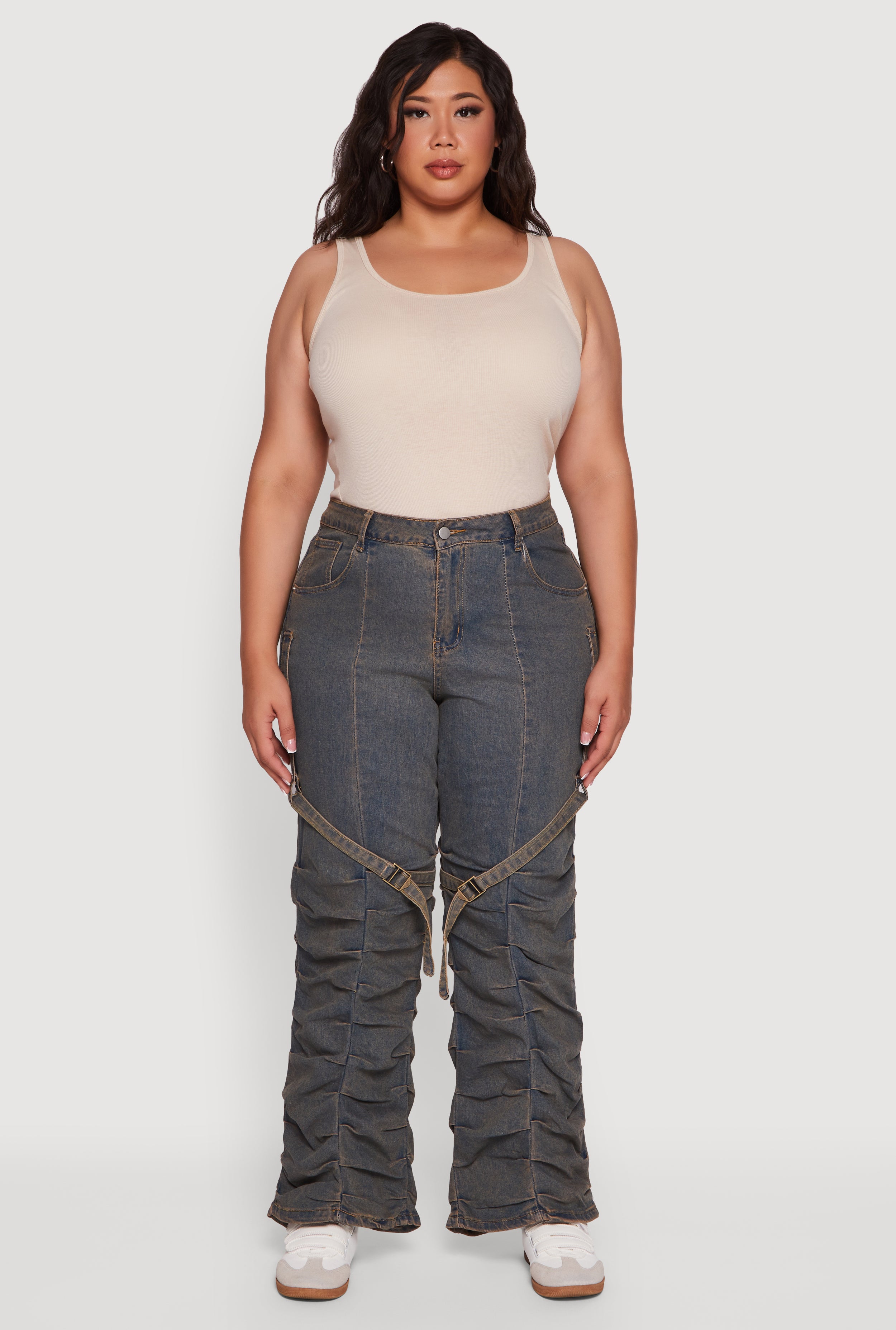 Plus Size High Waisted Wide Leg Stacked Jeans with Buckles